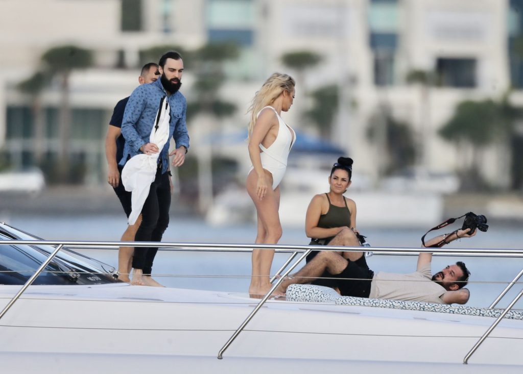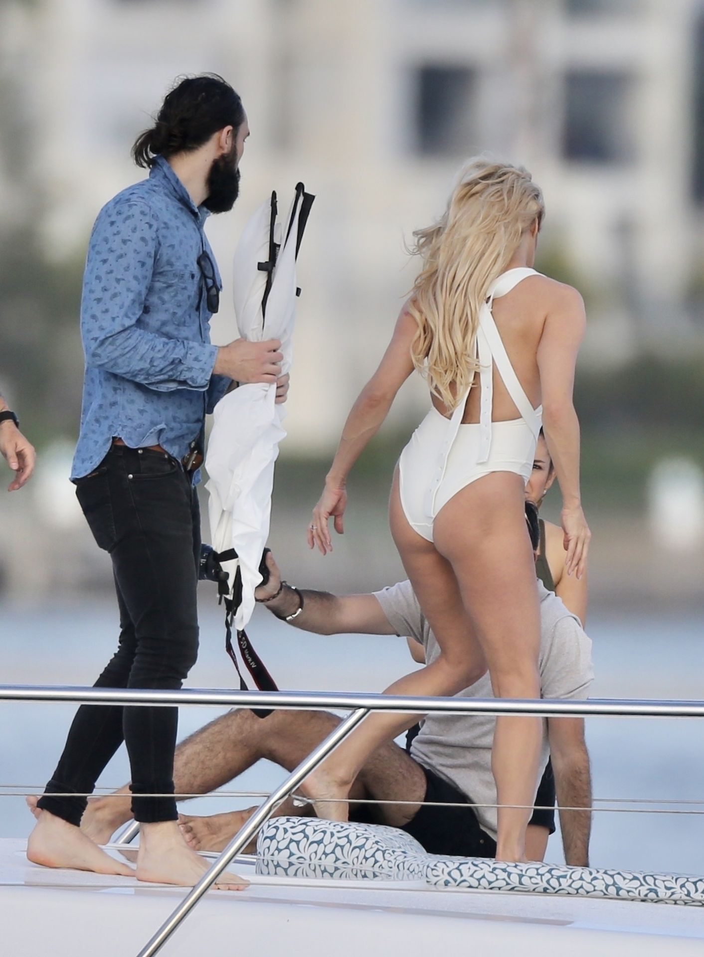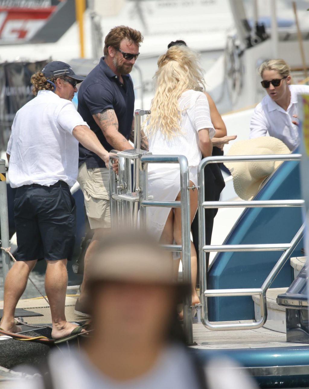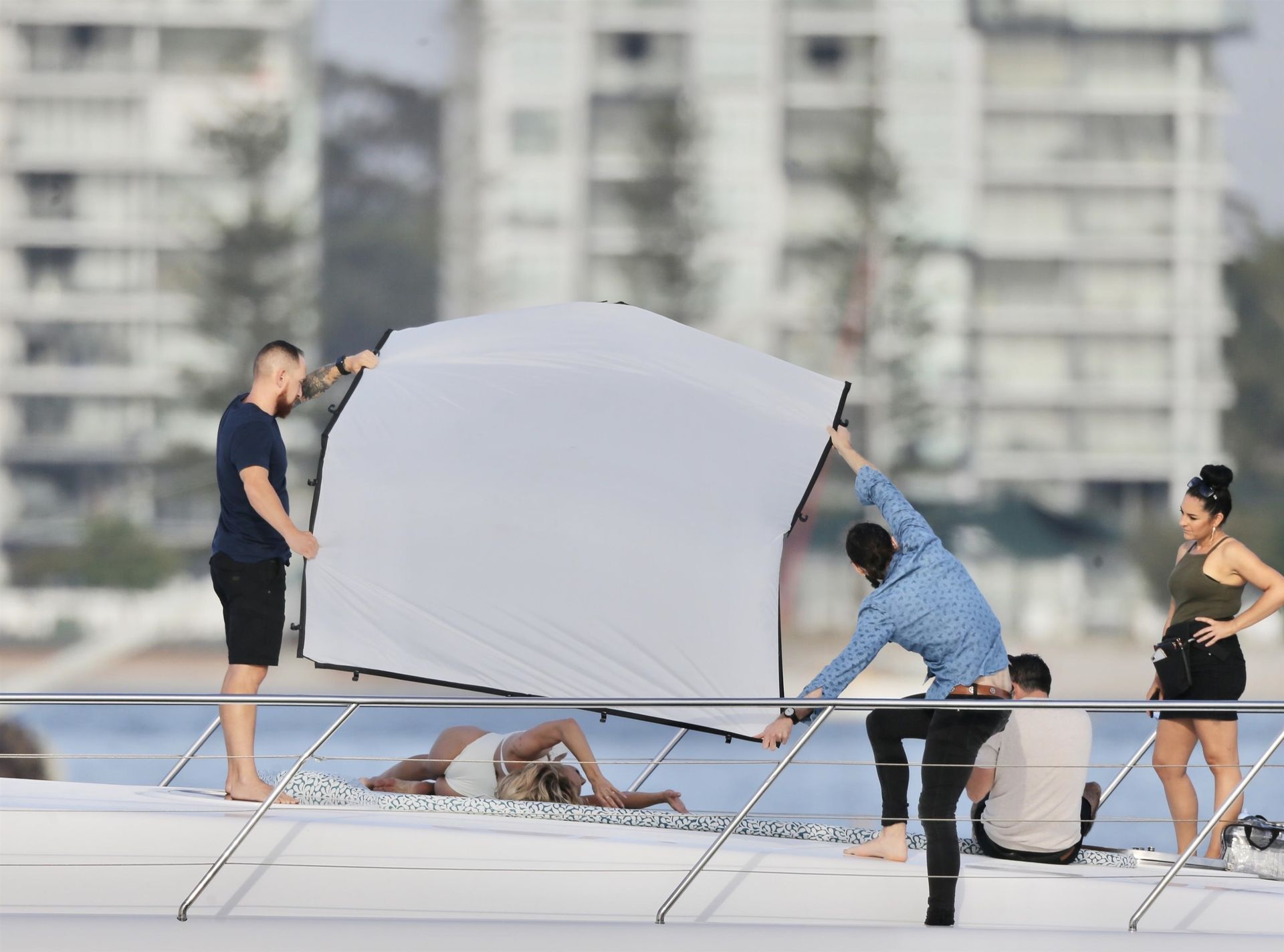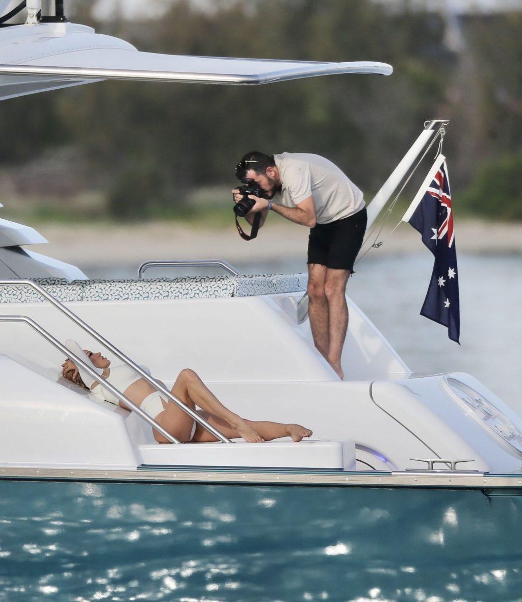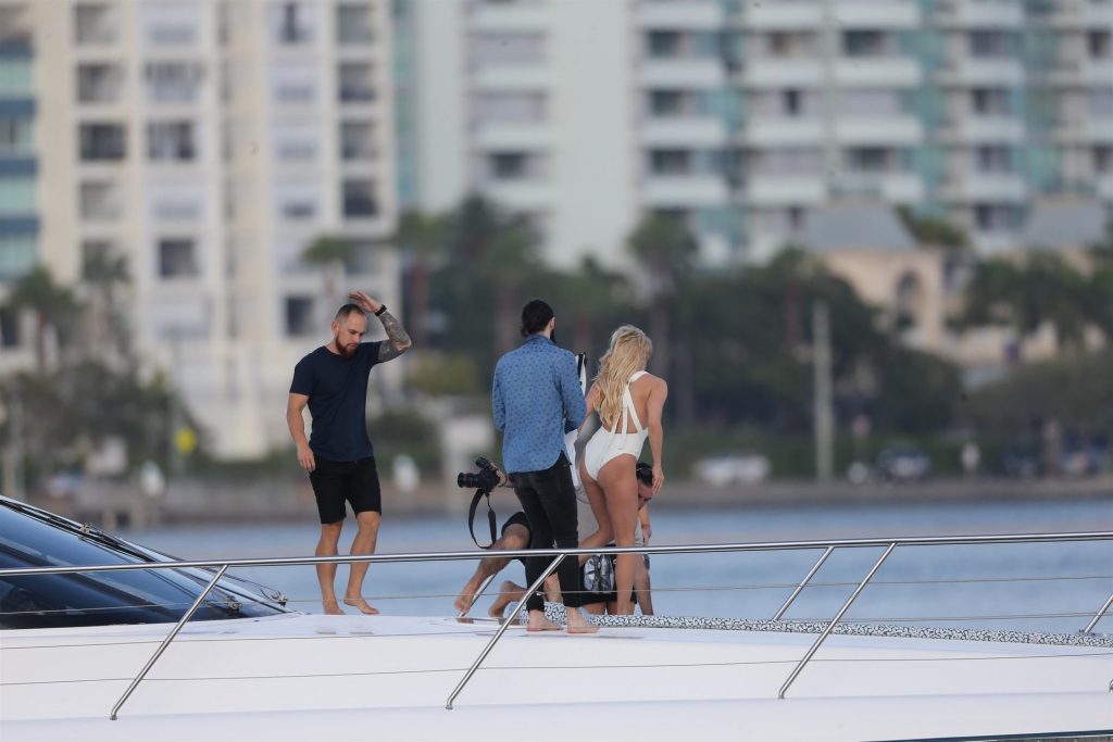 Pamela Anderson con busto posa en un traje de baño blanco en un yate para una sesión de fotos en la Costa Dorada, Australia, 27/11/2019. Han pasado 30 años desde que se estrenó “Baywatch”, pero Pamela todavía se asocia con la valiente y atractiva salvavidas C.J. Parker. ¡La abuela del Fappening luce bien hoy!