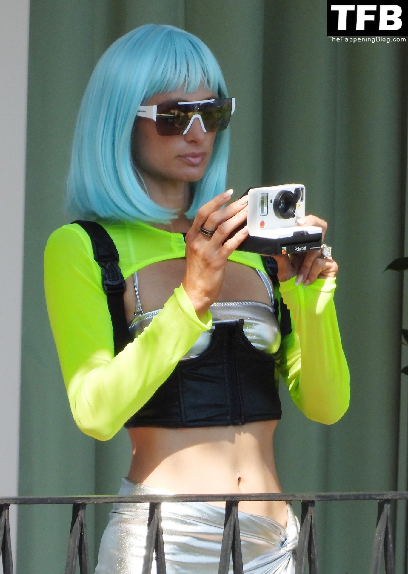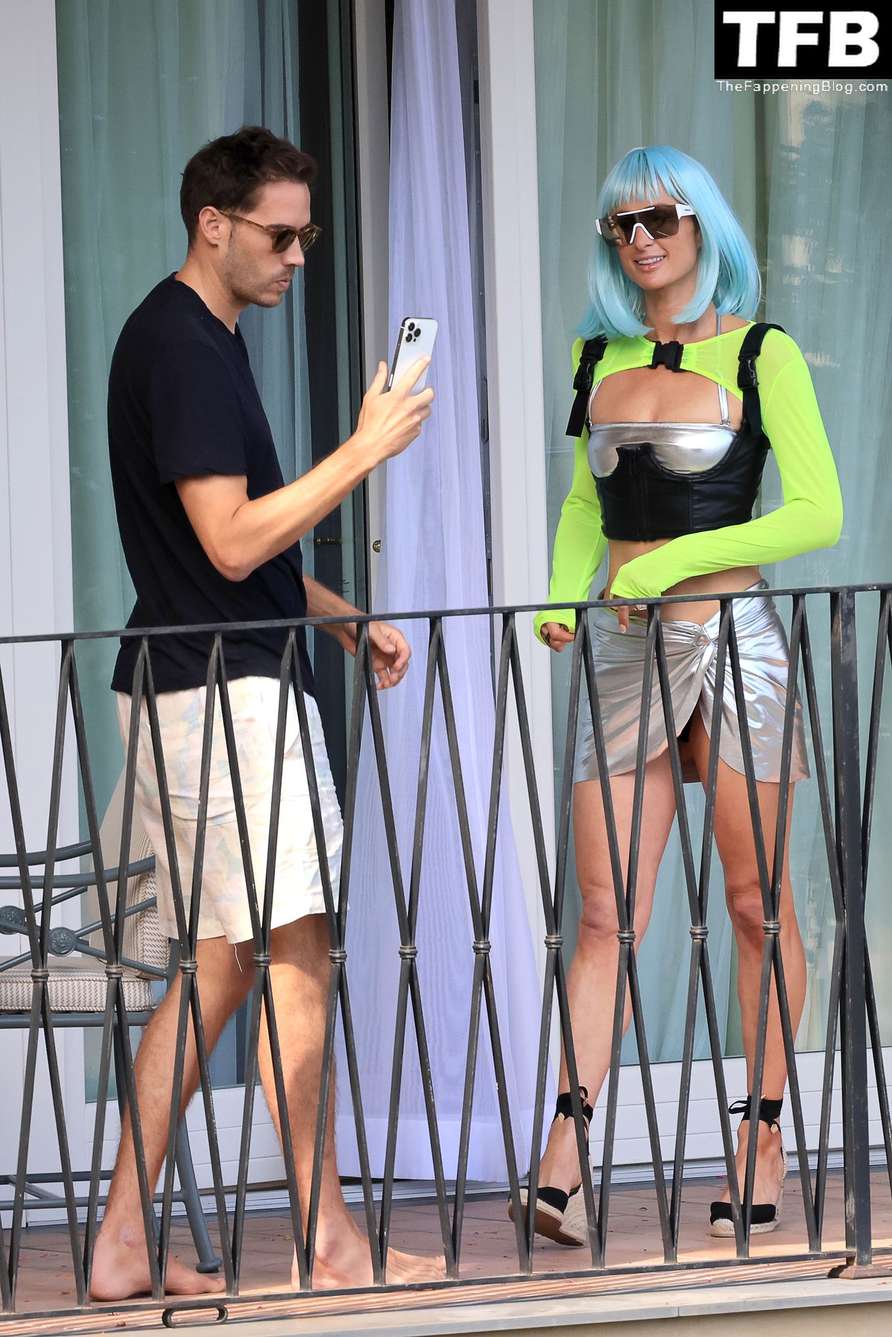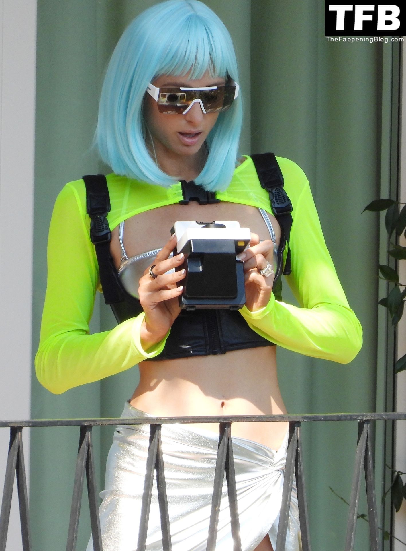 La estrella de The Fappening Paris Hilton es vista posando para su esposo Carter Reum en un bikini plateado, con una peluca azul en el balcón de la habitación del hotel en Portofino, 08/07/0222.