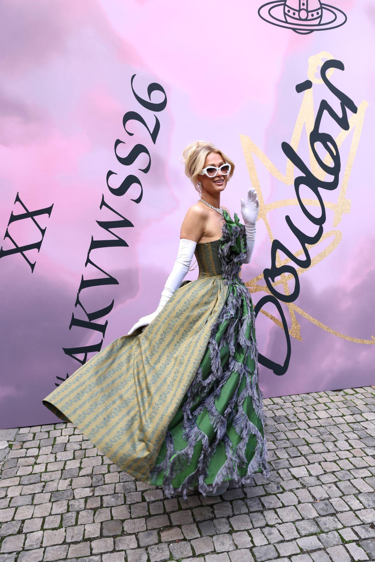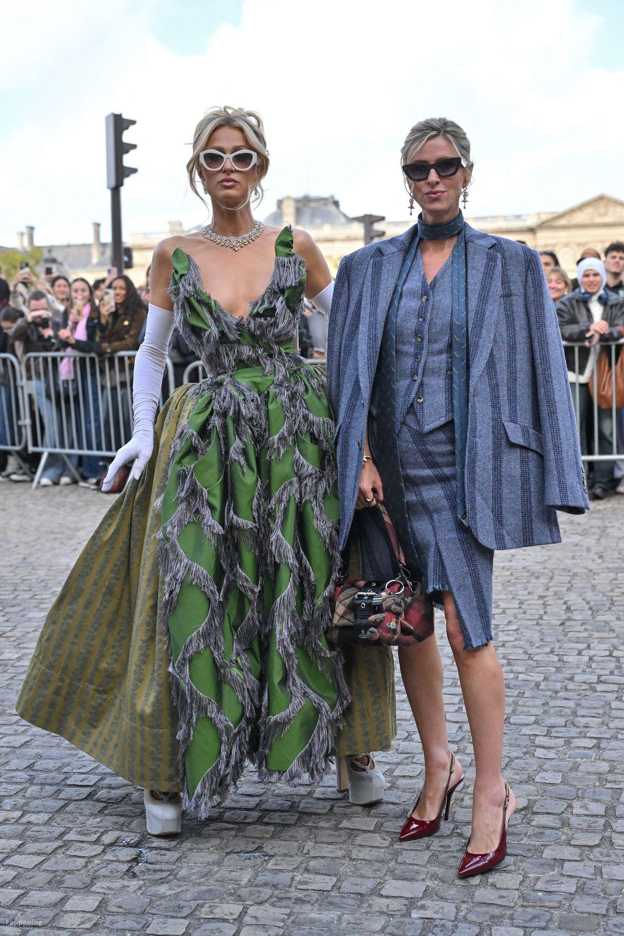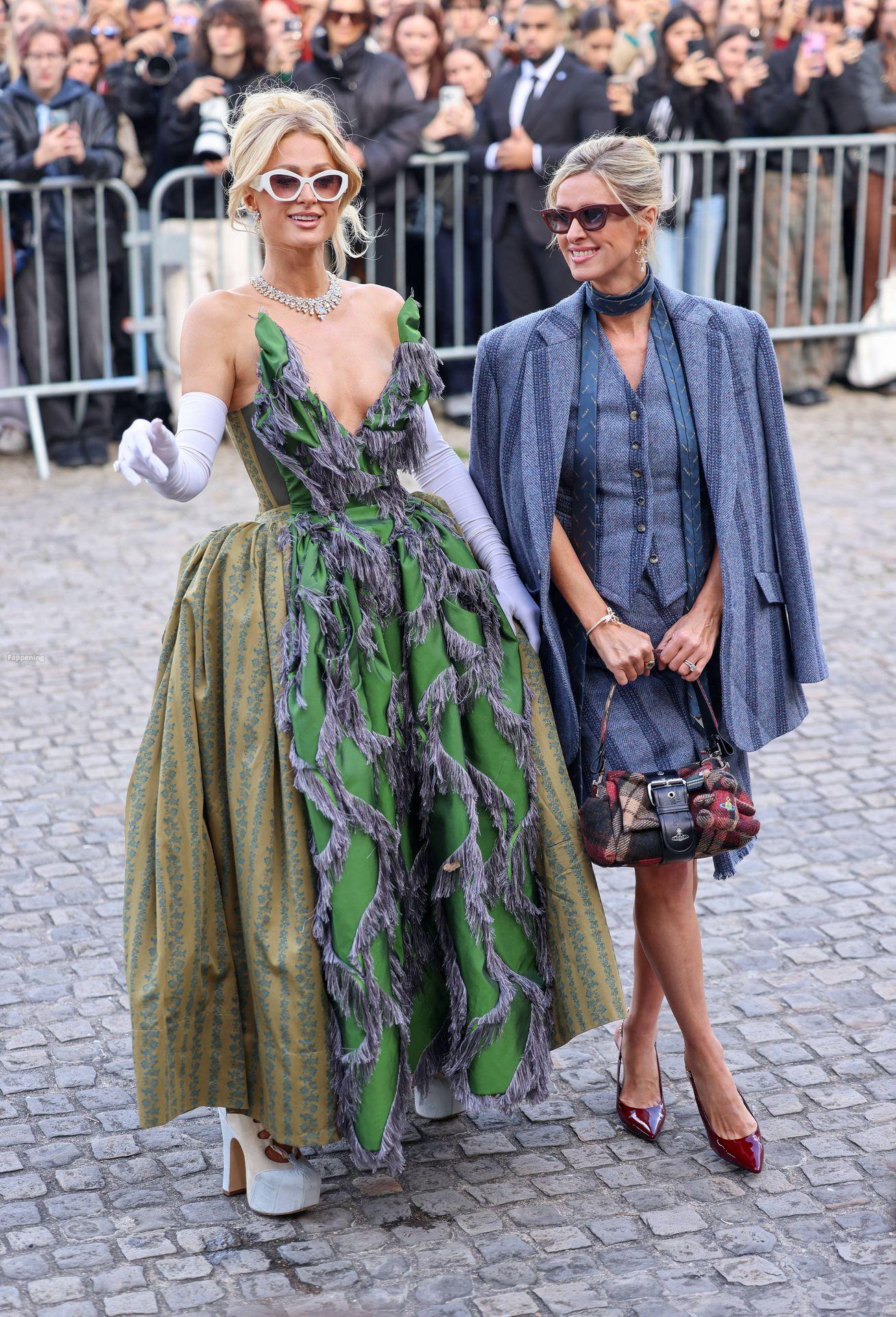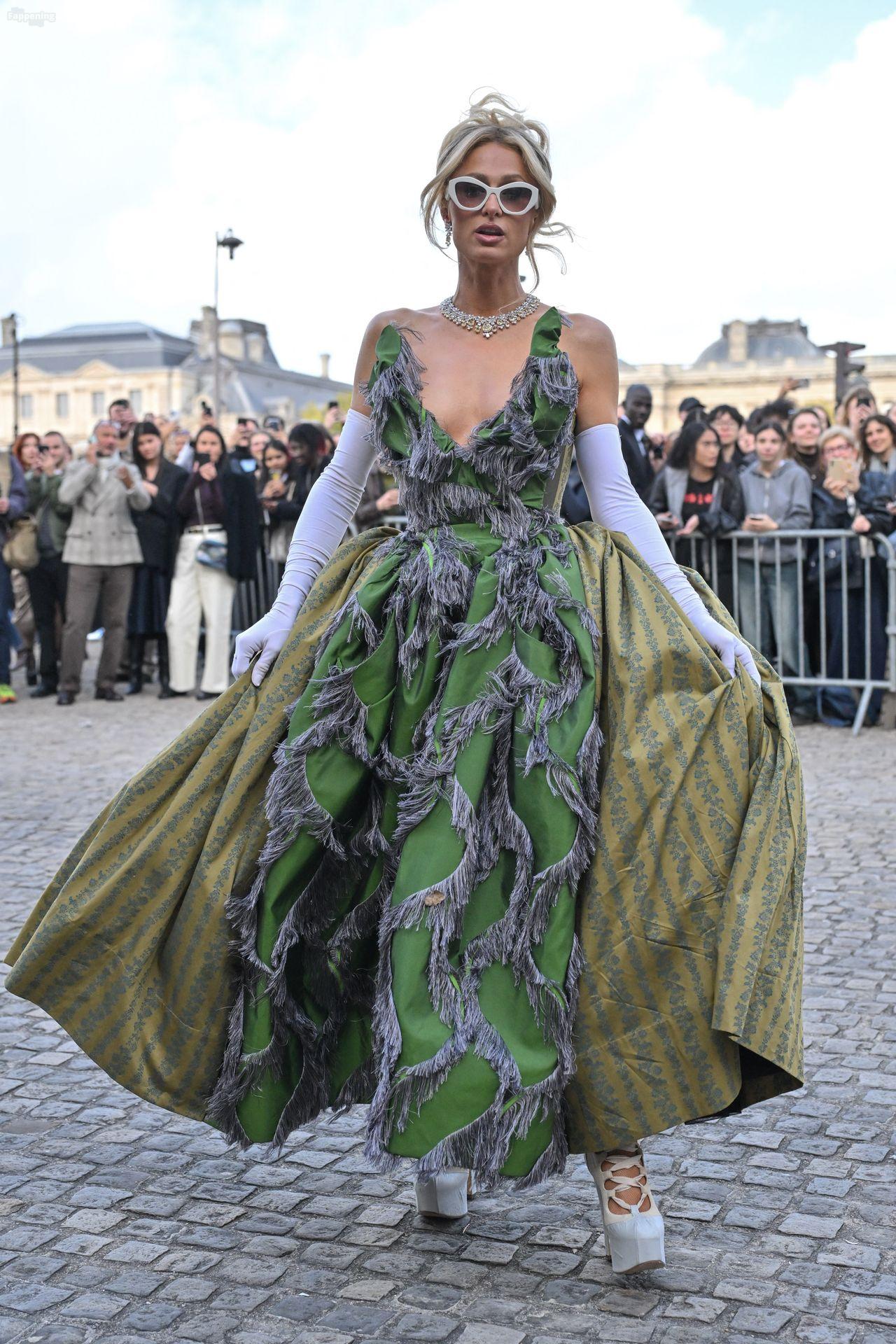 Paris Hilton dominó la Semana de la Moda de París, luciendo un vestido verde de Vivienne Westwood con un escote pronunciado que mostraba su escote.