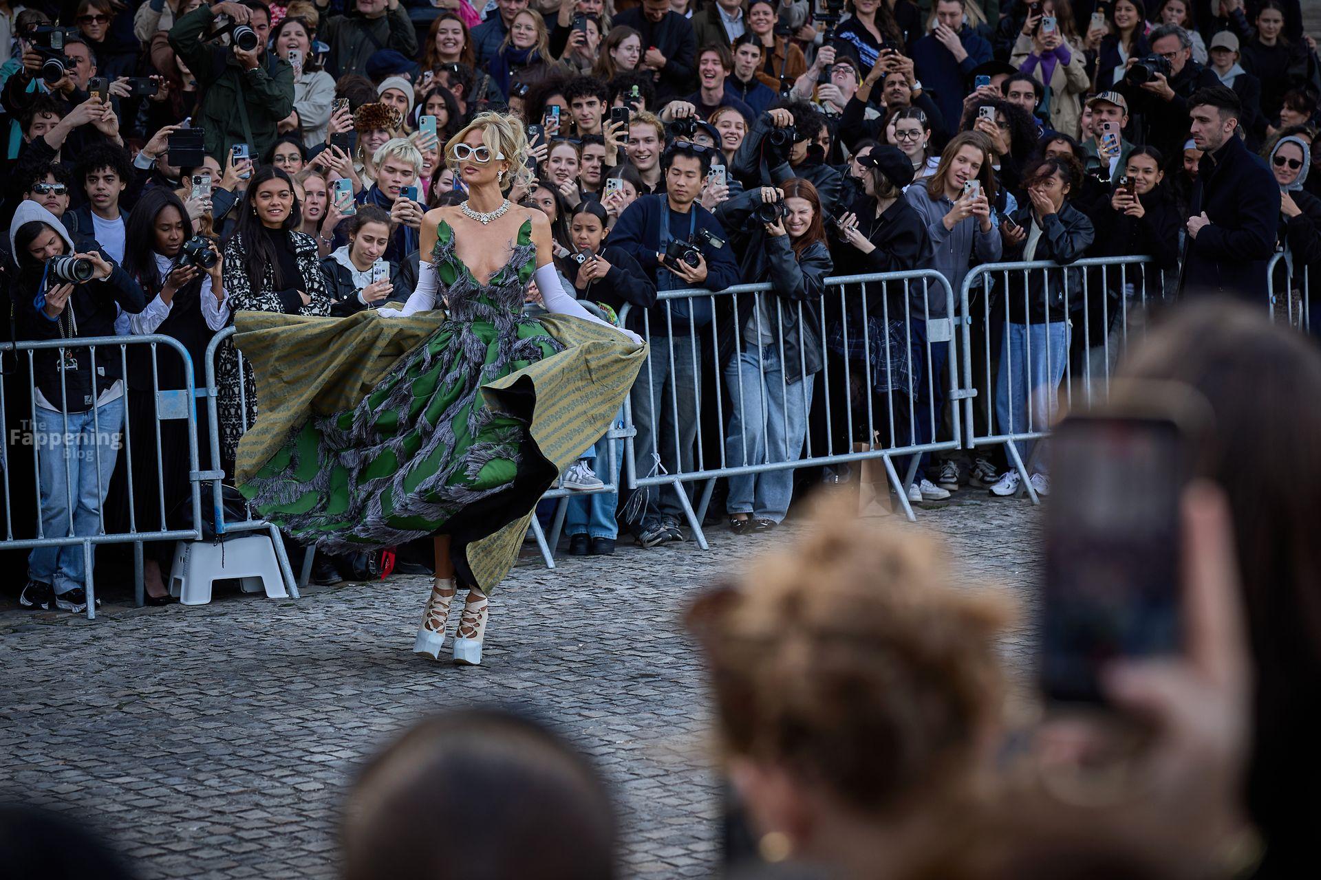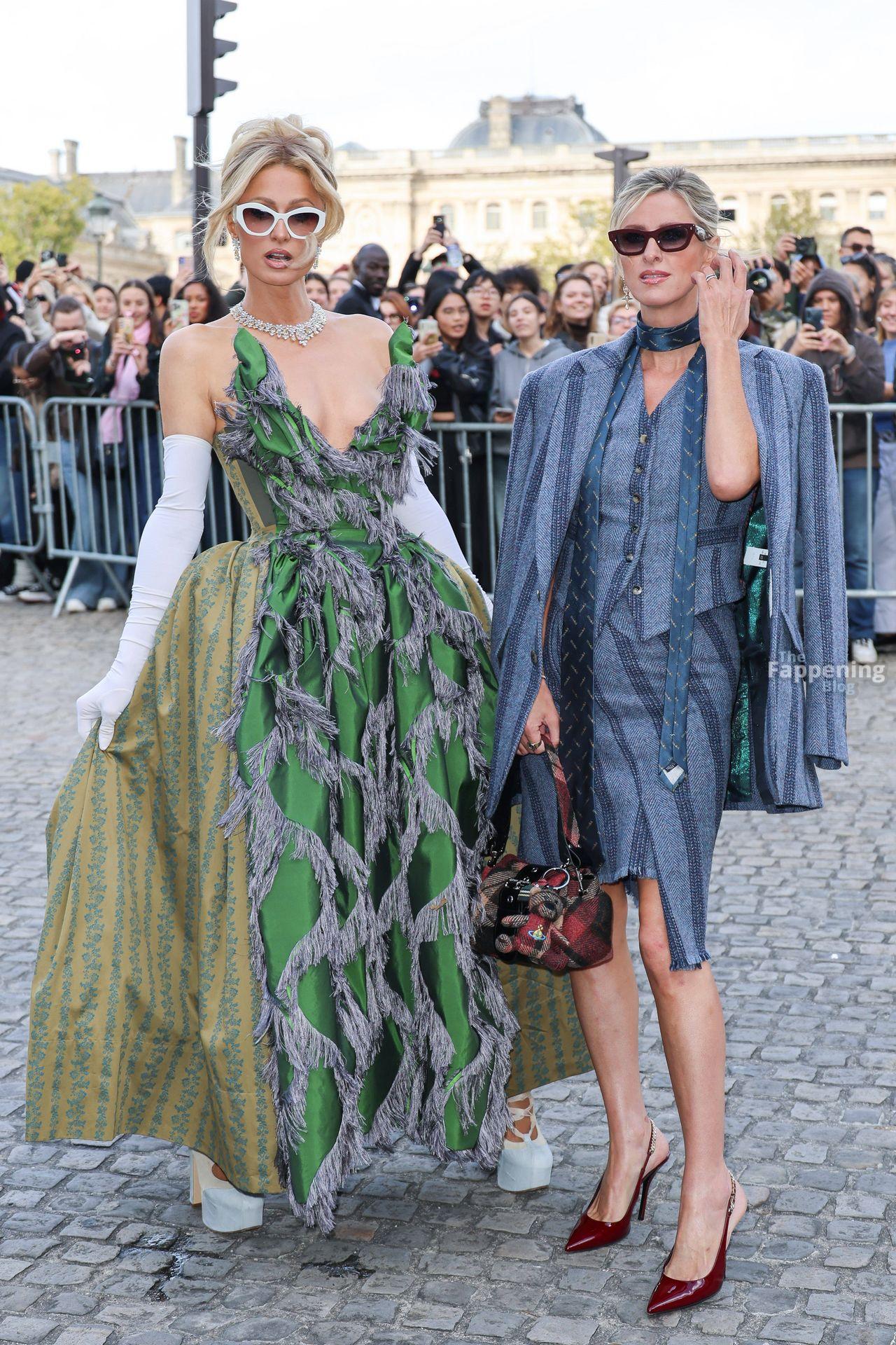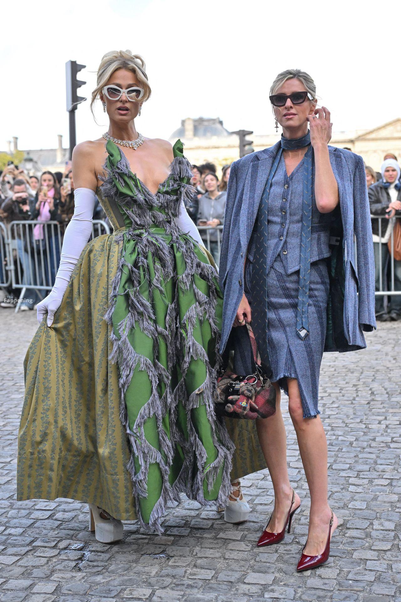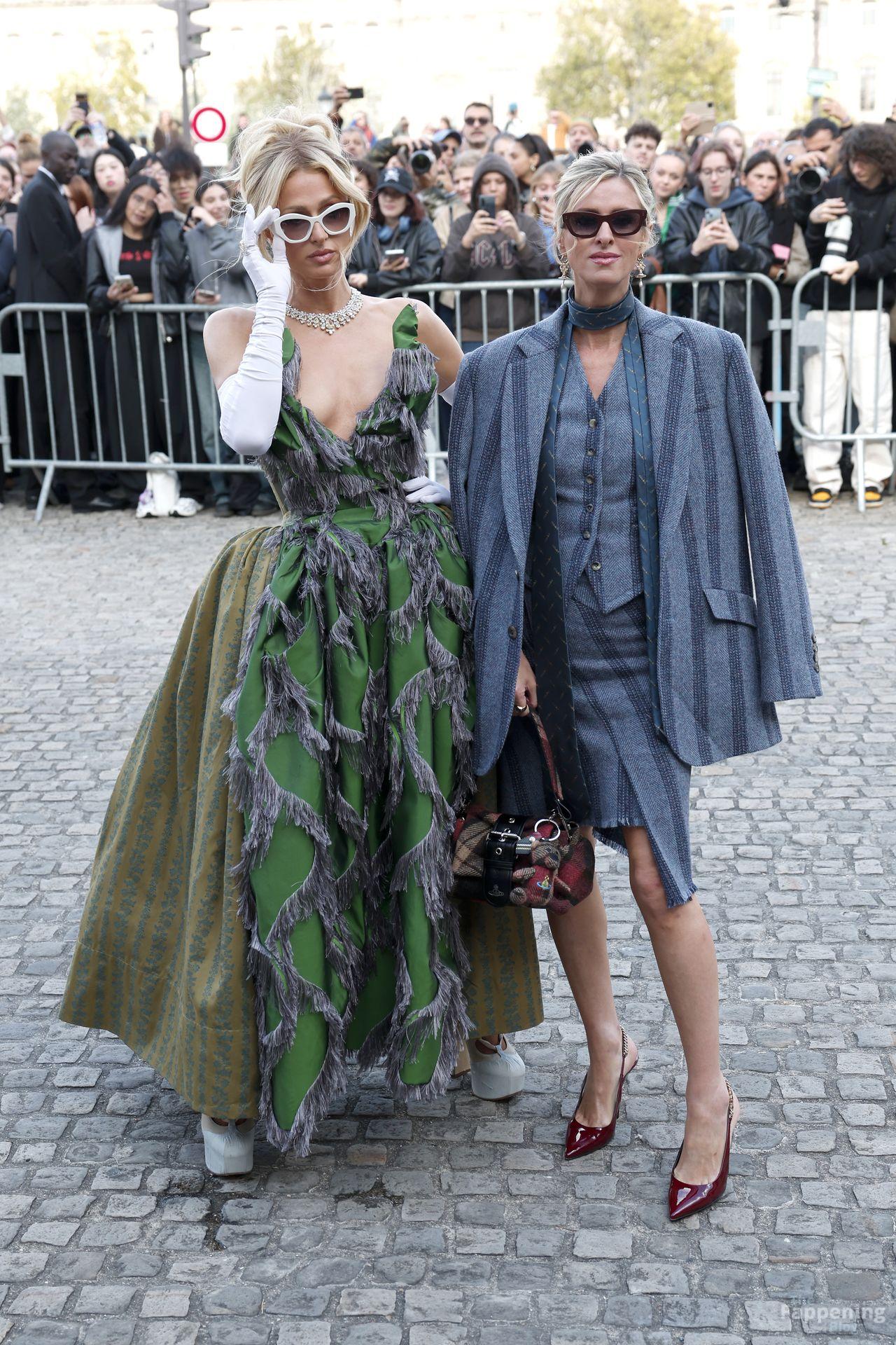 Paris Hilton dominó la Semana de la Moda de París, luciendo un vestido verde de Vivienne Westwood con un escote pronunciado que mostraba su escote.