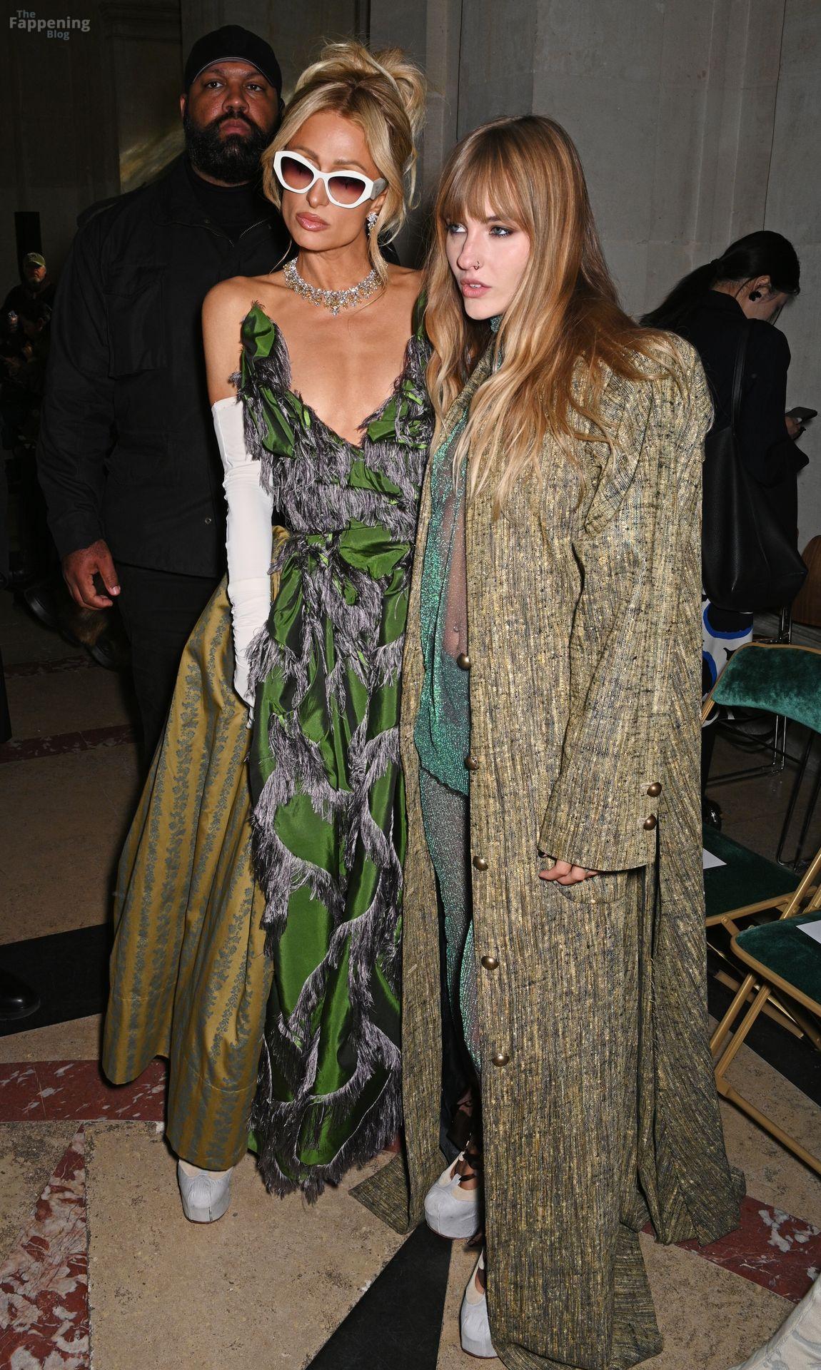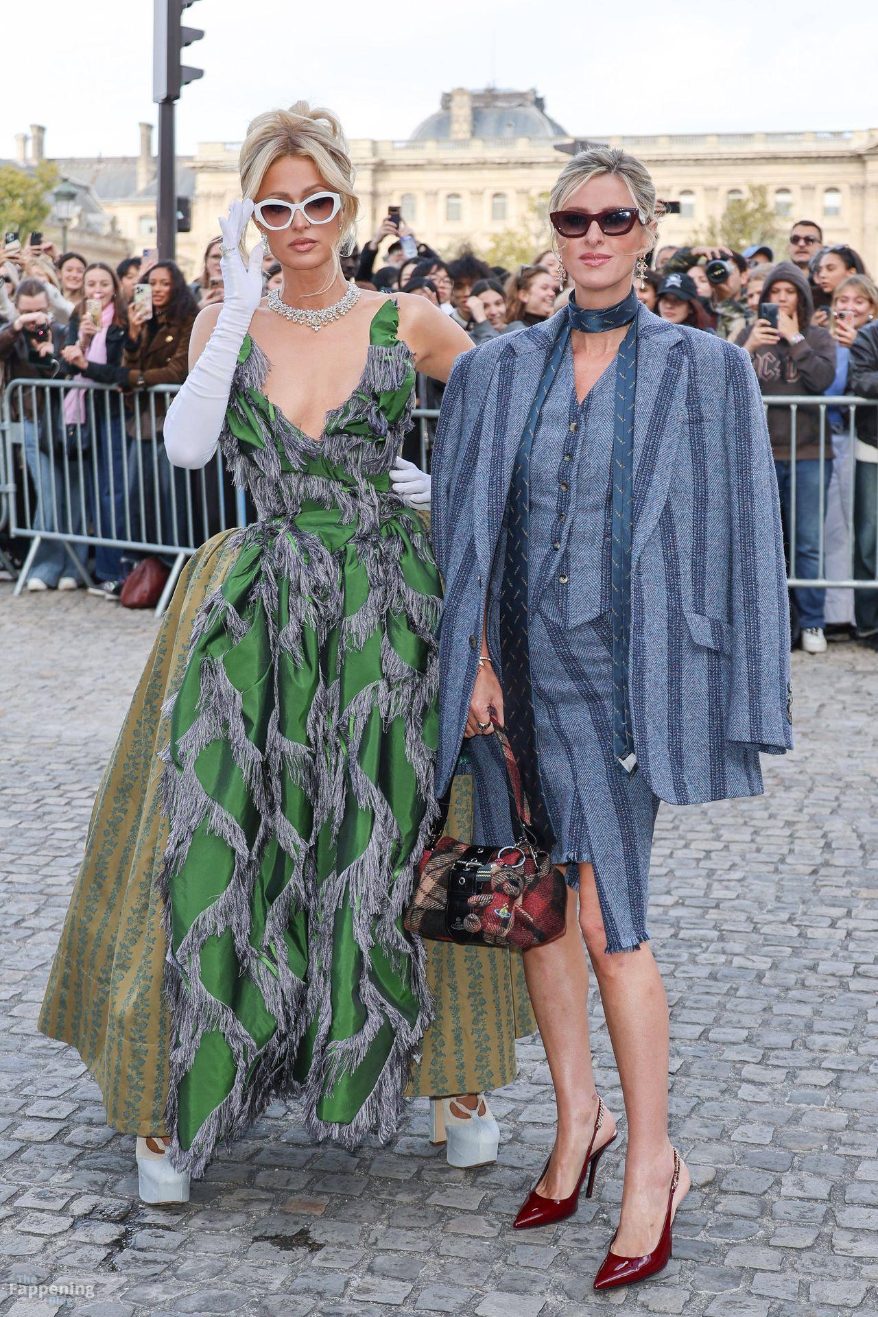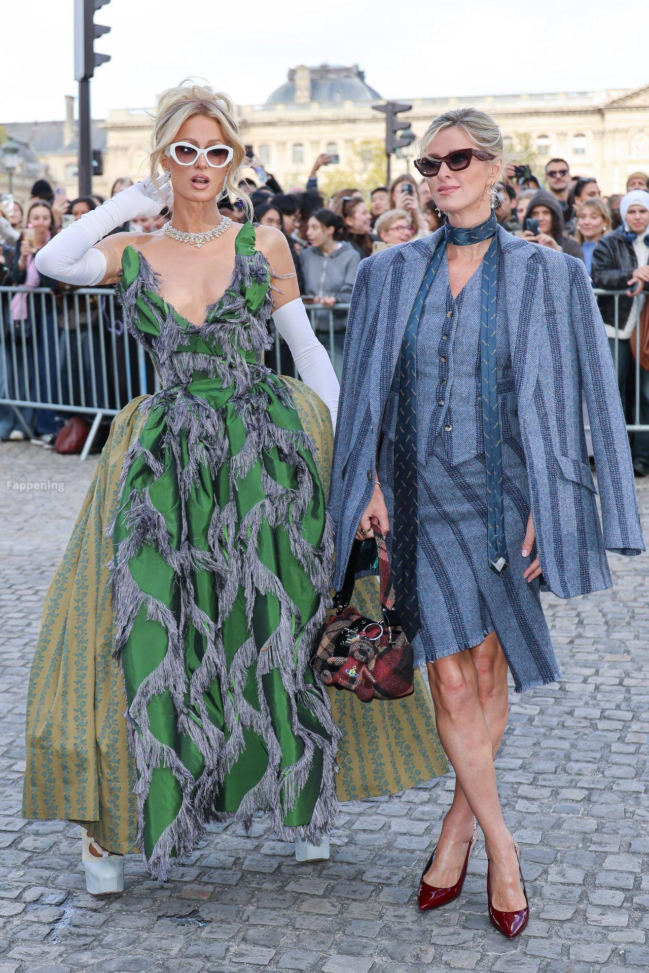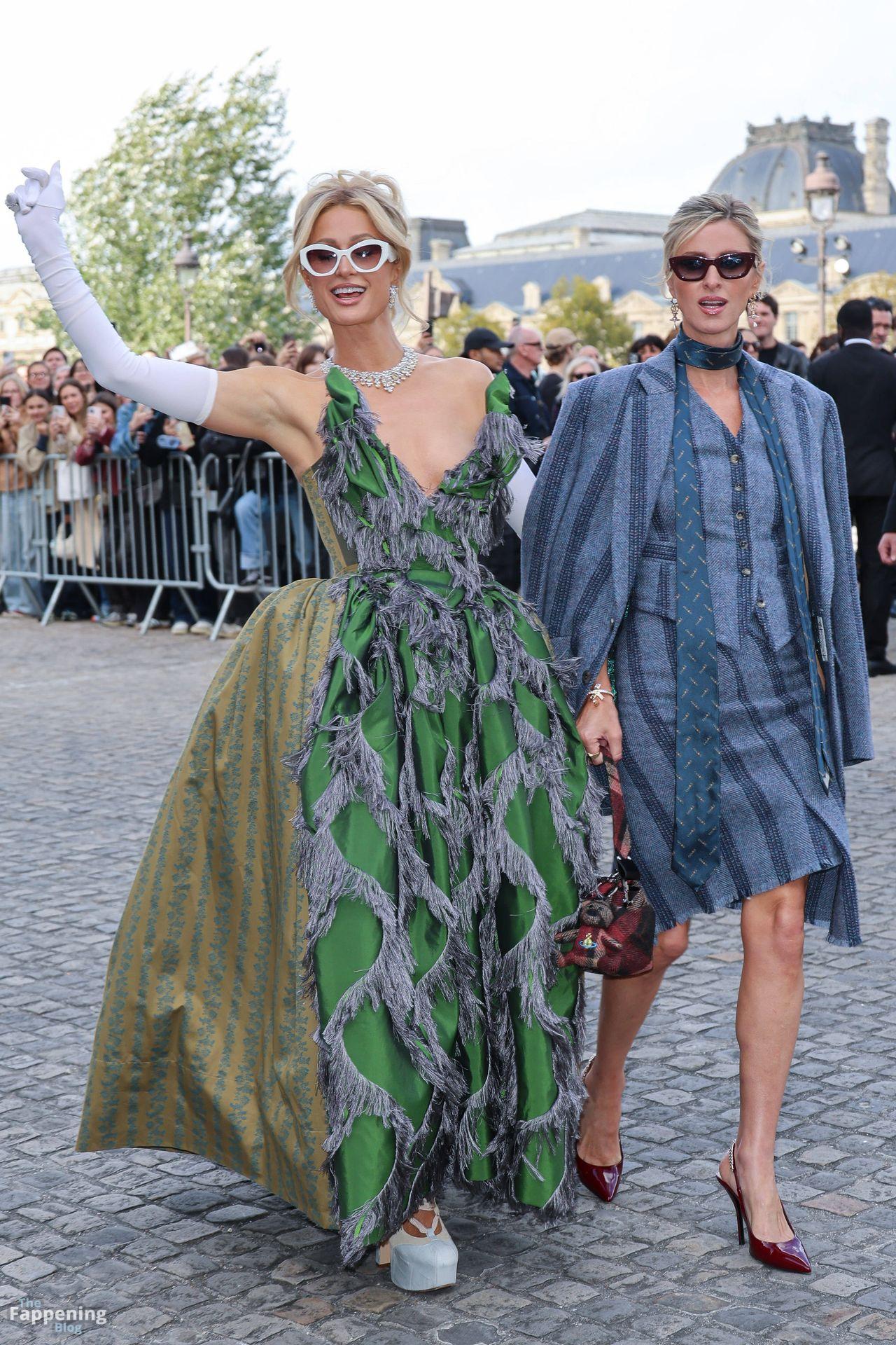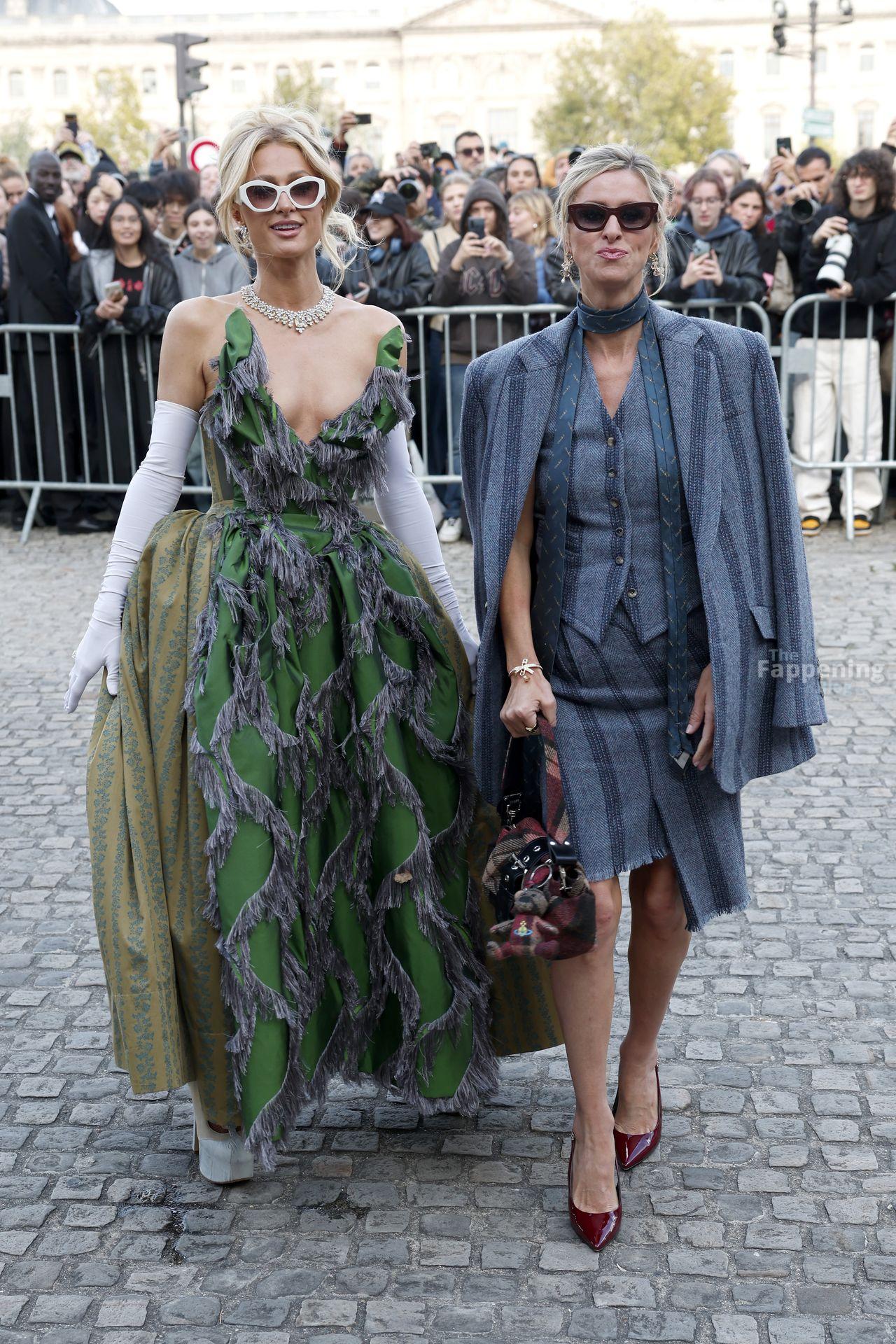 Paris Hilton dominó la Semana de la Moda de París, luciendo un vestido verde de Vivienne Westwood con un escote pronunciado que mostraba su escote.