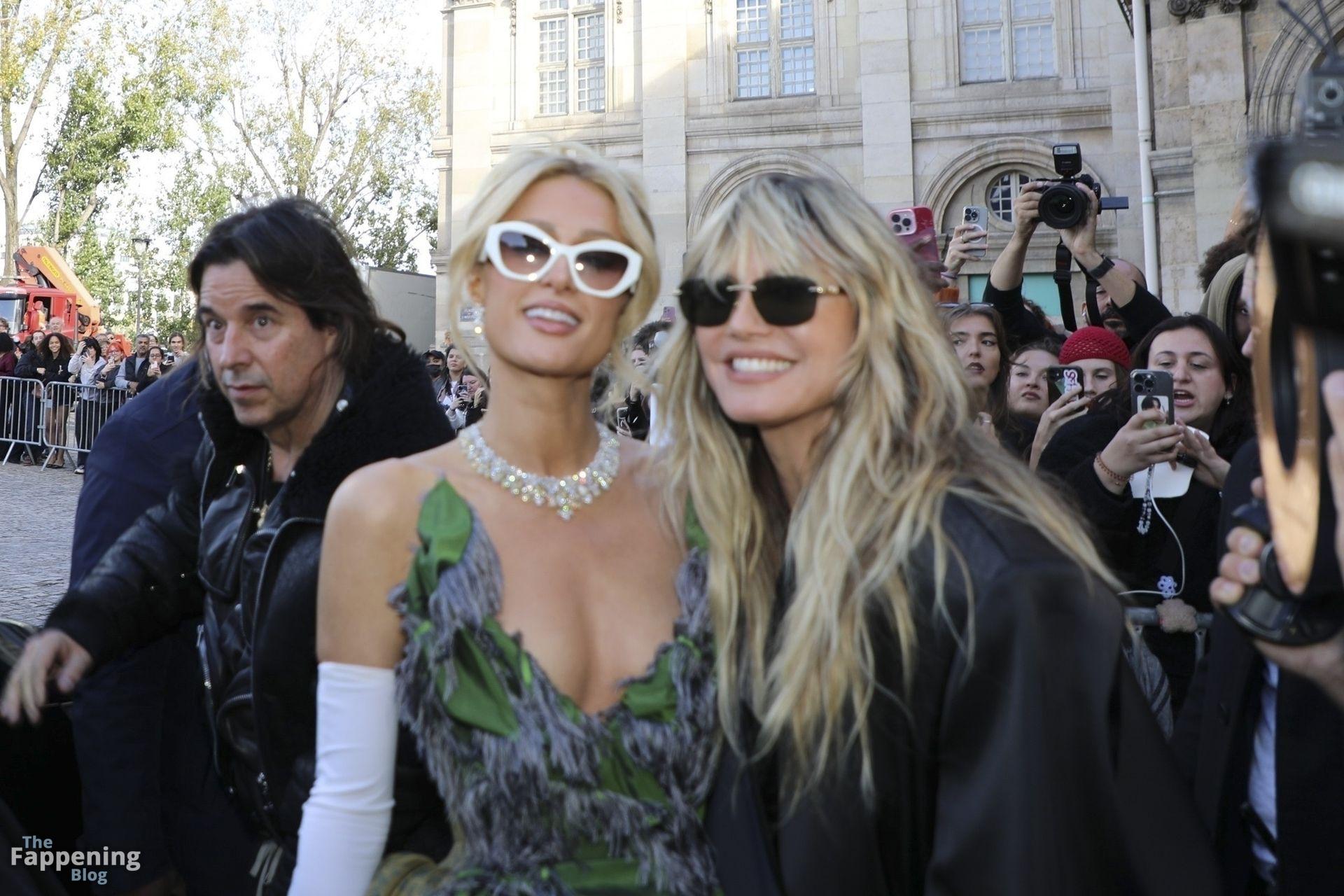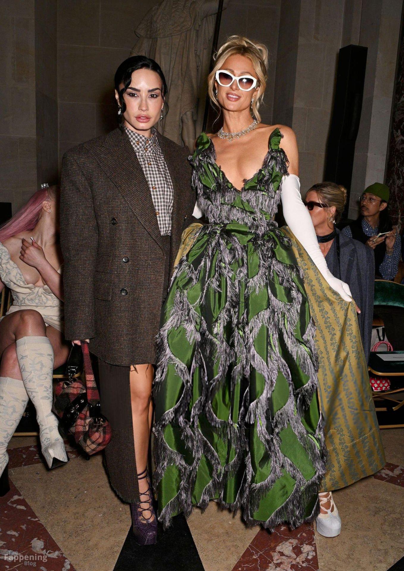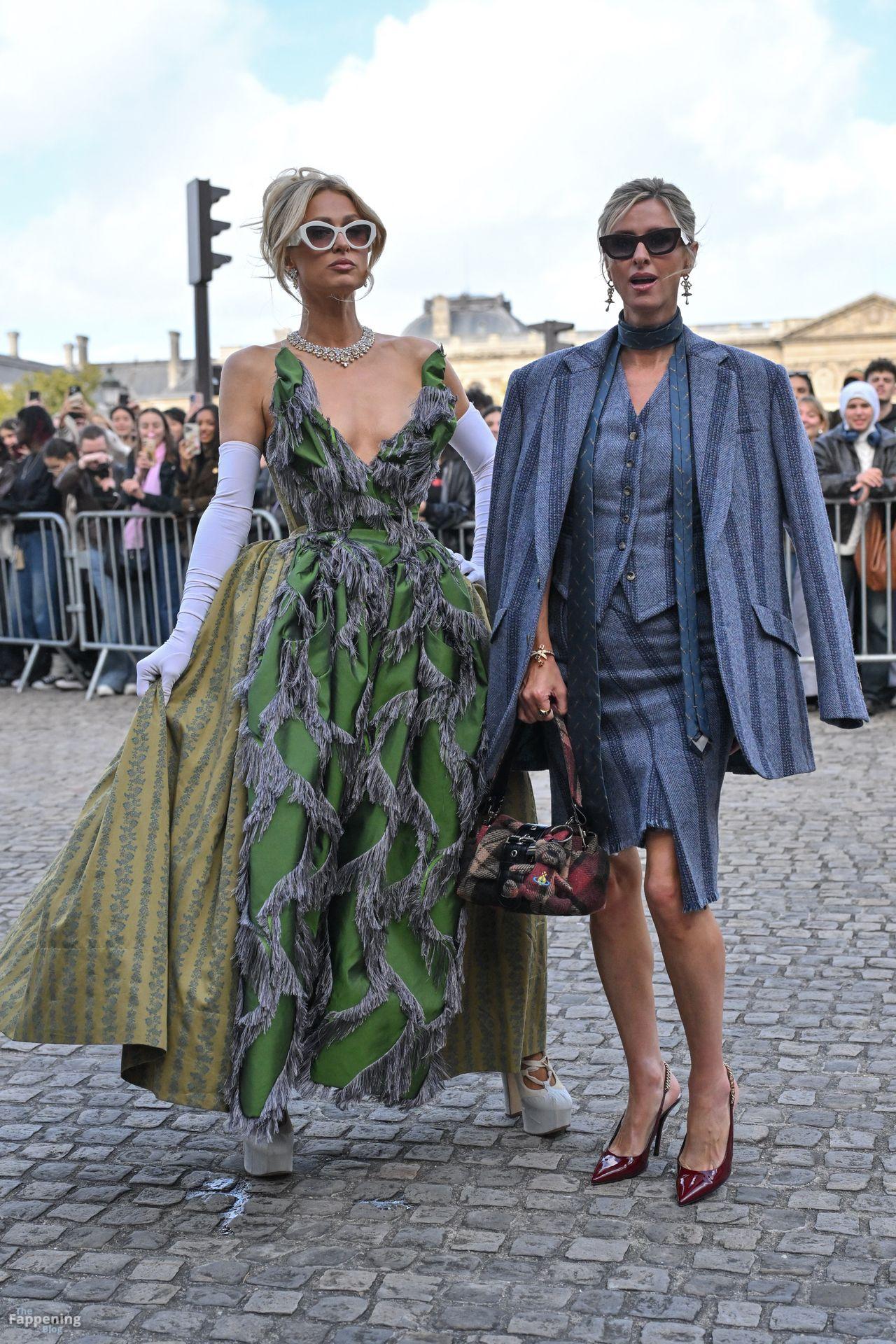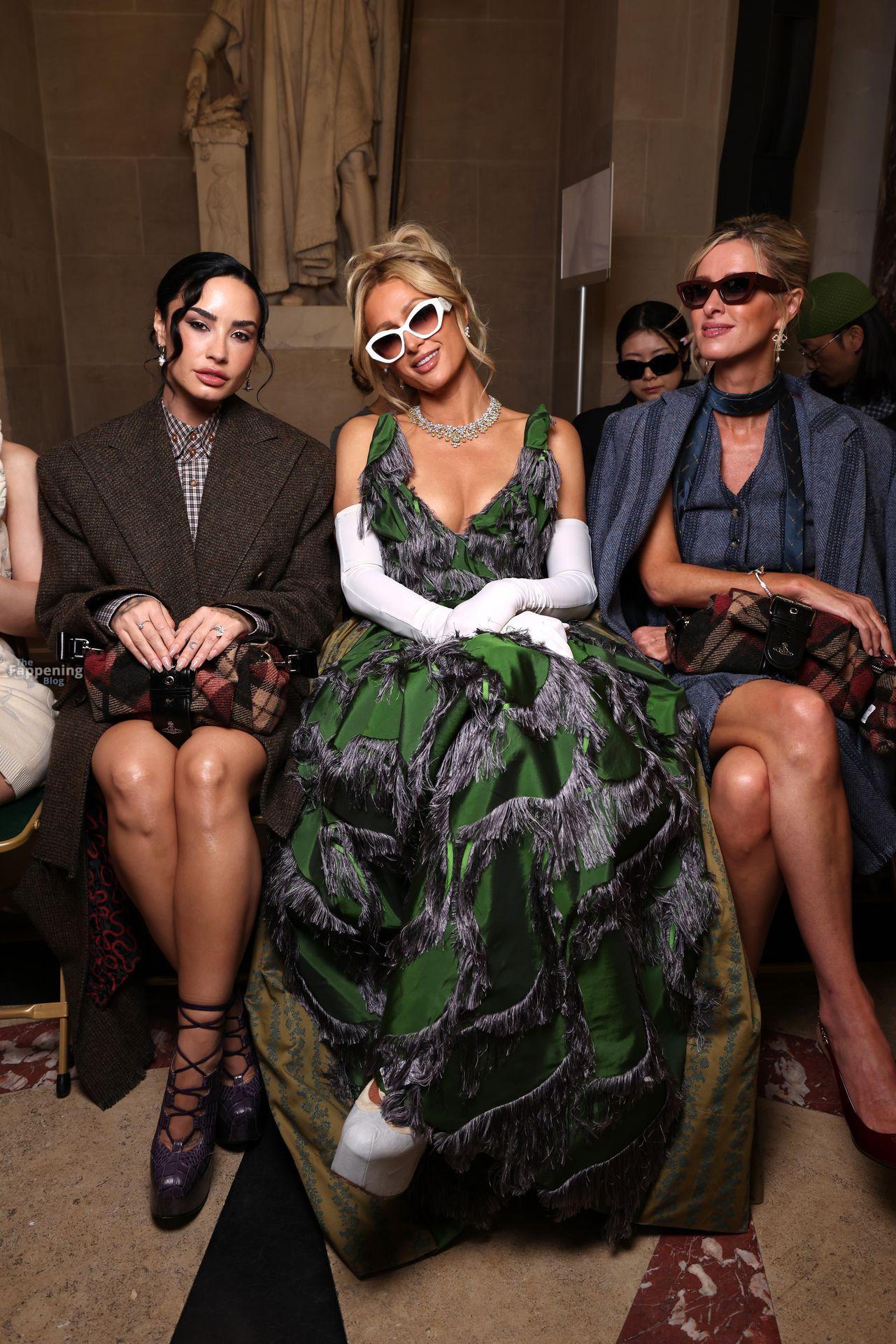 Paris Hilton dominó la Semana de la Moda de París, luciendo un vestido verde de Vivienne Westwood con un escote pronunciado que mostraba su escote.