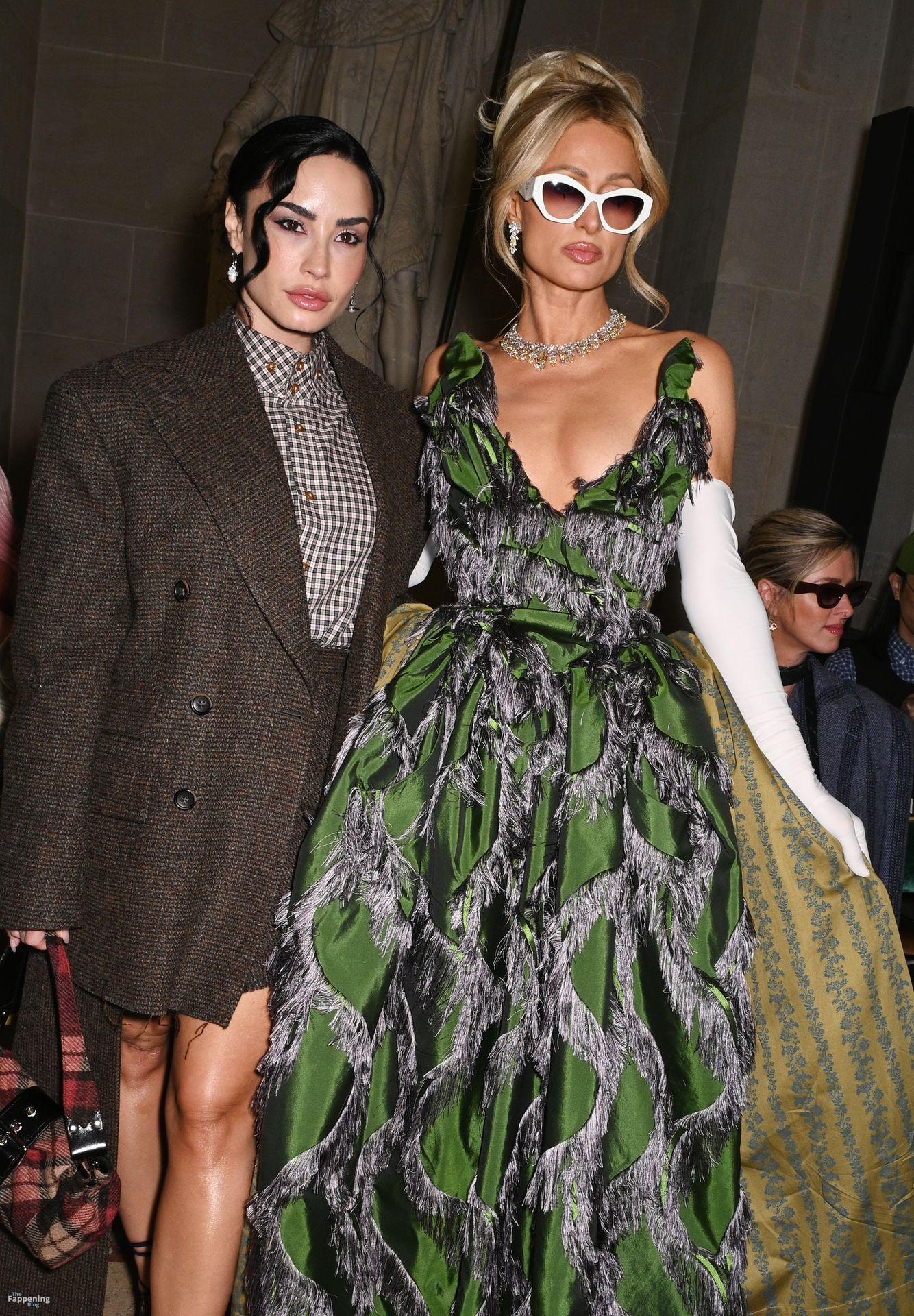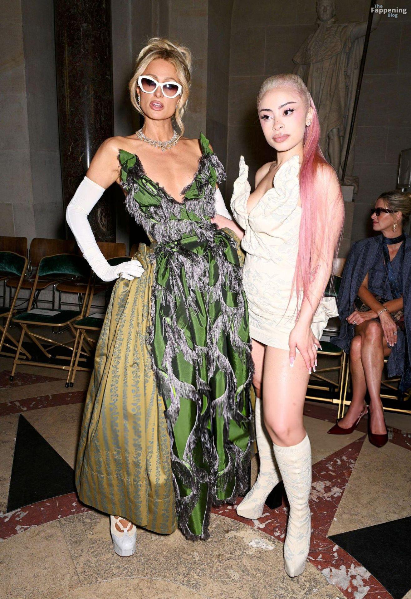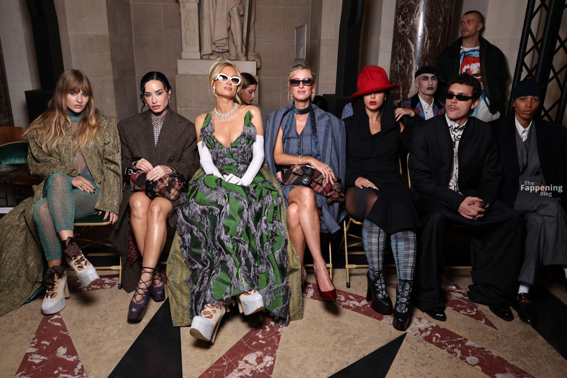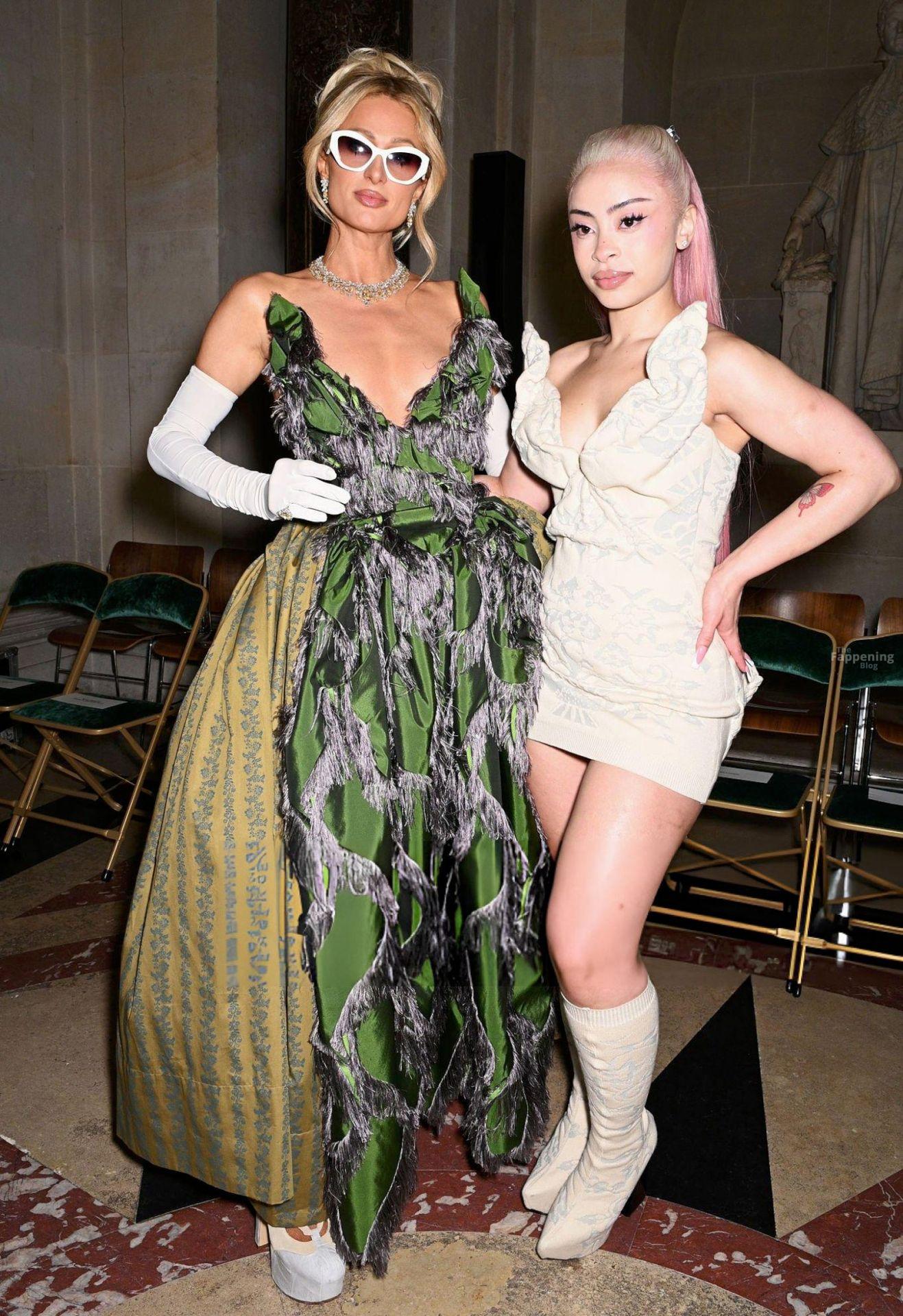Paris Hilton dominó la Semana de la Moda de París, luciendo un vestido verde de Vivienne Westwood con un escote pronunciado que mostraba su escote.