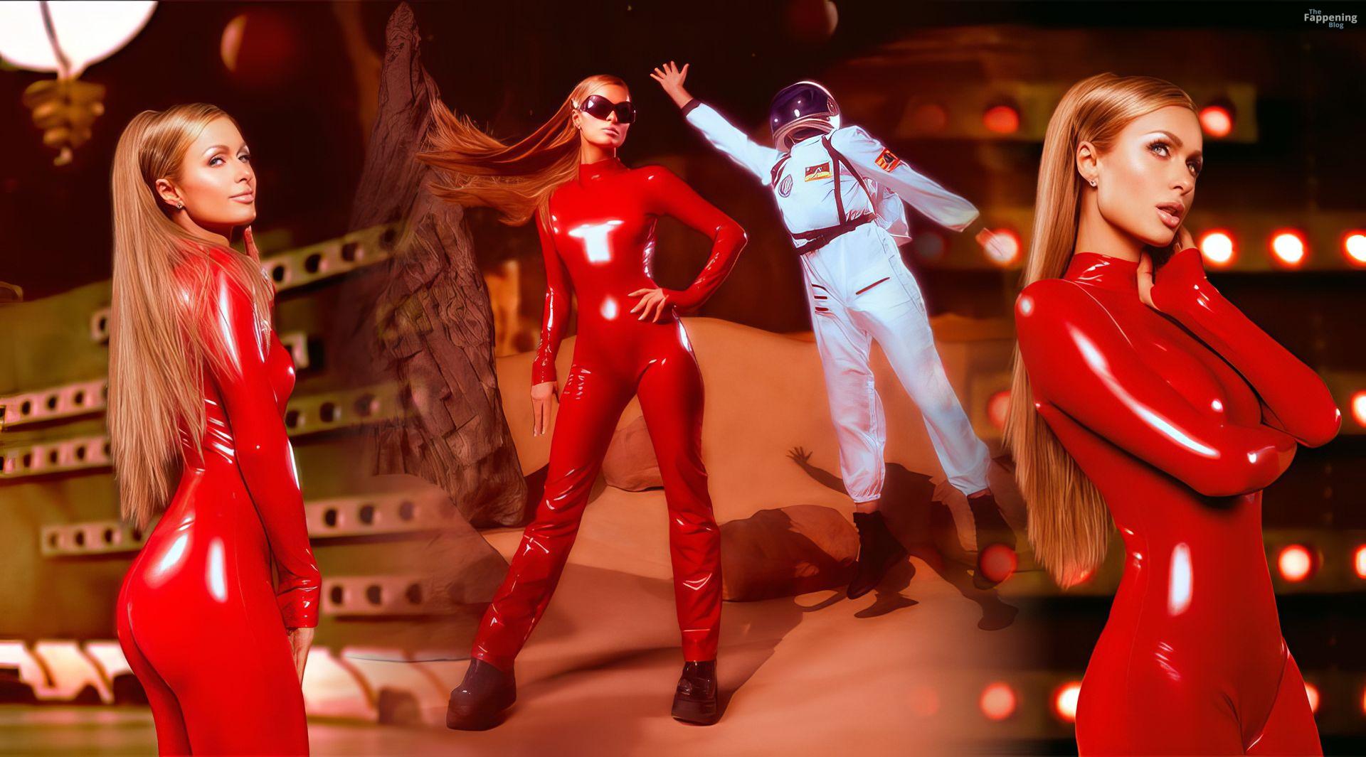 Paris Hilton posa con un conjunto de látex rojo para la sesión “Oops!… I Did It Again”.