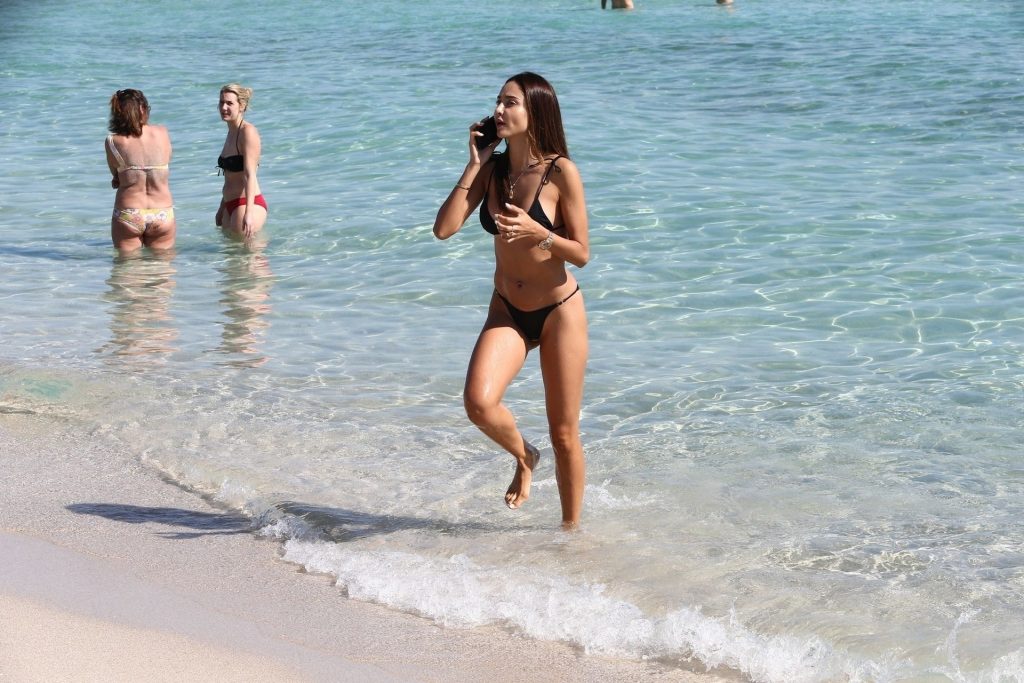 Patricia Contreras se da un rápido chapuzón en el agua mientras está en la playa con el “superfanático de la NBA” James Goldstein, quien se relaja en una silla de playa – Miami, 12/07/2019.