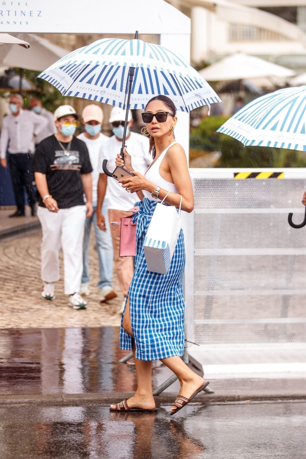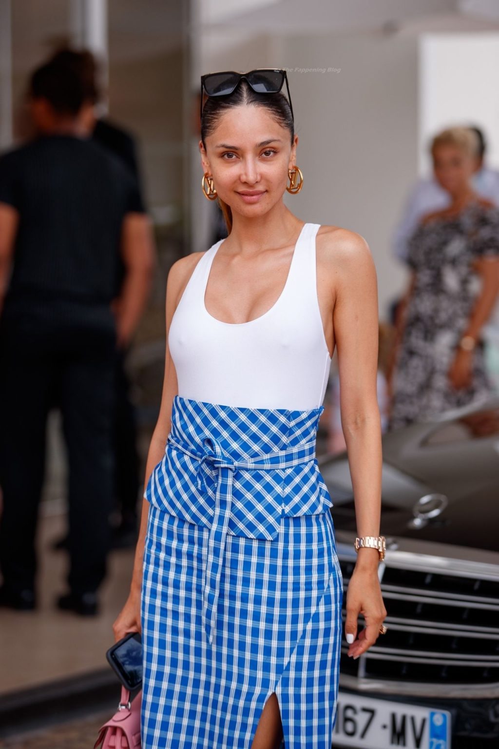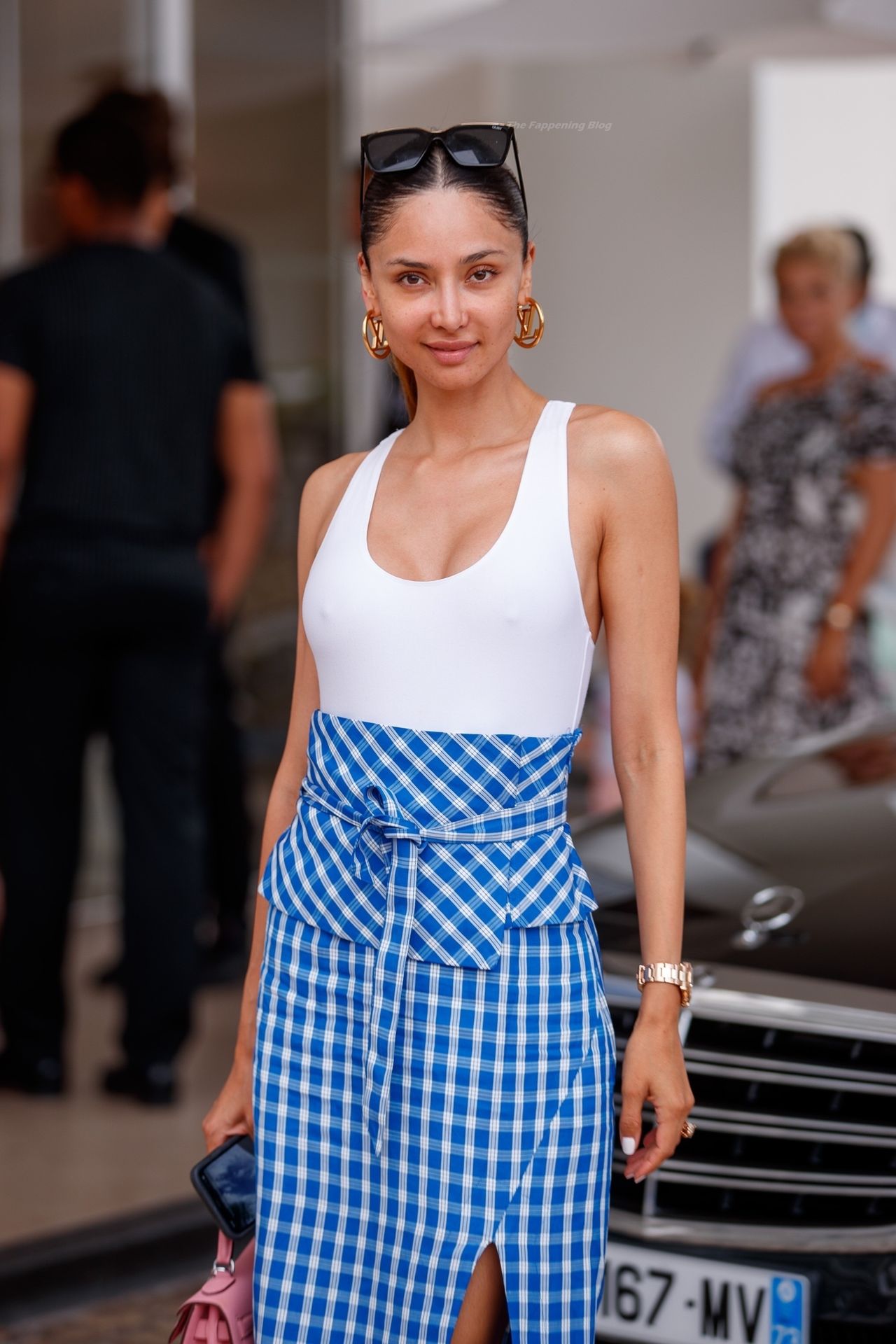 La bloguera de moda Patricia Gloria Contreras es vista con una blusa blanca sin sostén en el Hotel Martinez durante el 74º Festival de Cine de Cannes, 16/07/2021.
