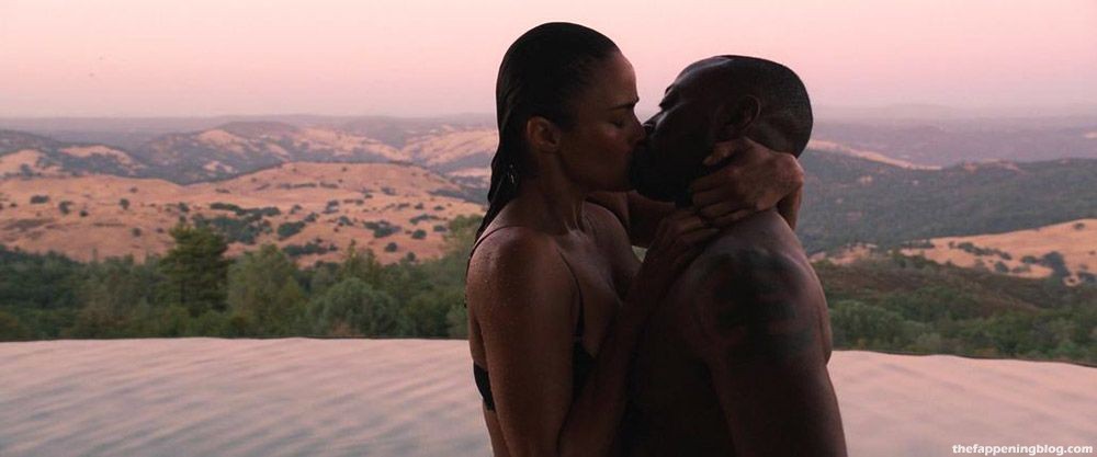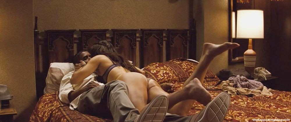 Then Paula Patton is seen pulling her shirt off over her head to reveal the lingerie underneath. She climbs onto a bed with a guy and lays down on top of him. What a figure!