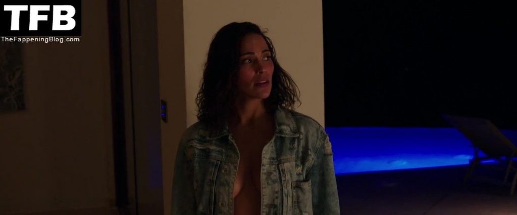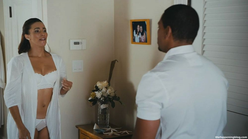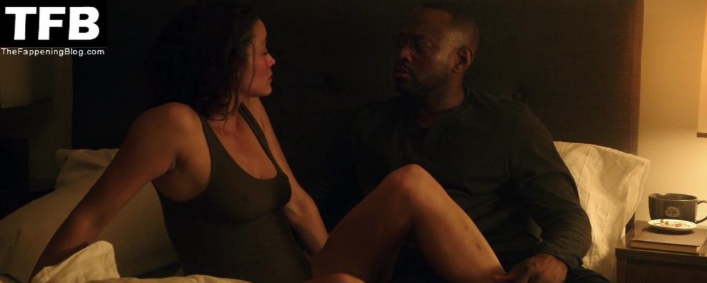 In the next scene, hot Paula Patton is sitting on a bed in a black bra. She’s showing the cleavage as she talks to a guy. After a while, Paula gets dressed.