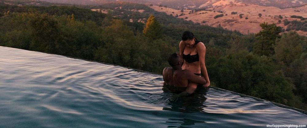 After the sex scene, Paula Patton is undressing to lingerie. Then she goes swimming in a pool, and then a guy joins there! Showing cleavage as she makes out with him against the edge of the pool.