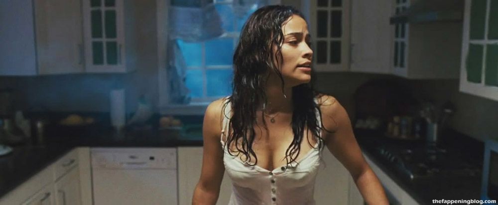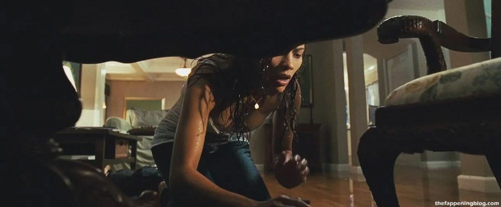 Paula Patton is seen in ‘Mirrors’, walking through a house in a wet shirt and showing nice cleavage. She kneels to look underneath a table and gives us a great look at her cleavage.