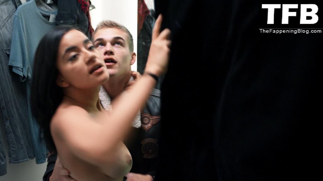Paulina Gaitan está montada sobre un chico en un vestidor, quitándose la camisa por la cabeza para quedarse sin camiseta y mostrando su pecho derecho un par de veces, especialmente cuando se alcanza para cerrar la cortina detrás de ella.