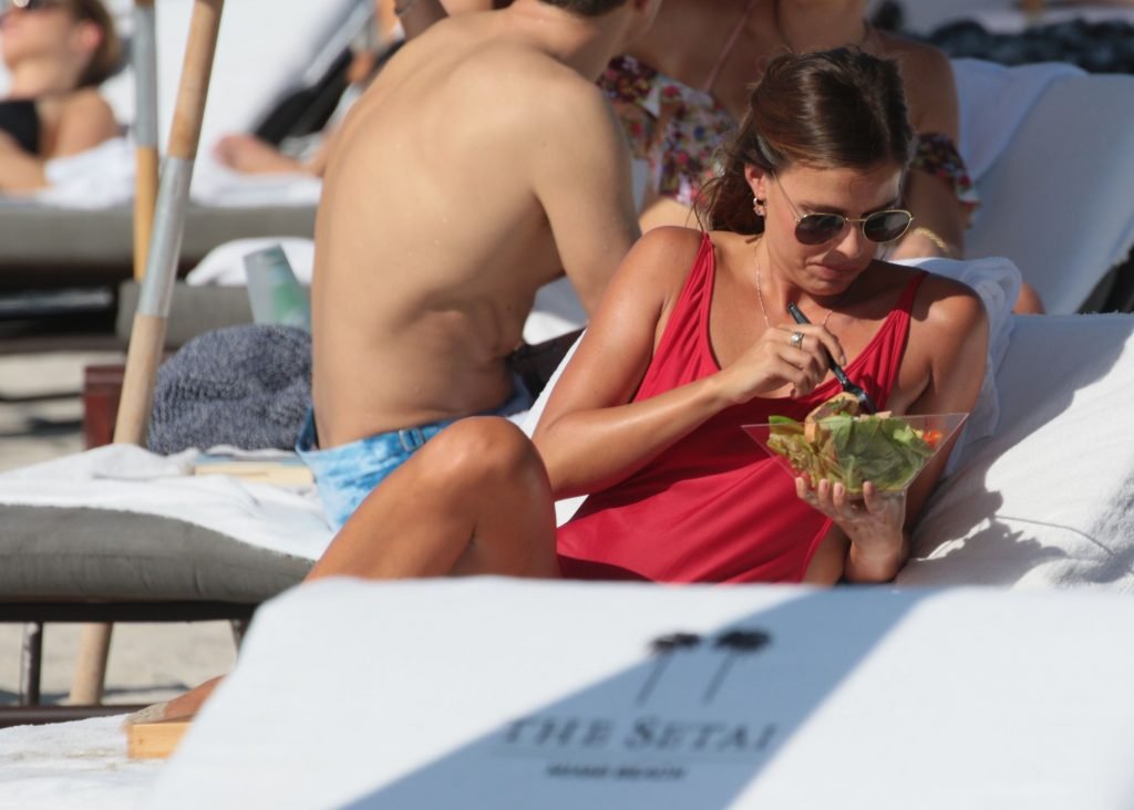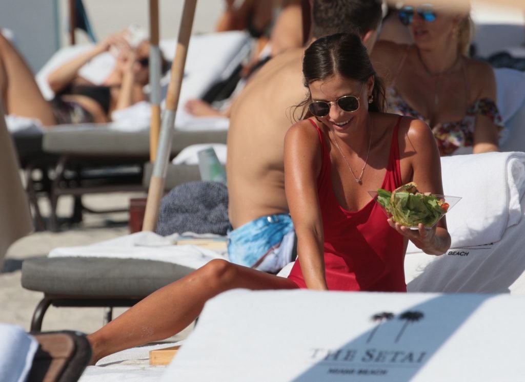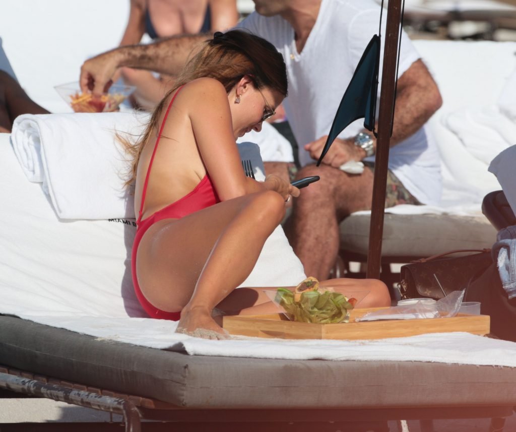 Petra disfrutó un día en el hotel The Setai con su perro. Comió una ensalada mientras trabajaba en su bronceado, cubriéndose a veces con un traje de baño rojo de una pieza. Pero no se quedó ahí, también estaba bebiendo vino y usando su teléfono, además se puso aceite bronceador en sus tetas.