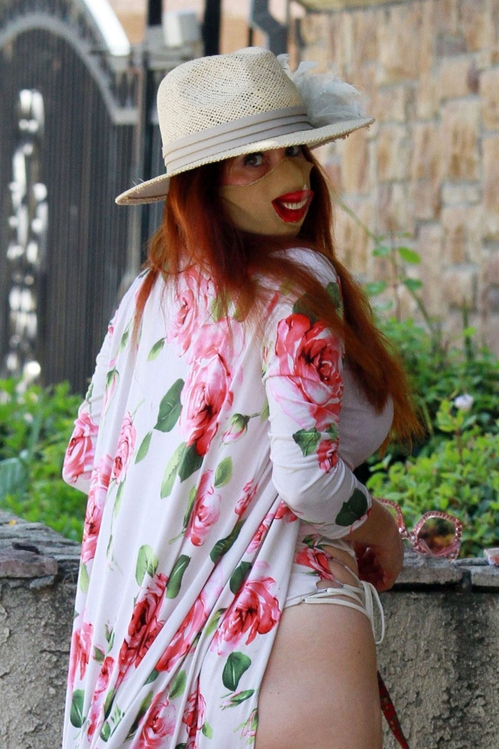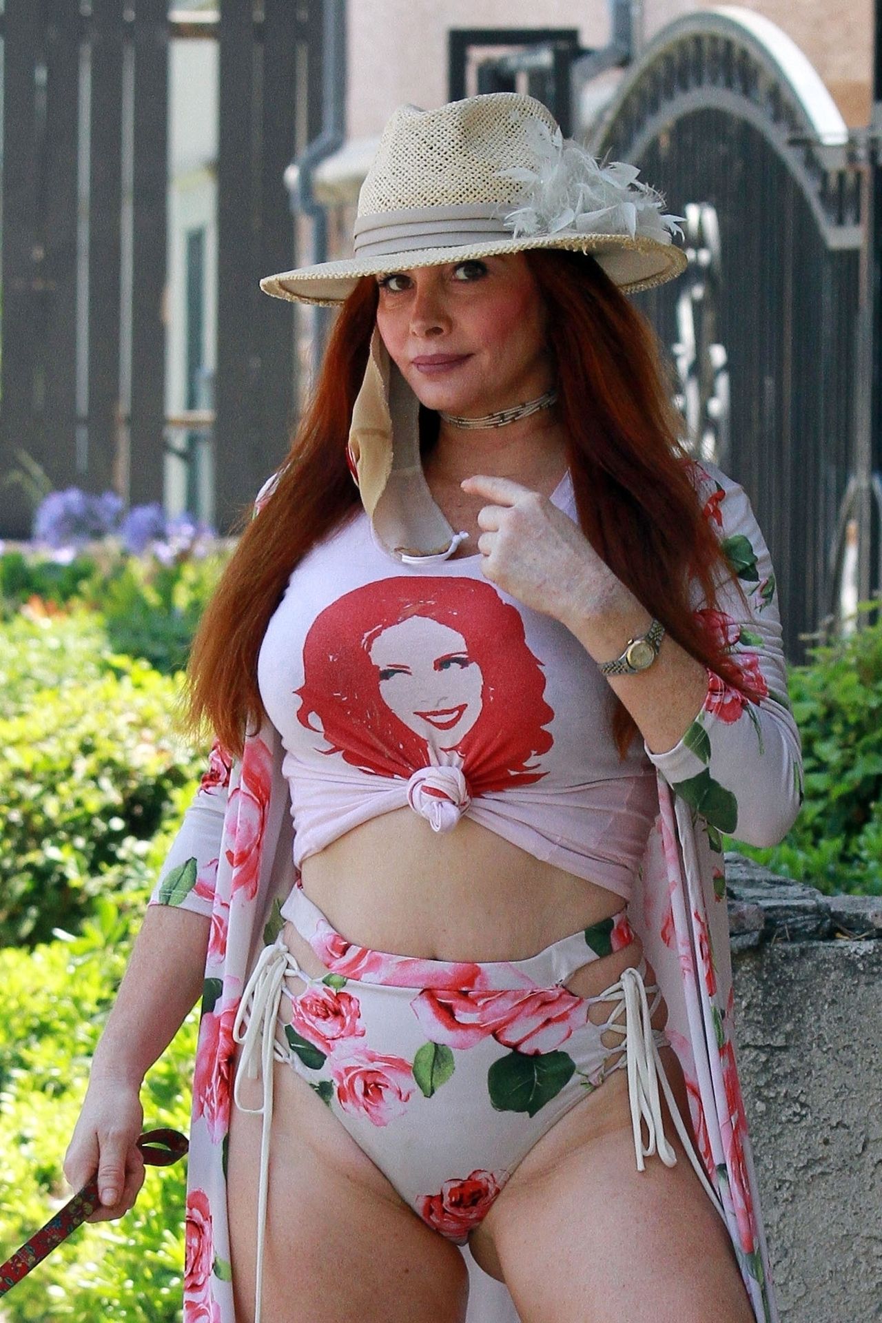 Actriz Phoebe Price muestra un poco de piel mientras pasea a su perro esta tarde (2020). Phoebe mostró su trasero a la cámara.