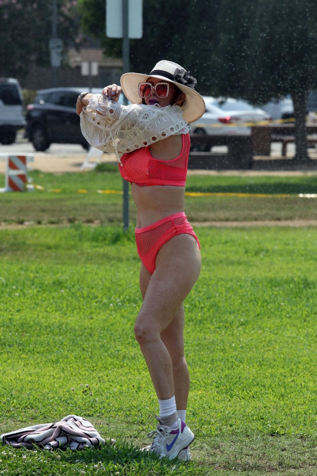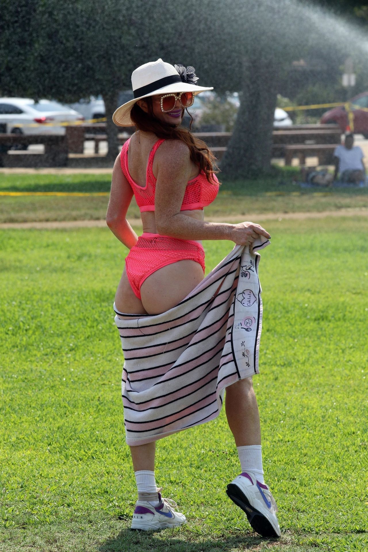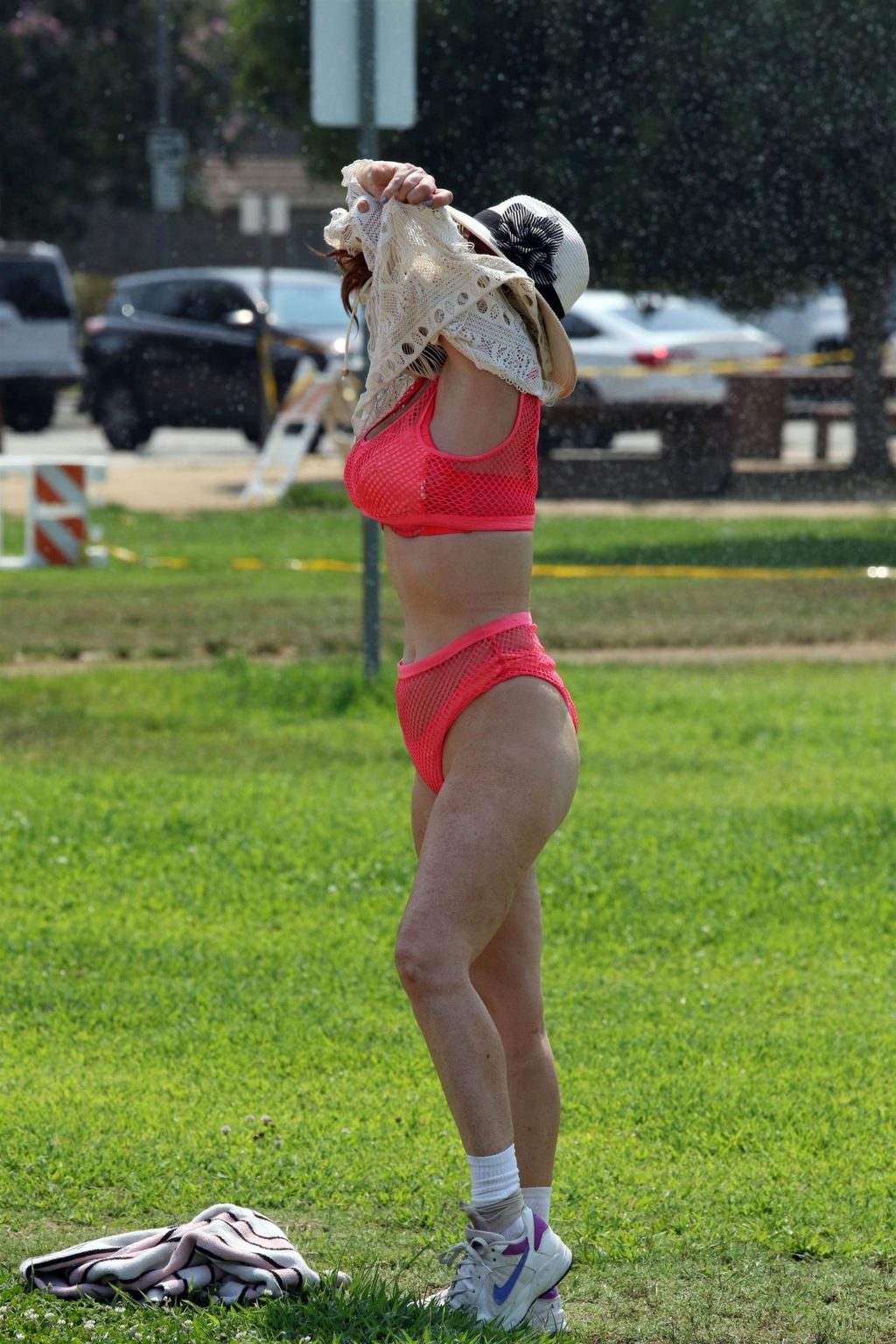 Phoebe Price se ve en bikini en el parque mojándose con los aspersores durante la ola de calor en Los Ángeles, 20/08/2020.