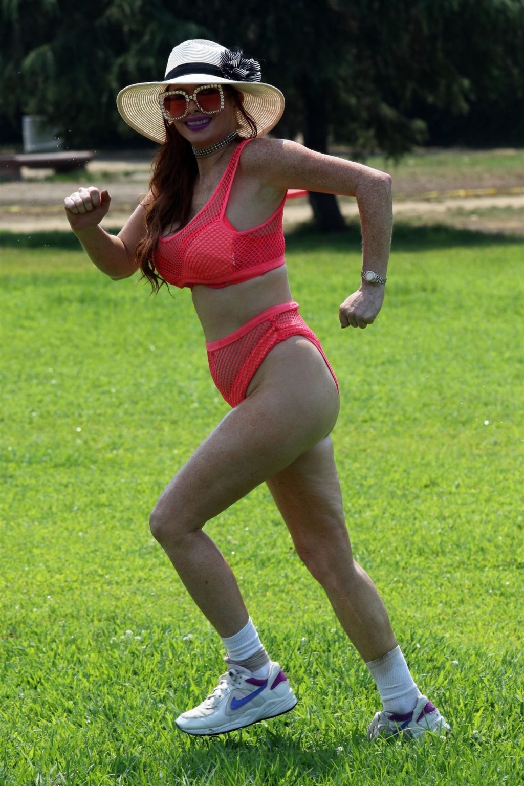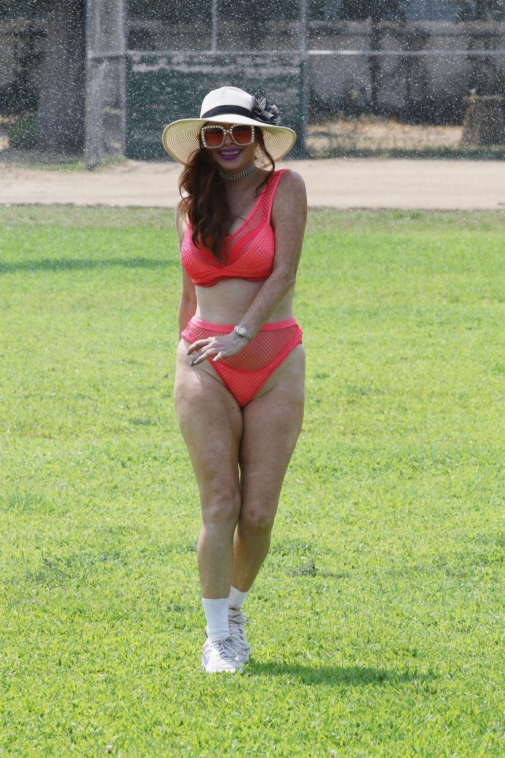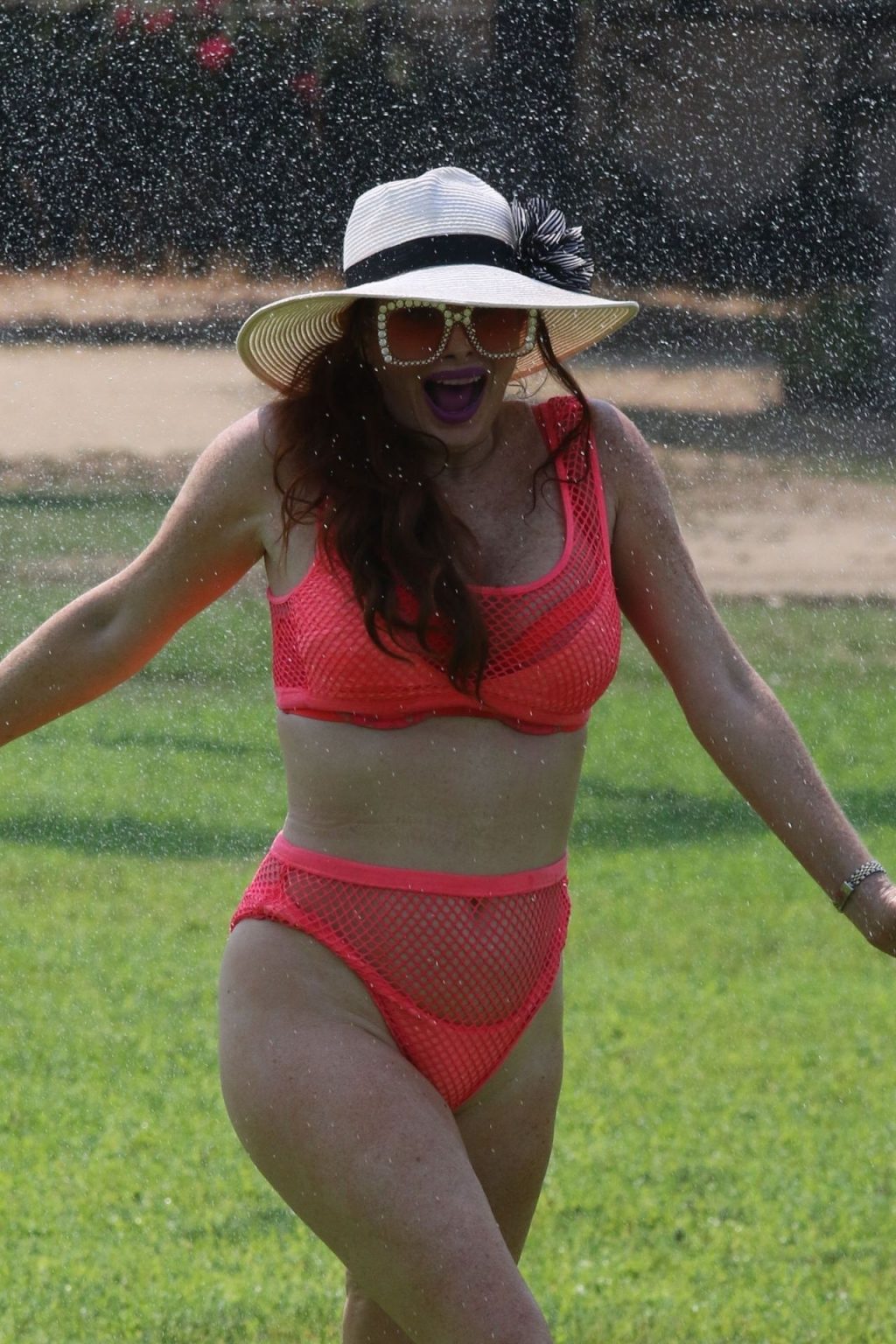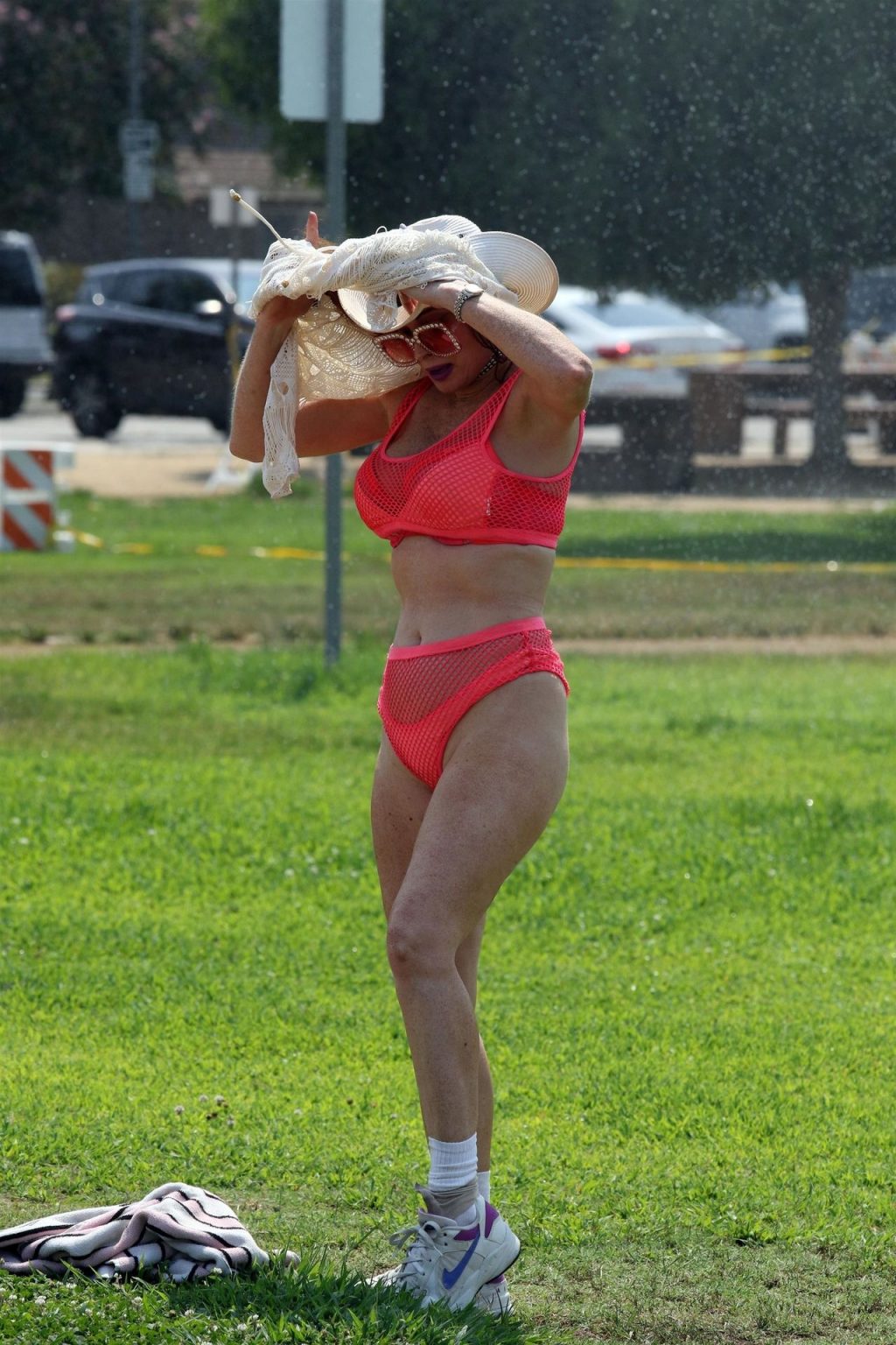 Phoebe Price se ve en bikini en el parque mojándose con los aspersores durante la ola de calor en Los Ángeles, 20/08/2020.