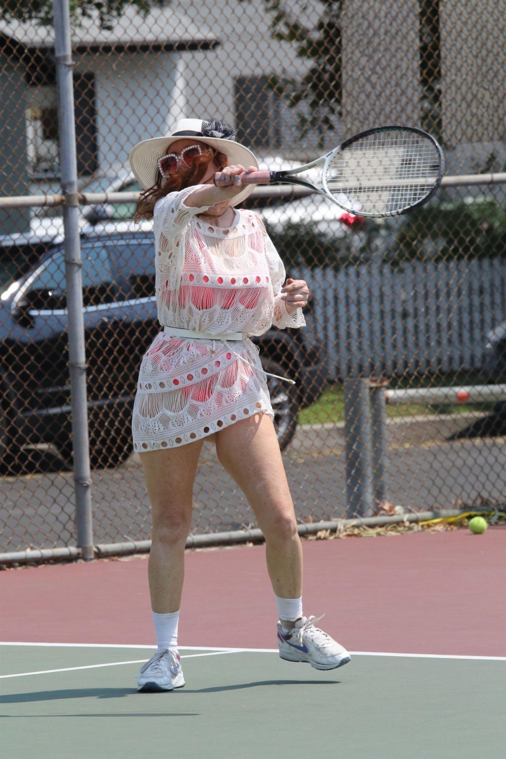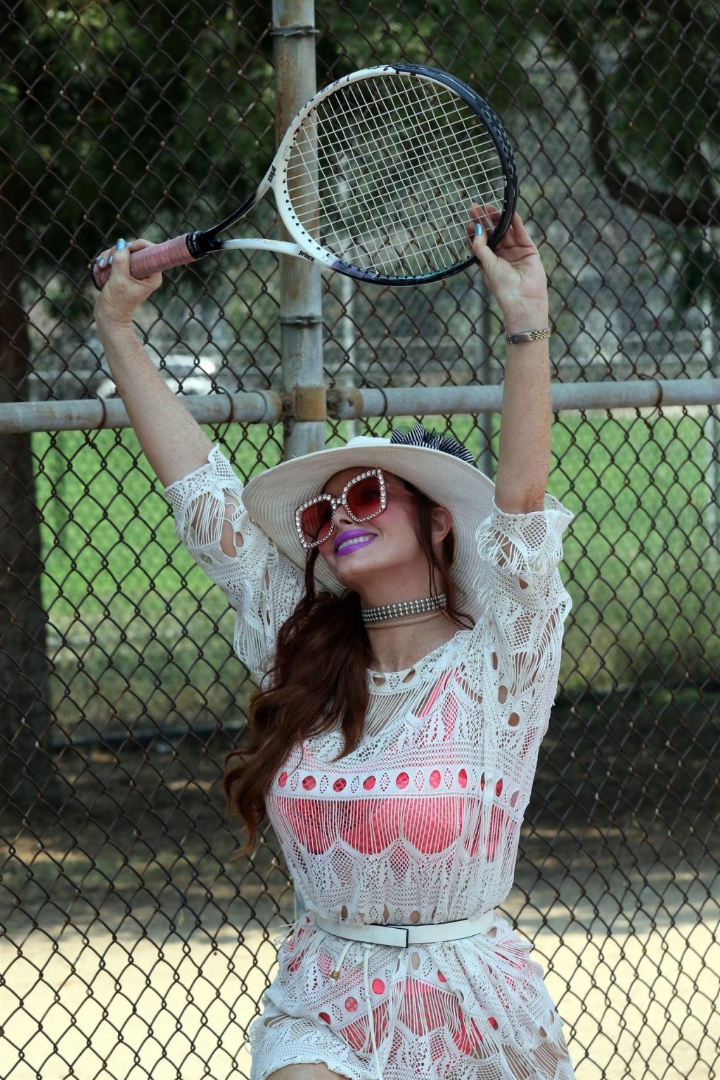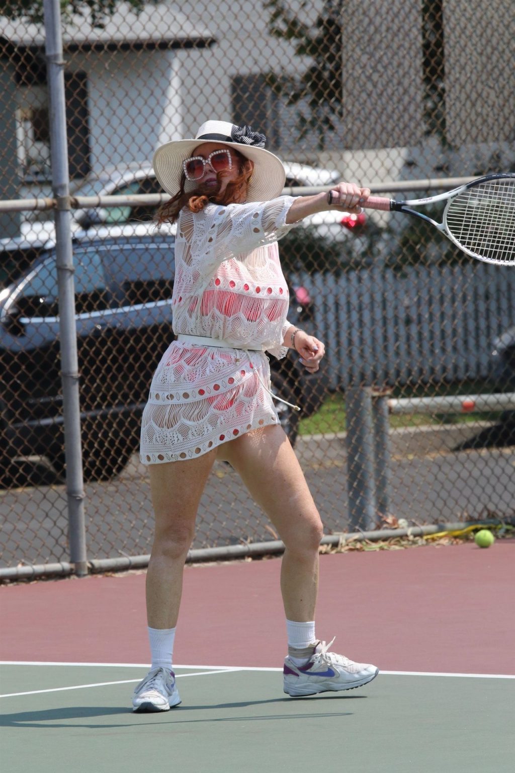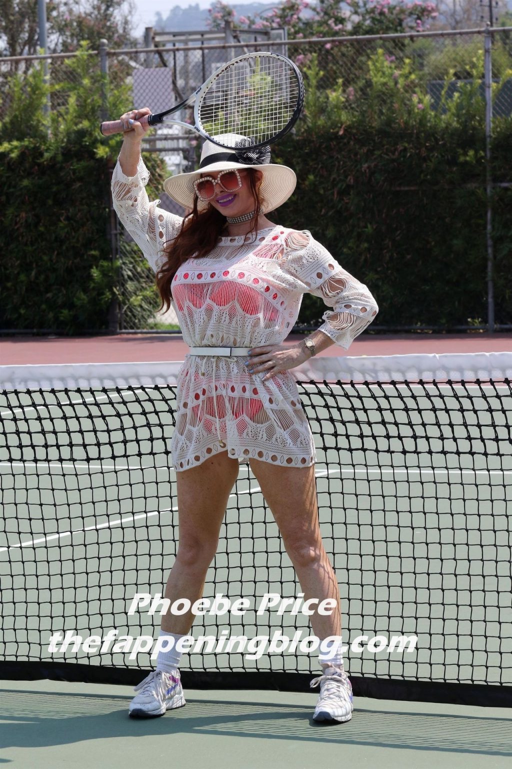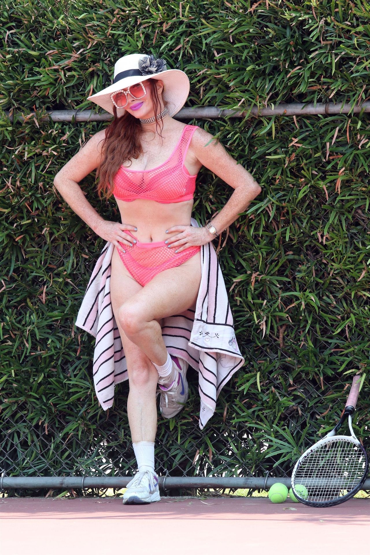 Ella parece 20 años más joven de la cintura para abajo que de la cintura para arriba. Phoebe, ¡siempre usa una camisa de manga larga y mantente bien alejada del sol! No me gusta su cara/maquillaje, pero me la tiraría a cuatro patas.