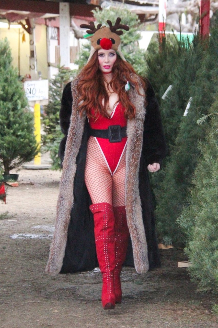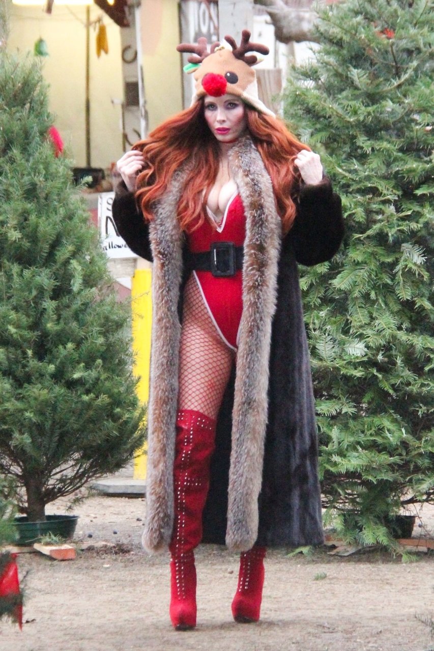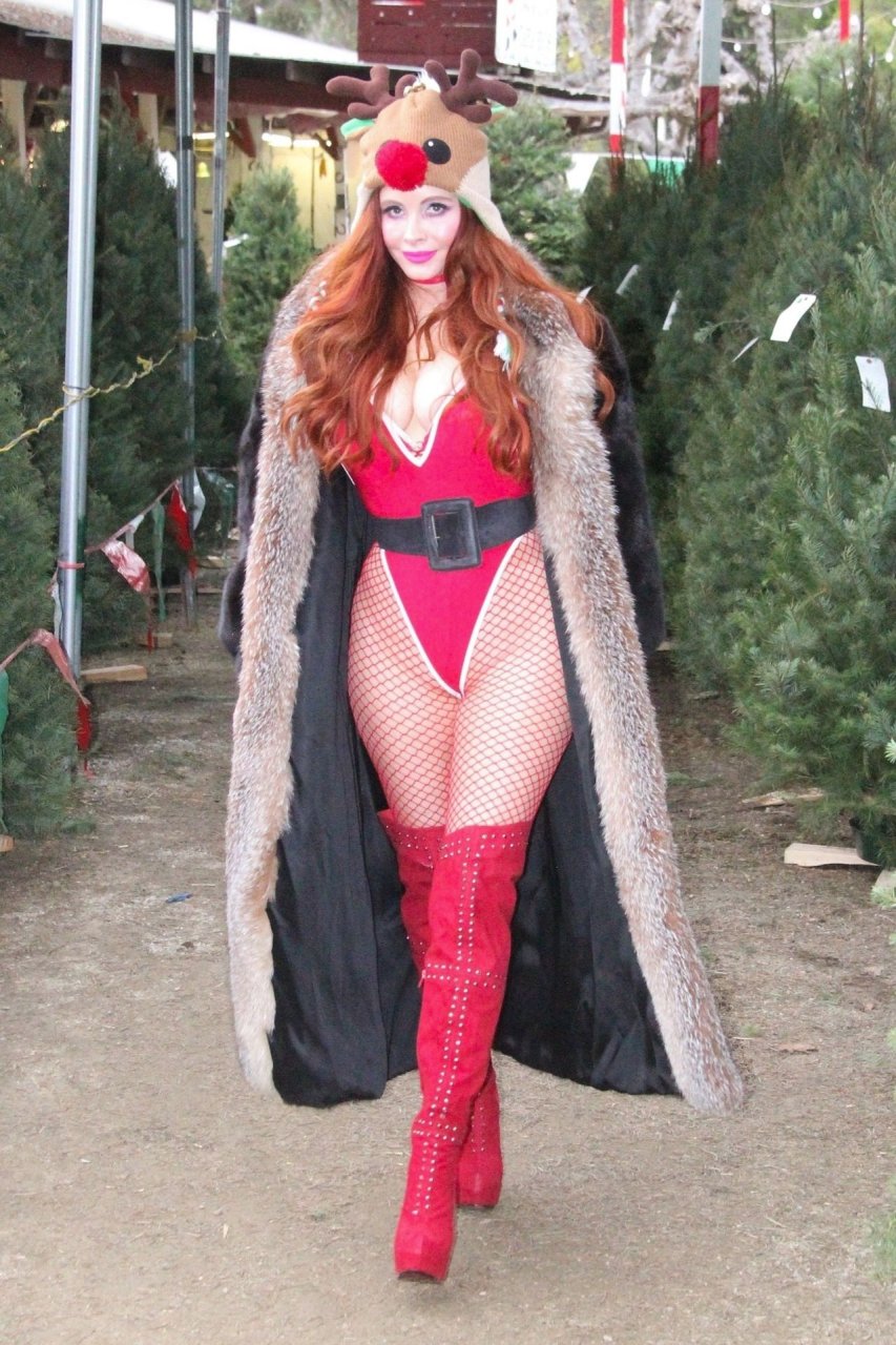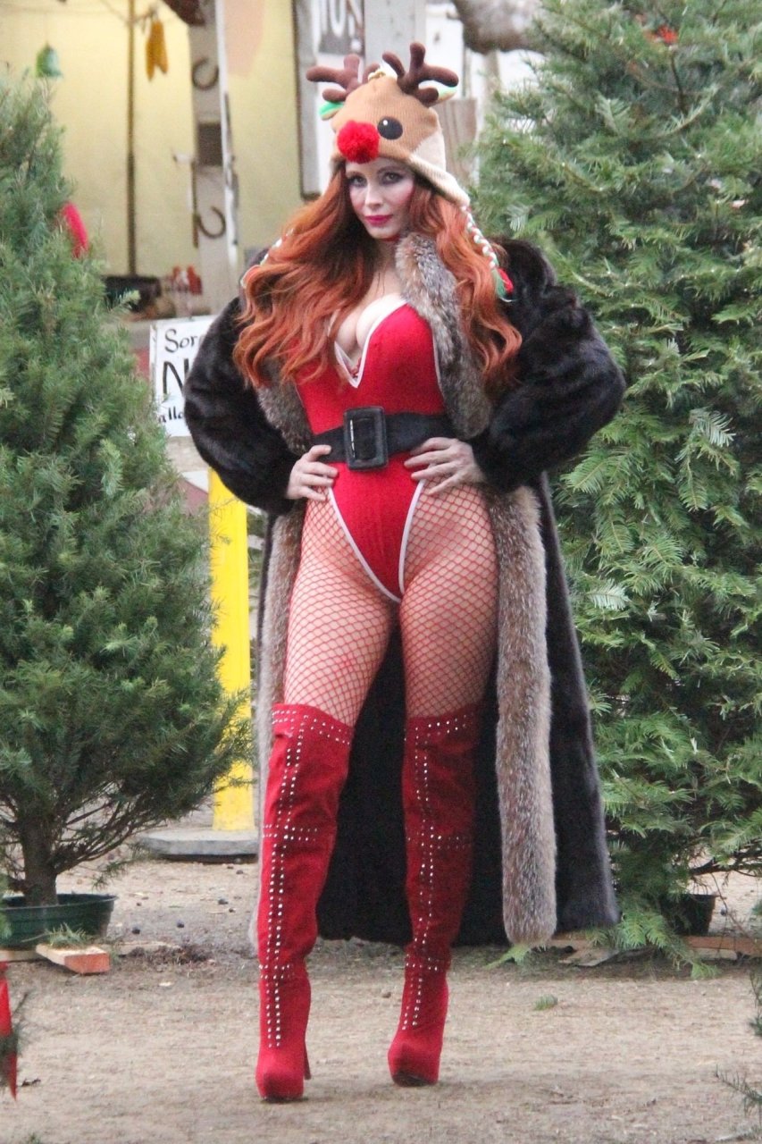 Phoebe Price se pone su mejor atuendo navideño para una sesión de fotos en un lote de árboles de Navidad en Los Ángeles, 17/12/2918. La aspirante a modelo y actriz de 46 años lució un corsé de Santa, medias de red rojas y una capucha de reno para su sesión.