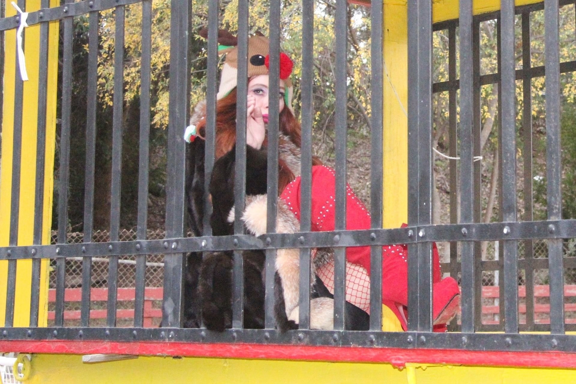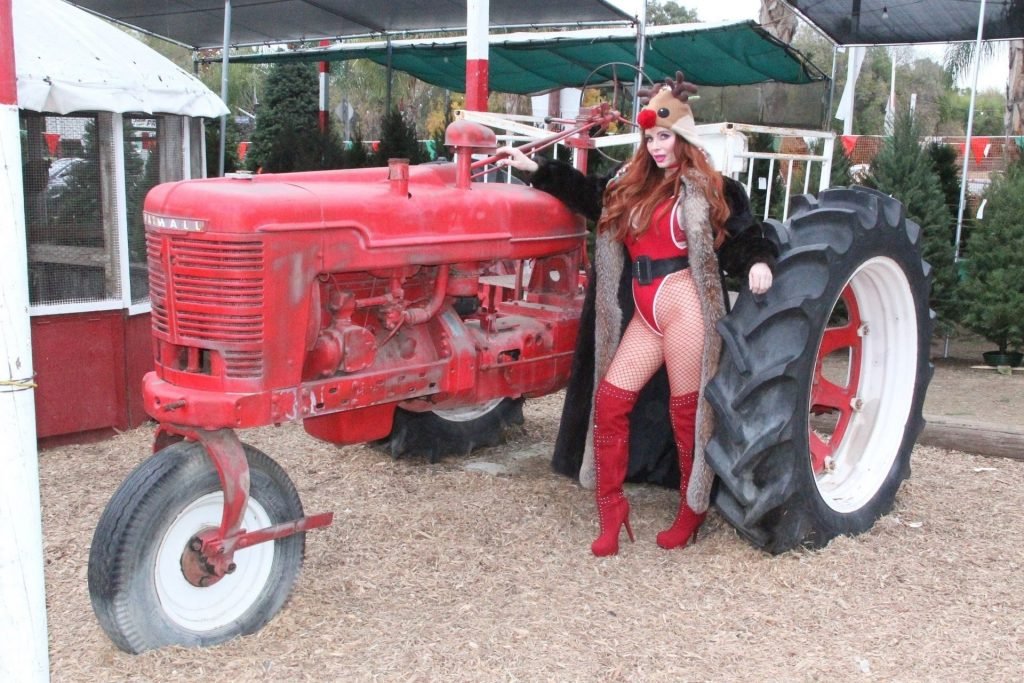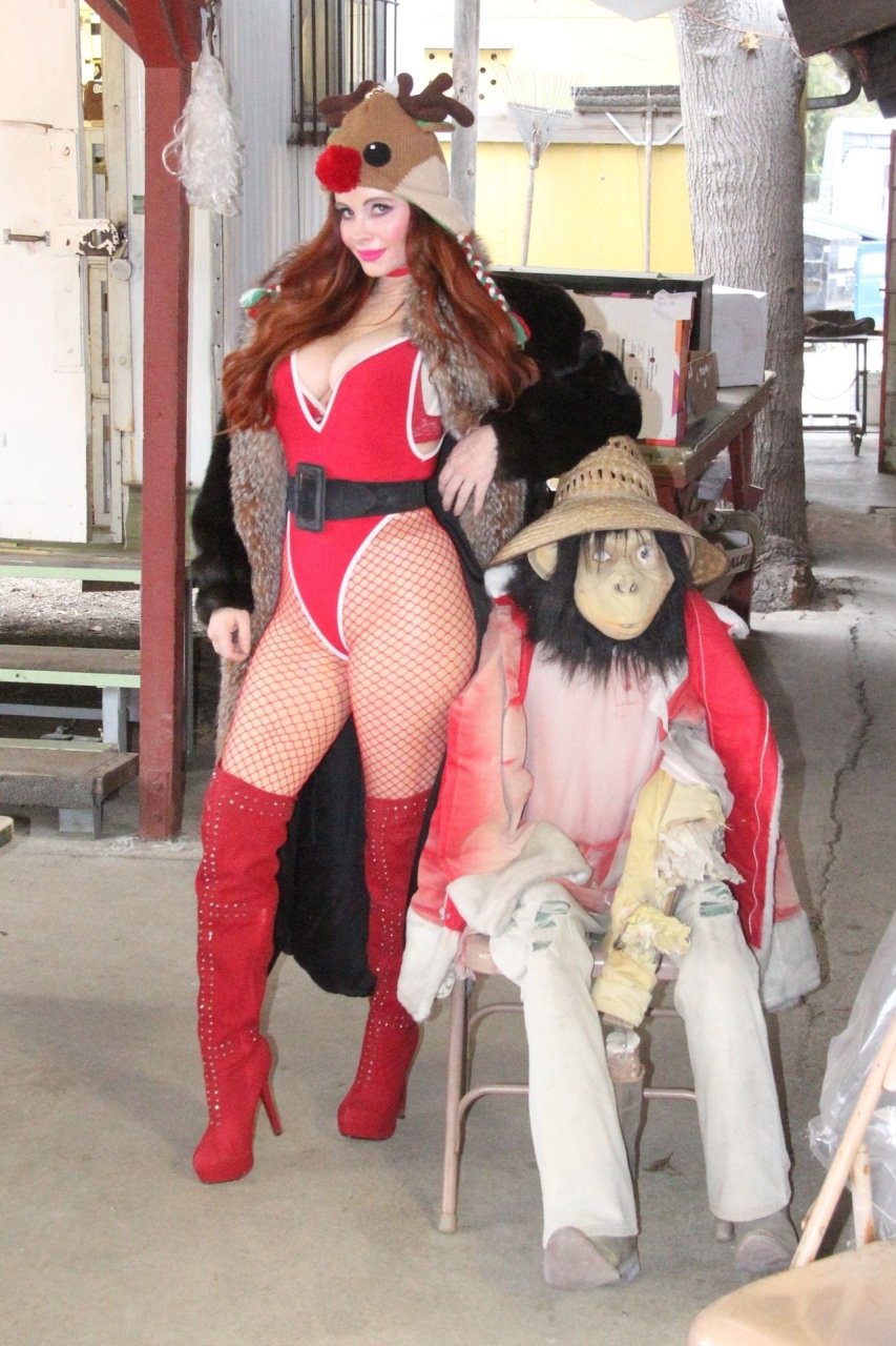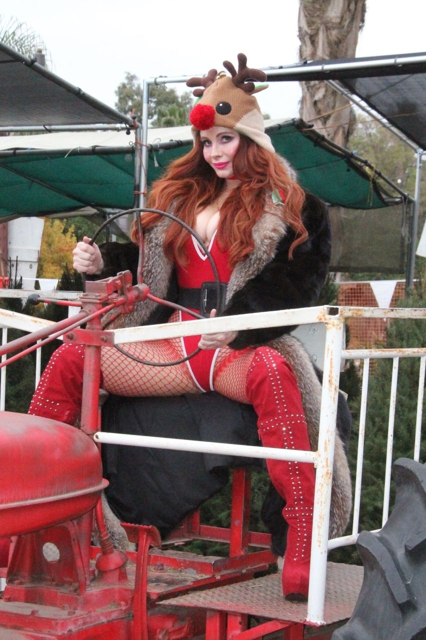 Phoebe Price se pone su mejor atuendo navideño para una sesión de fotos en un lote de árboles de Navidad en Los Ángeles, 17/12/2918. La aspirante a modelo y actriz de 46 años lució un corsé de Santa, medias de red rojas y una capucha de reno para su sesión.