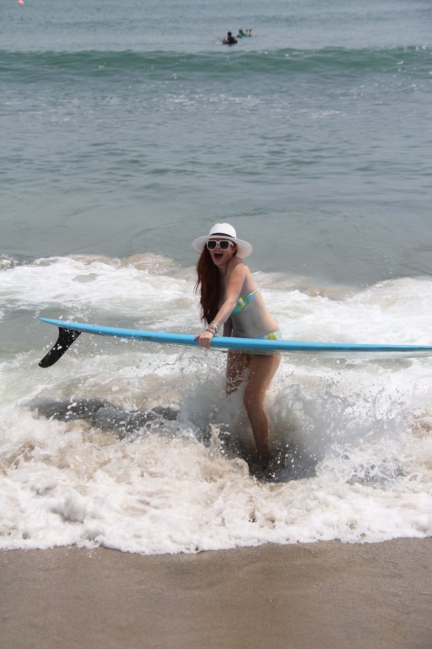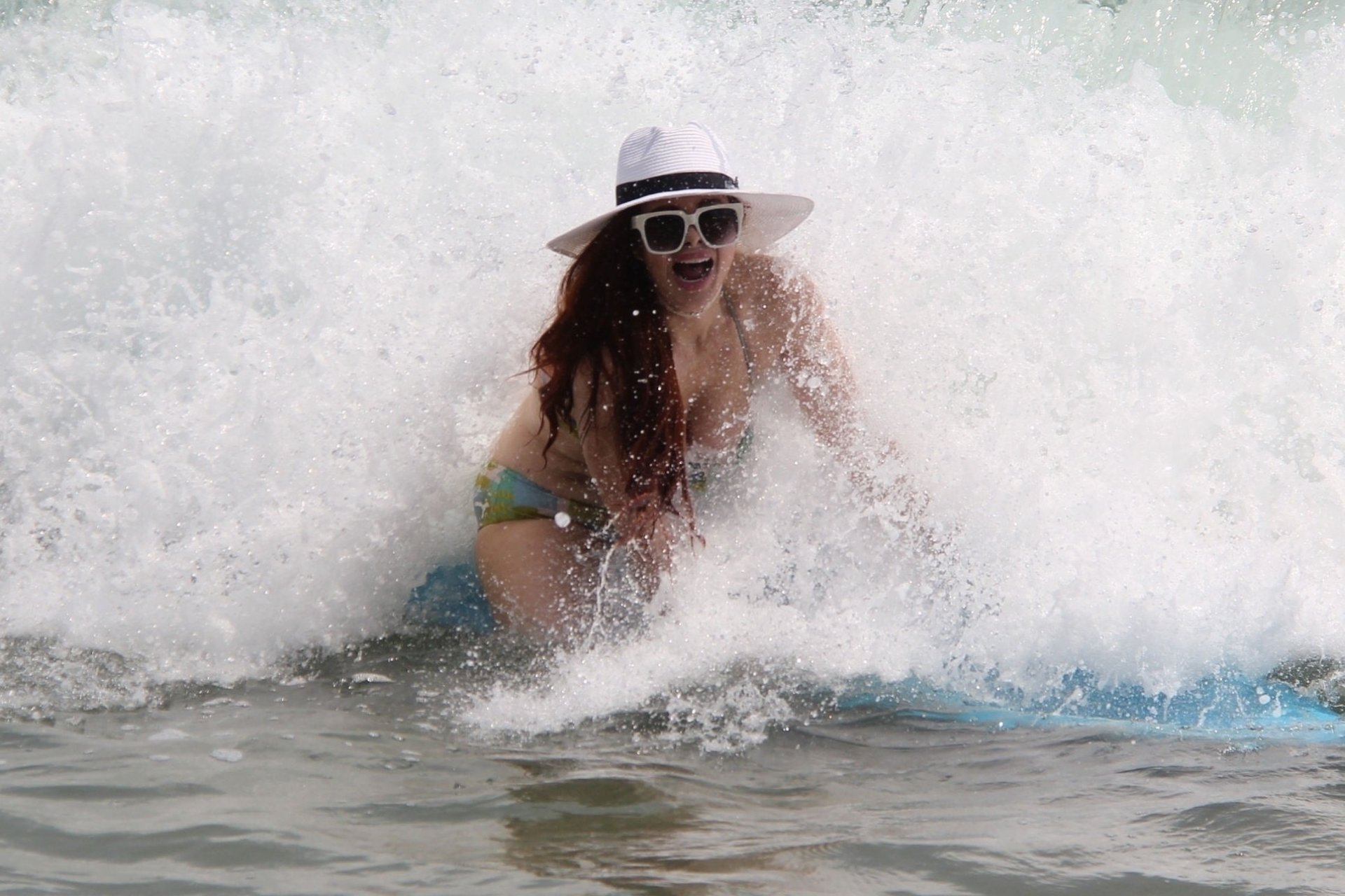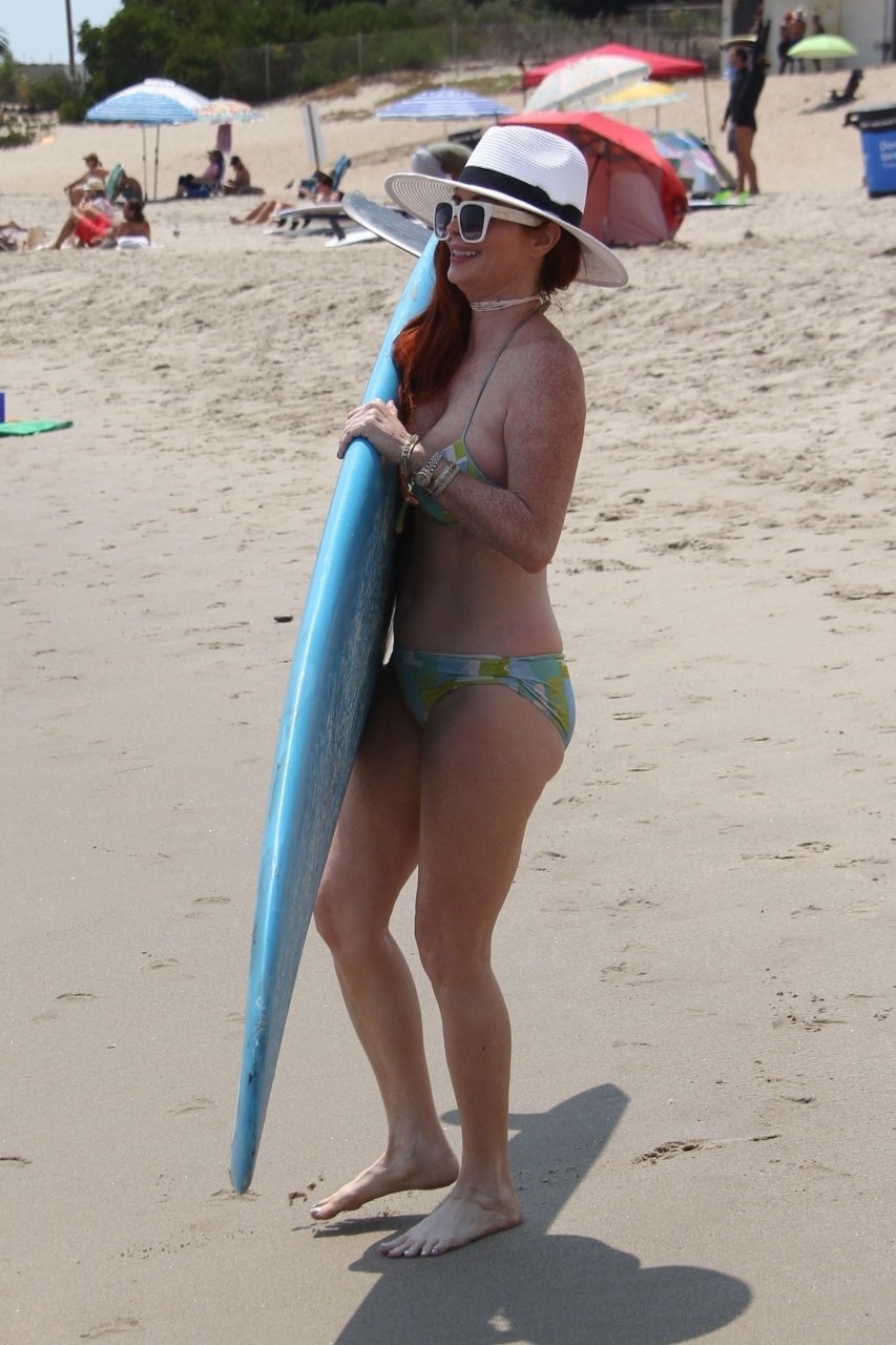 Ex actriz Phoebe Price (45) prueba el surf mientras muestra su cuerpo en bikini en la playa de Malibu, CA, 12/08/2018.
