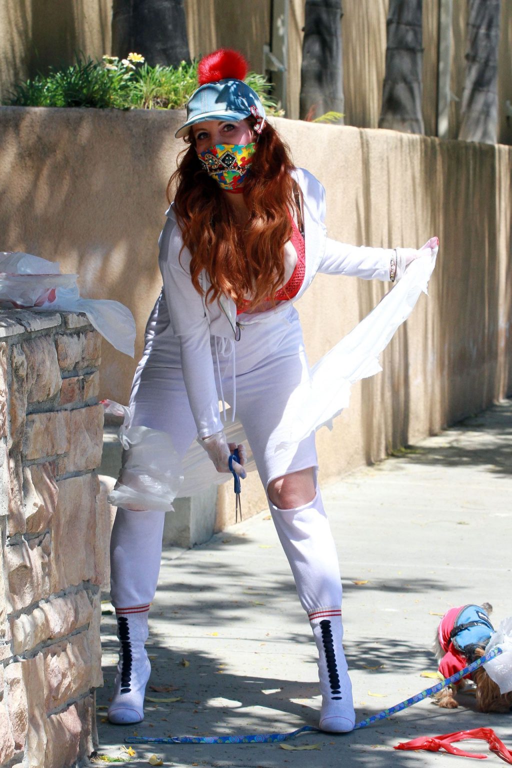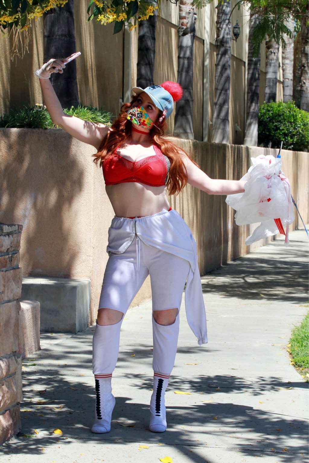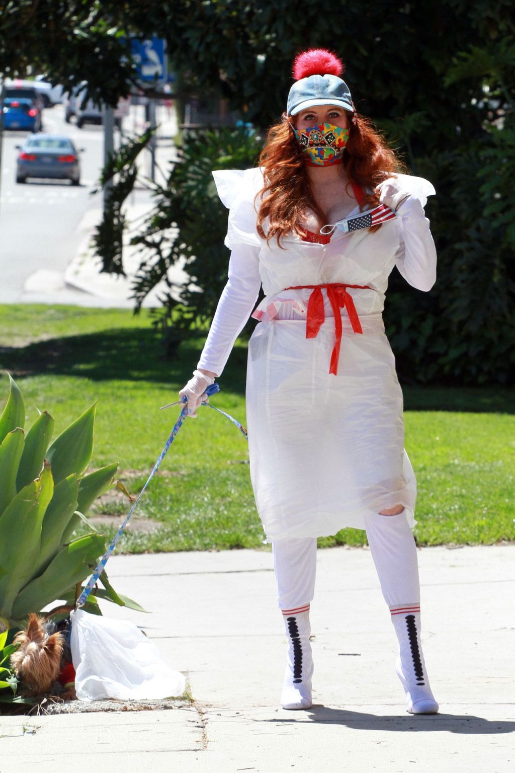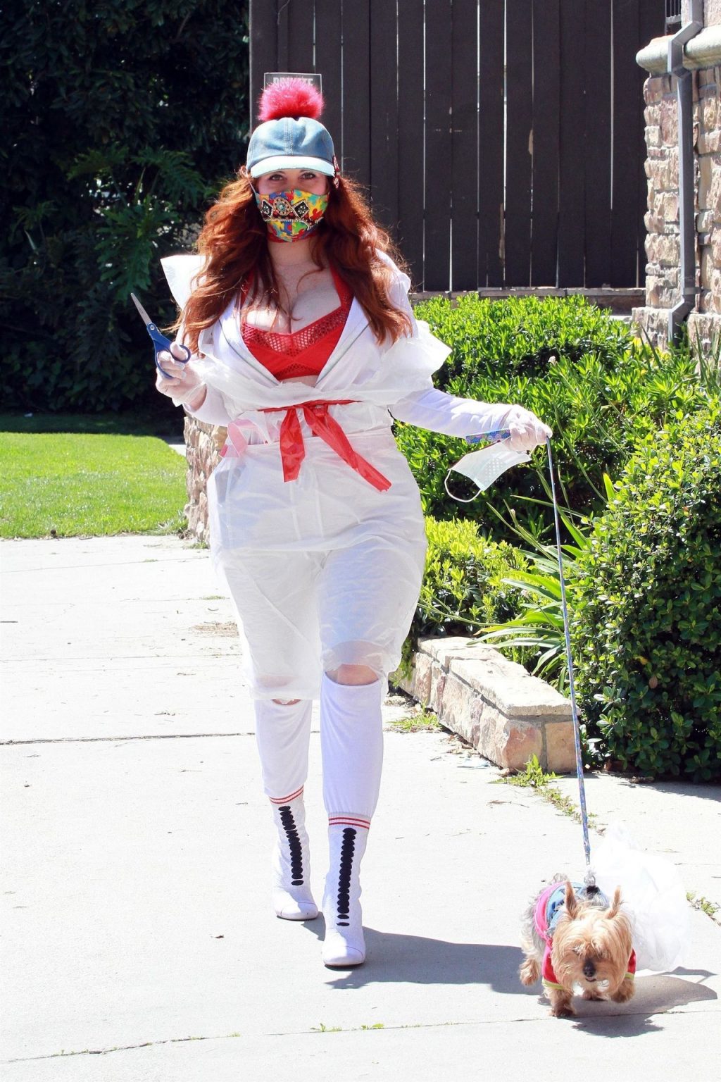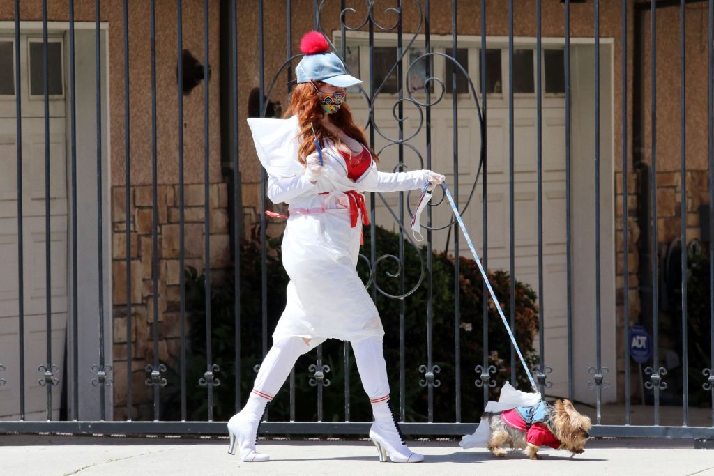 Actriz Phoebe Price es vista usando un vestido casero hecho de bolsas de basura de plástico en Los Ángeles, 15/04/2020.