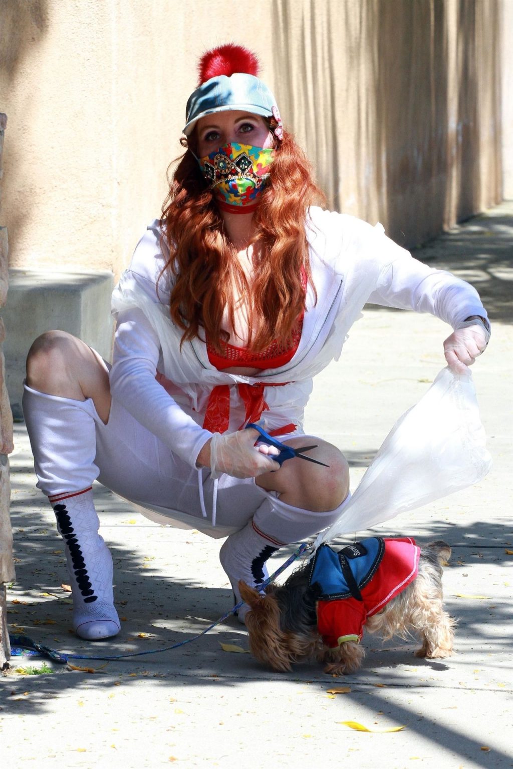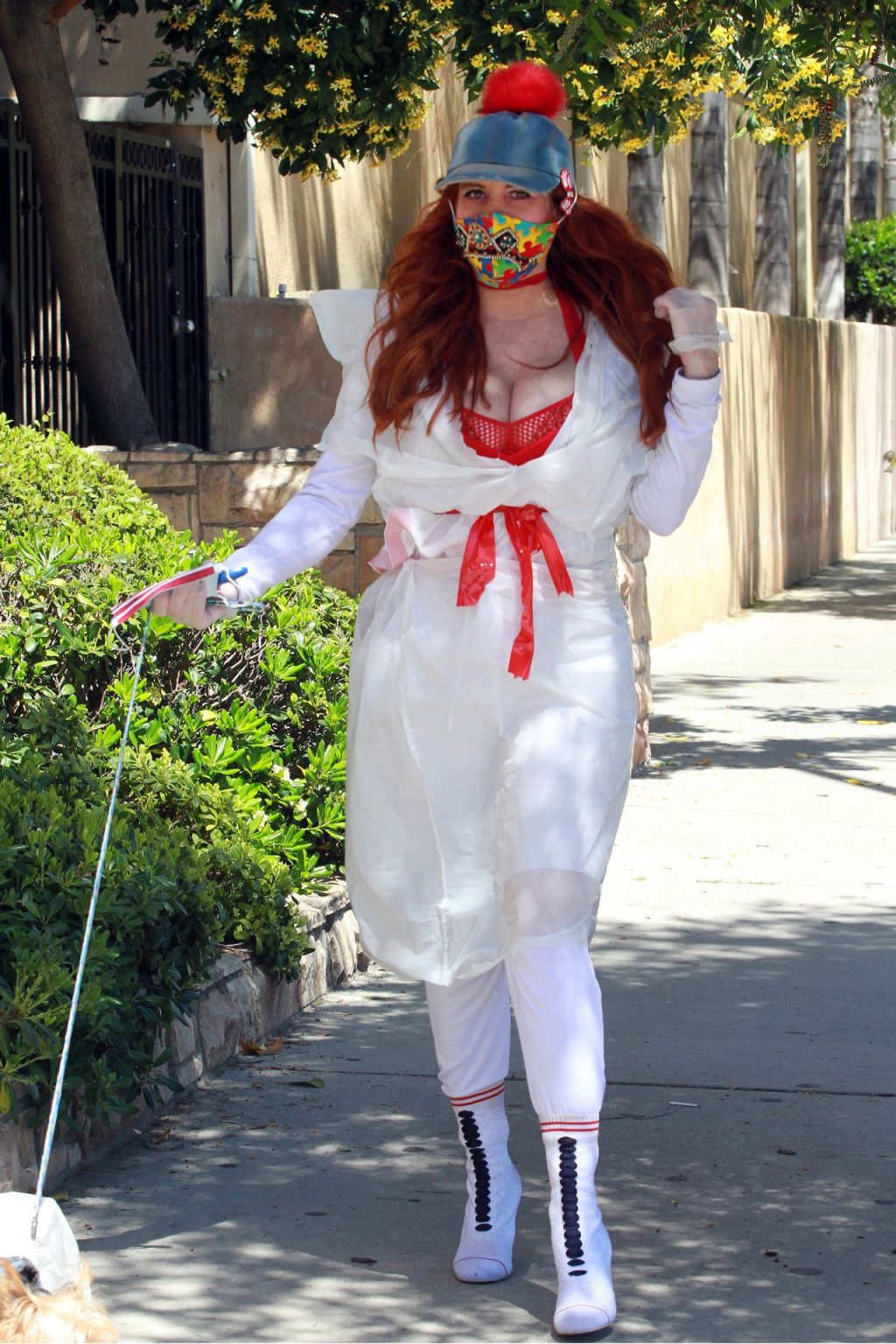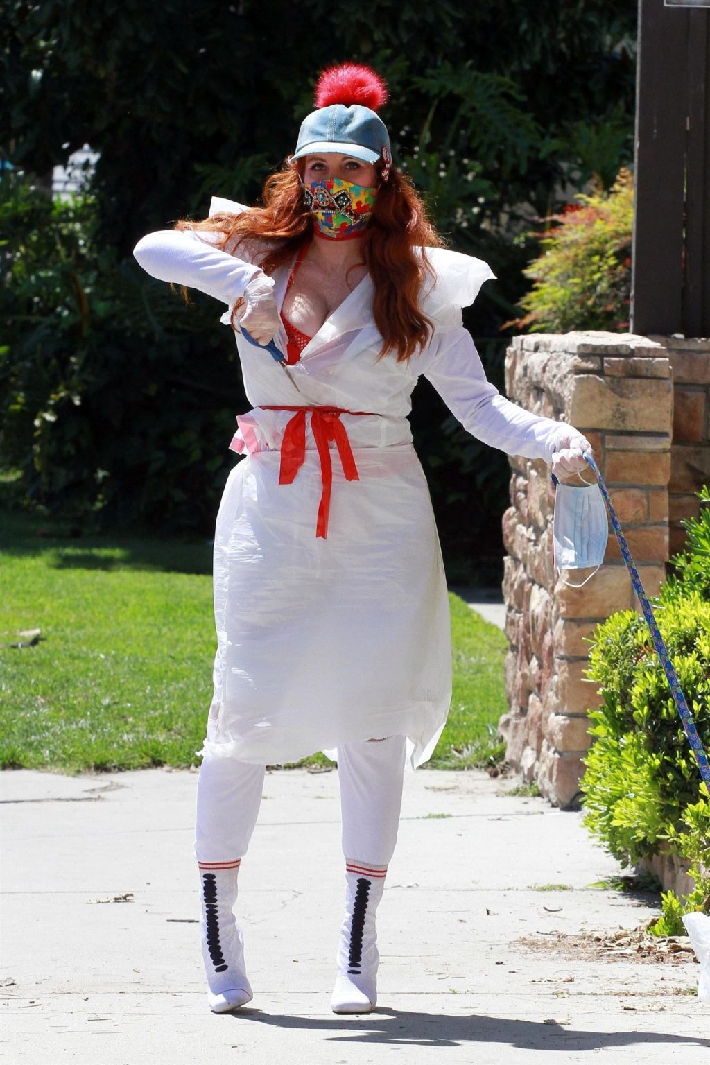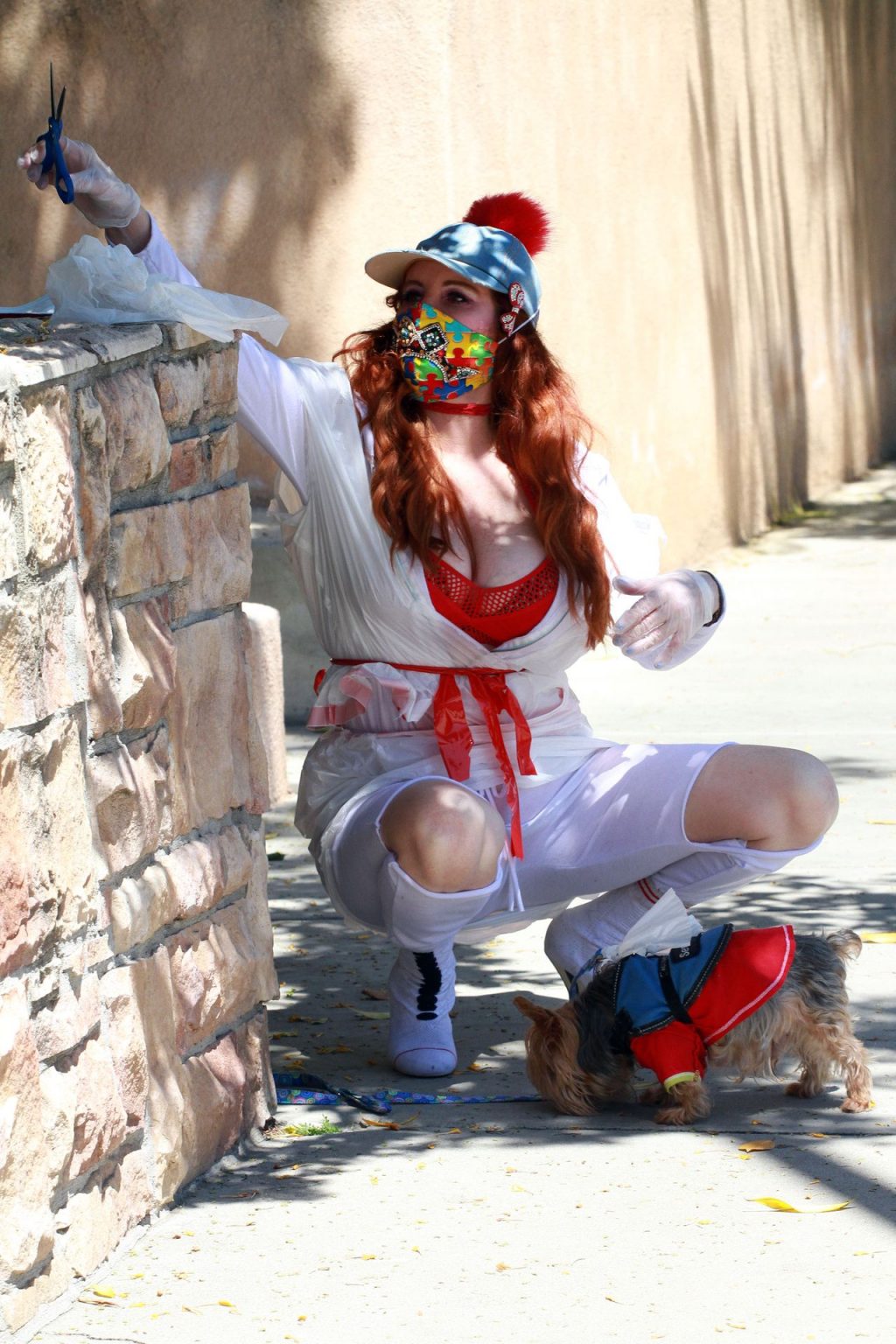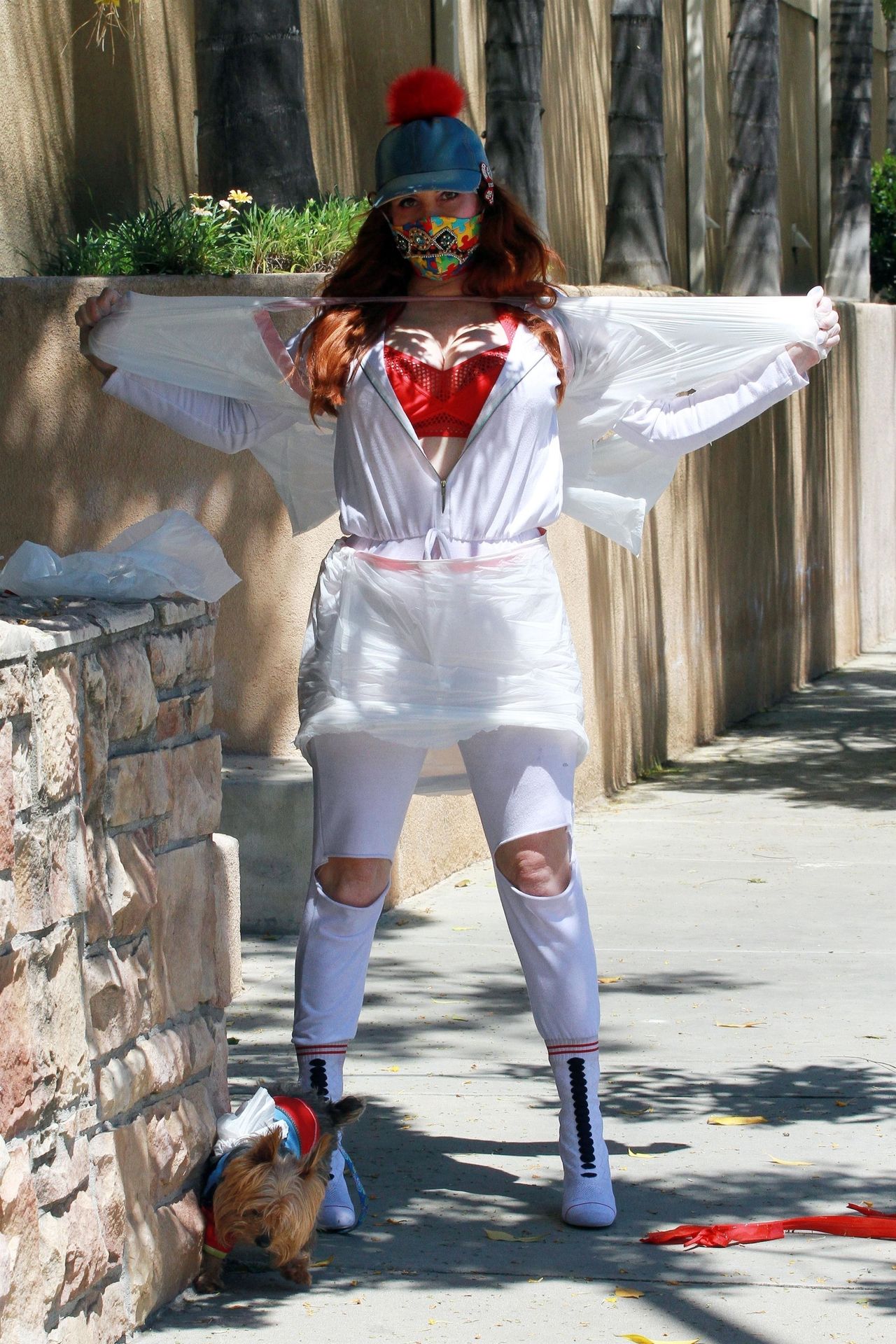 Actriz Phoebe Price es vista usando un vestido casero hecho de bolsas de basura de plástico en Los Ángeles, 15/04/2020.