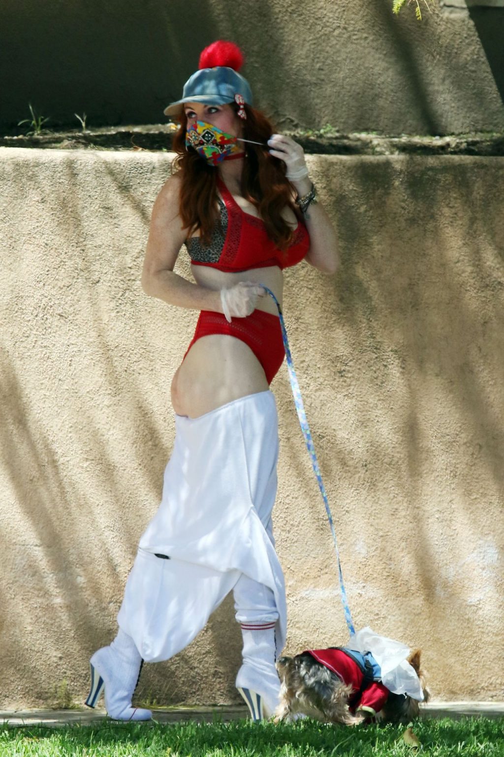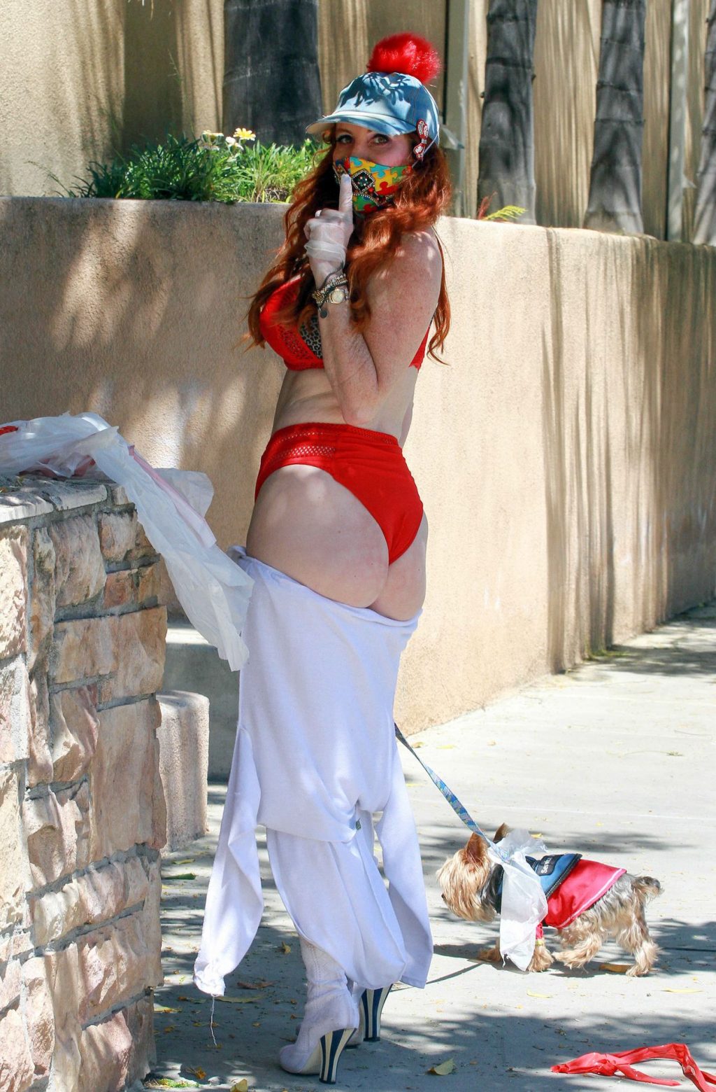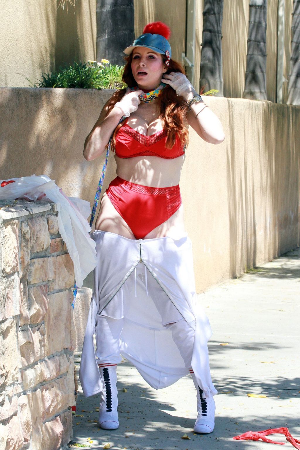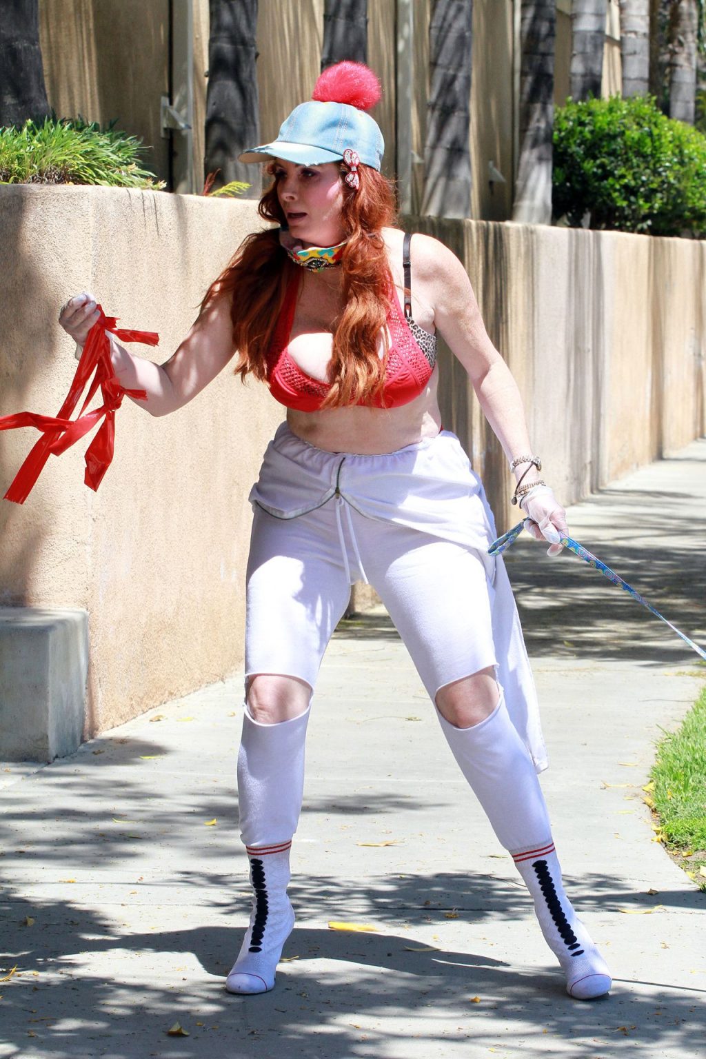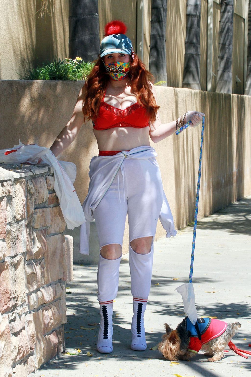Actriz Phoebe Price es vista usando un vestido casero hecho de bolsas de basura de plástico en Los Ángeles, 15/04/2020.