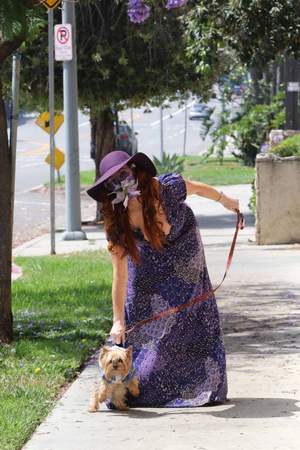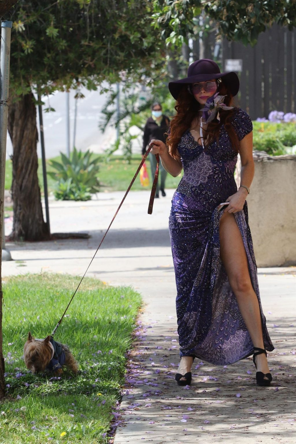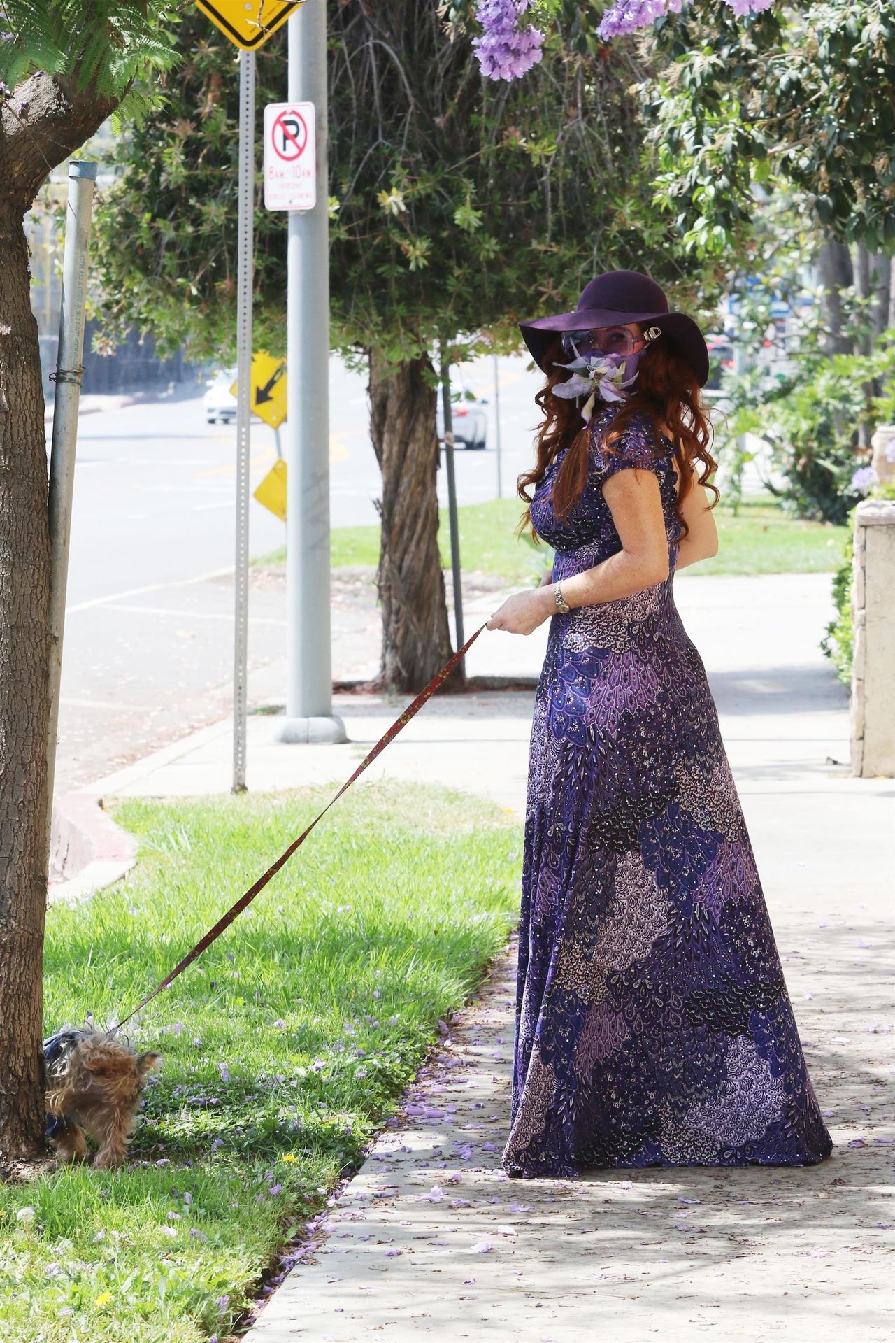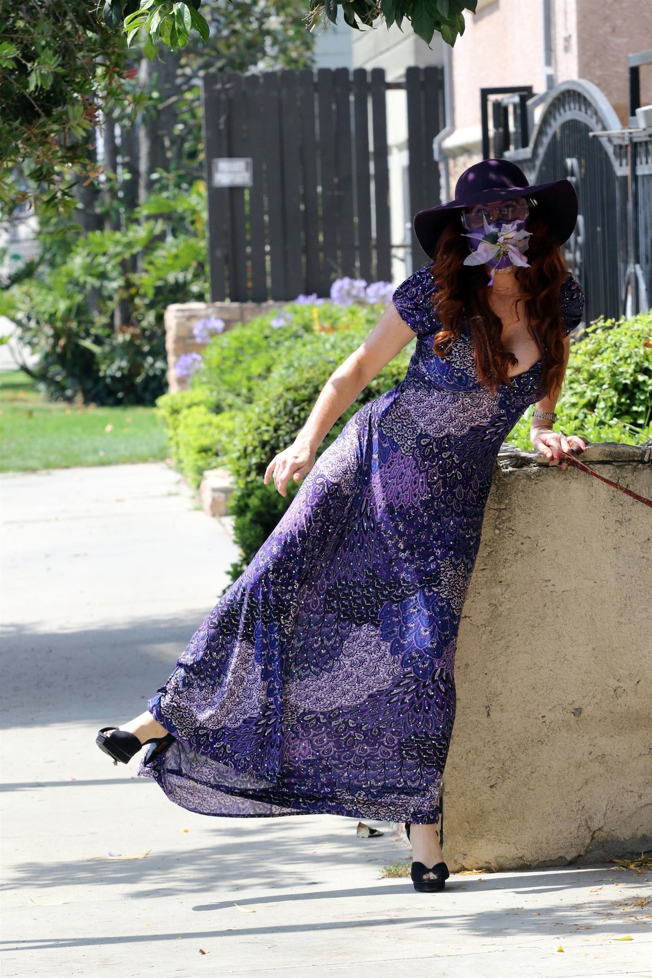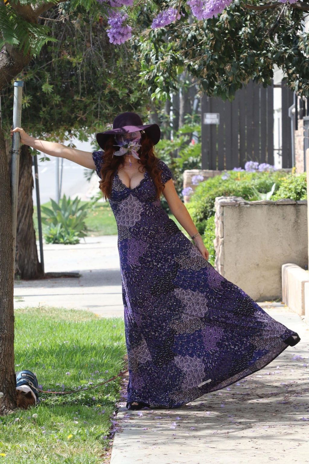 Busty Phoebe Price es vista paseando a su perro con un vestido completamente morado y hace algunos estiramientos antes de dirigirse en Los Ángeles, 22/06/2020.
