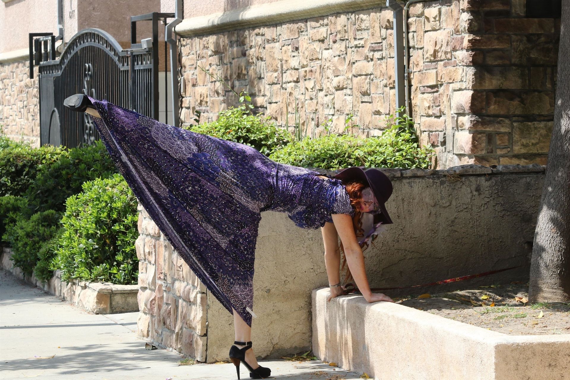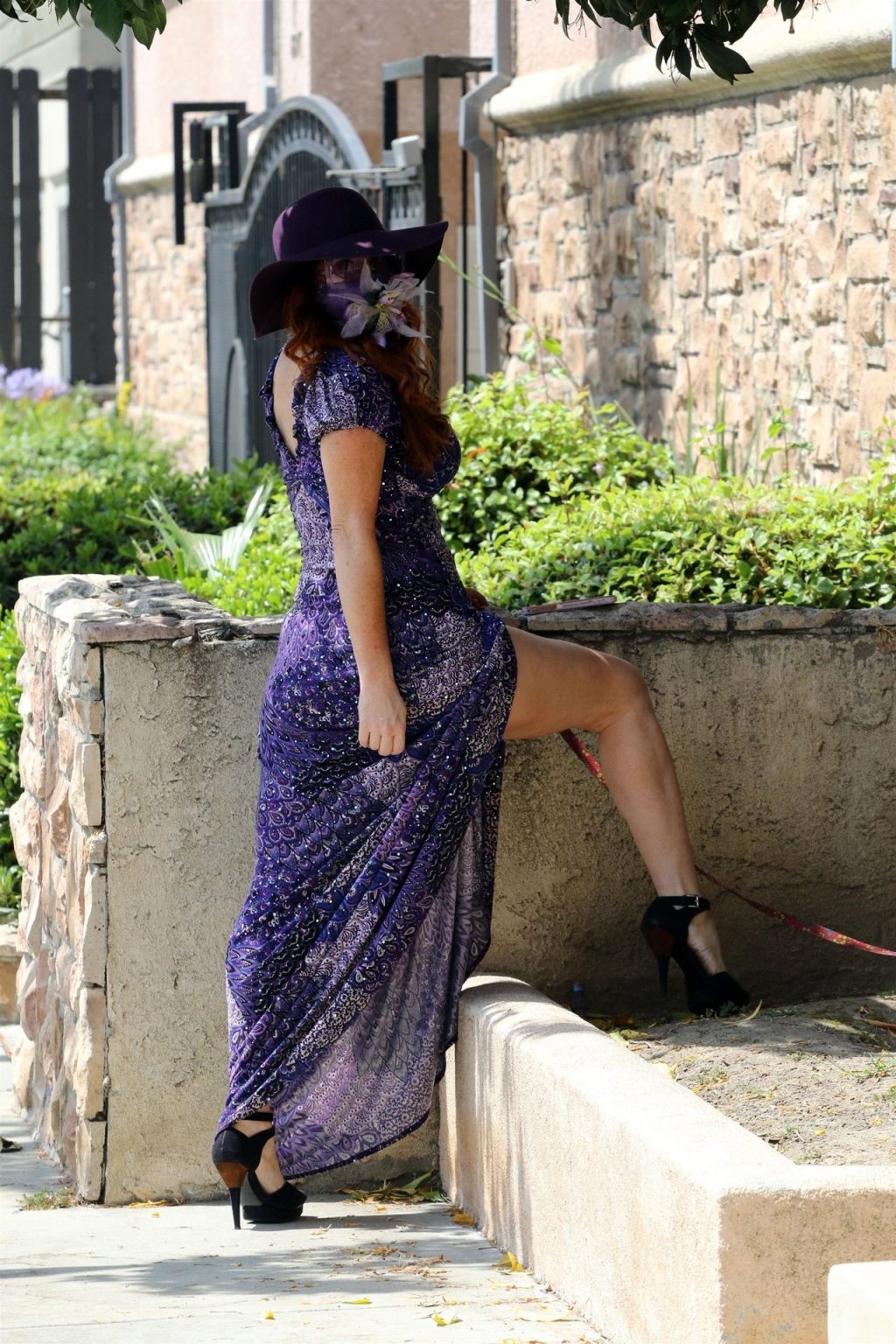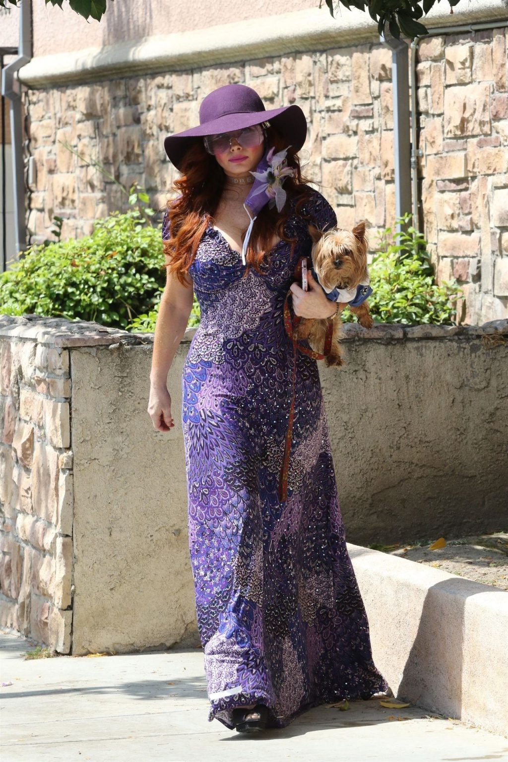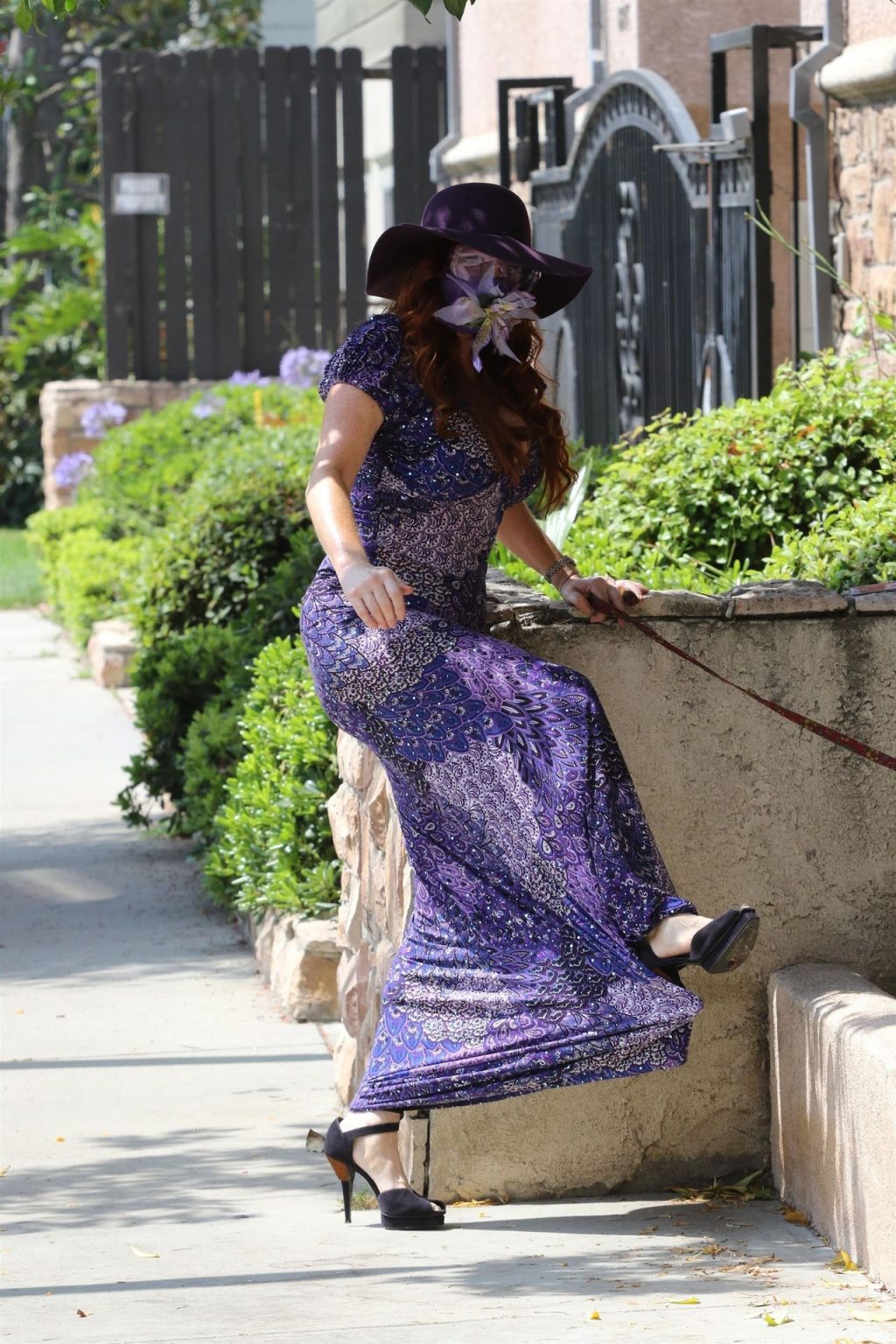 Busty Phoebe Price es vista paseando a su perro con un vestido completamente morado y hace algunos estiramientos antes de dirigirse en Los Ángeles, 22/06/2020.