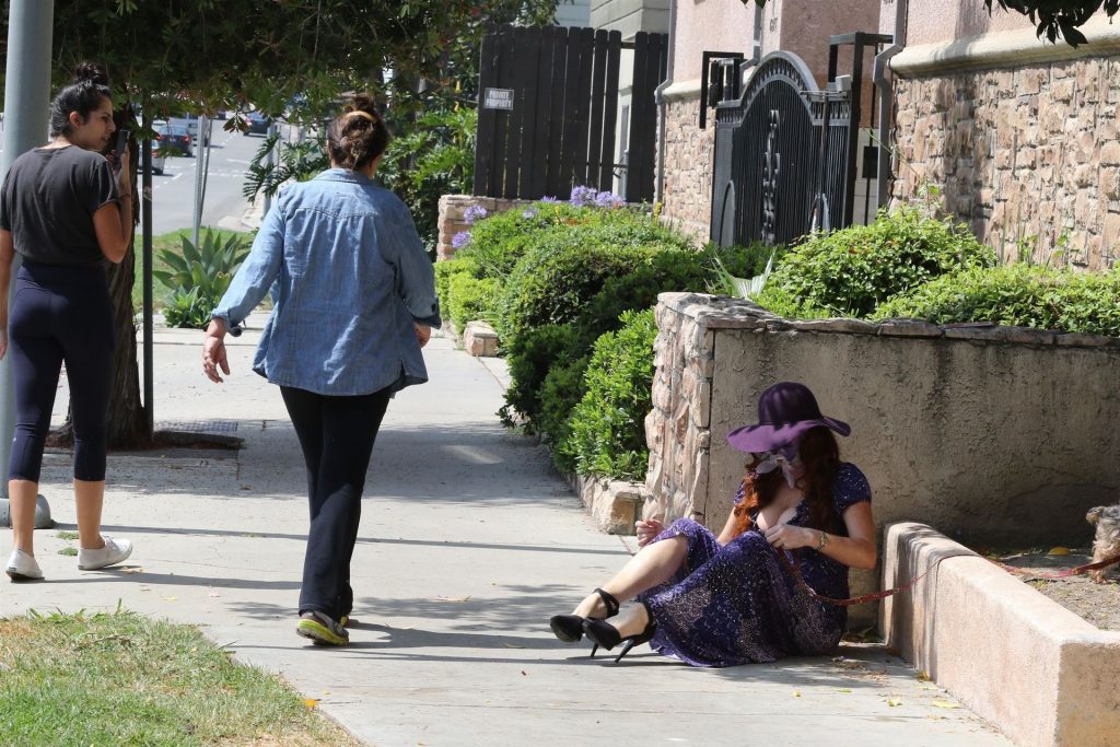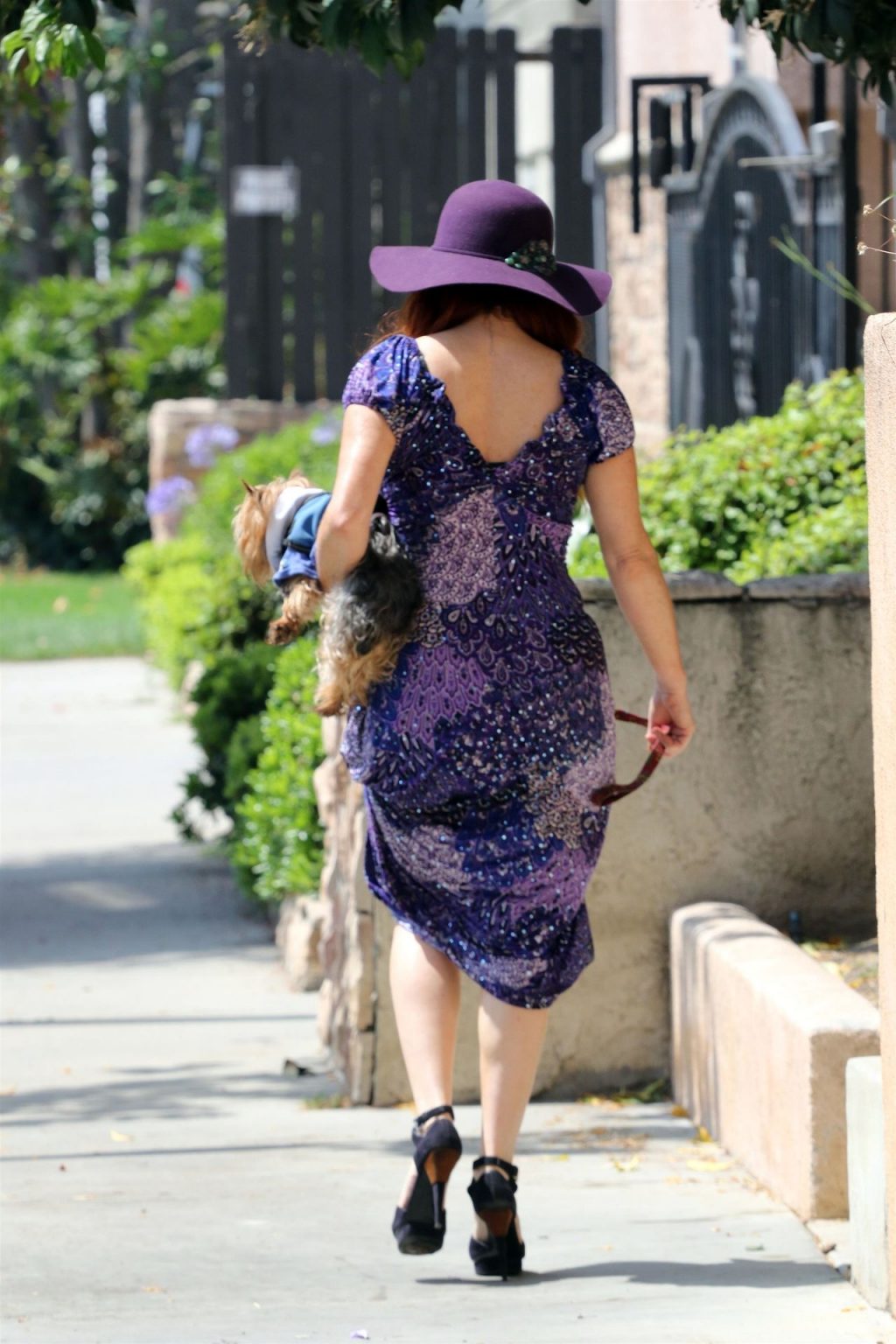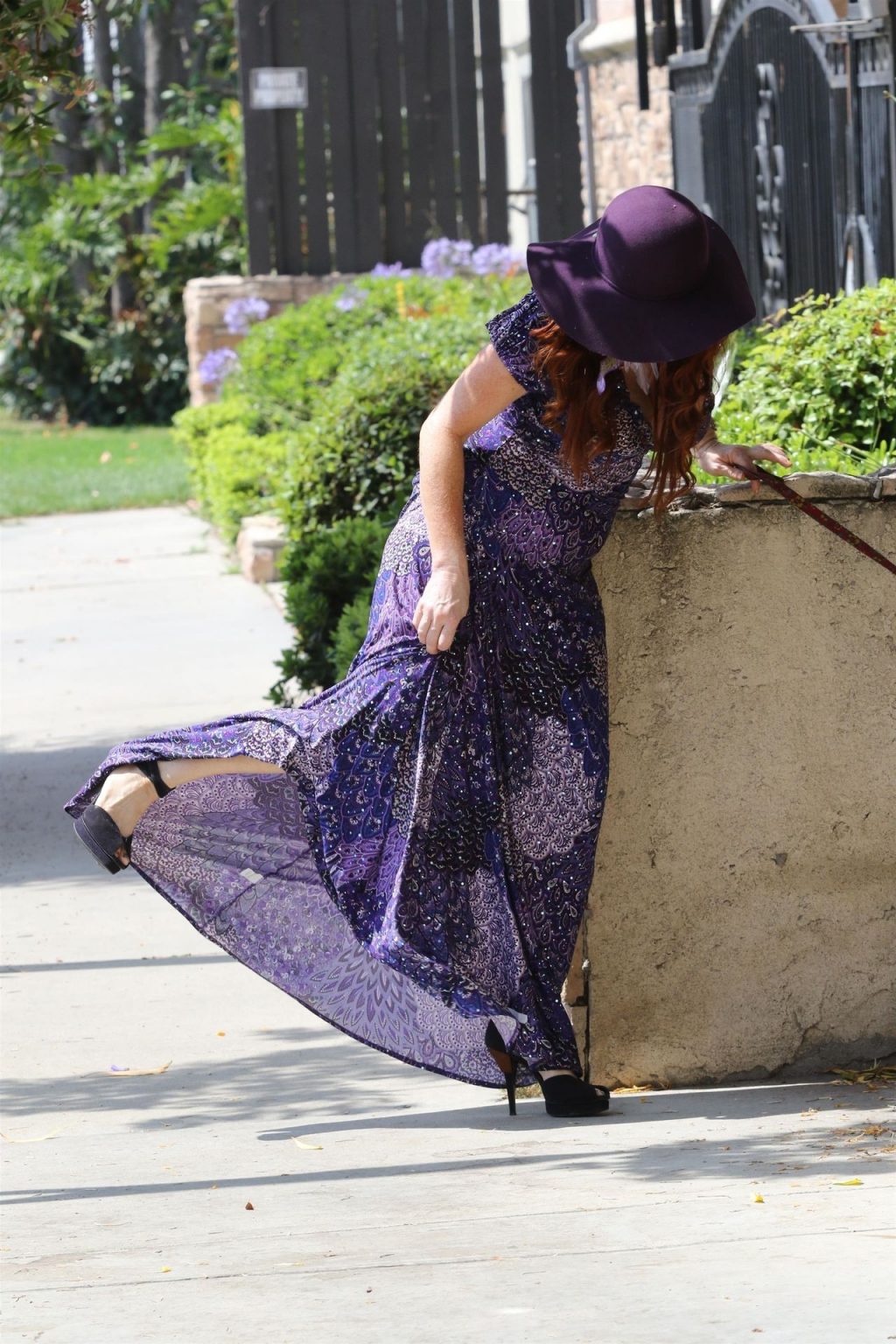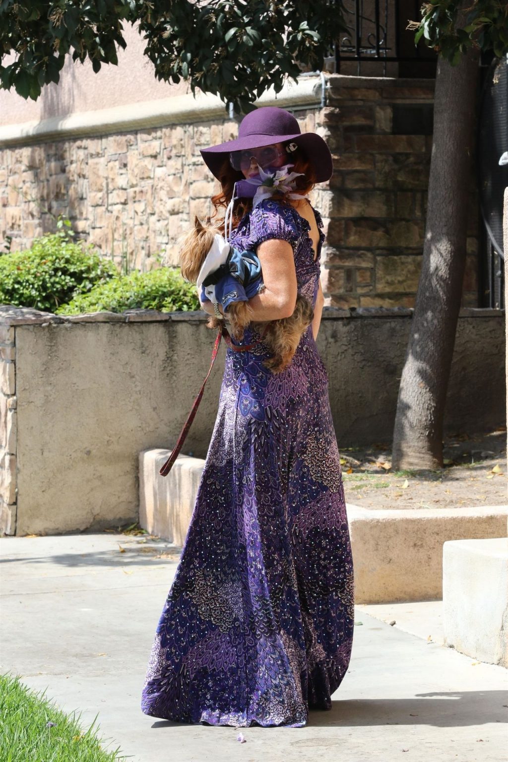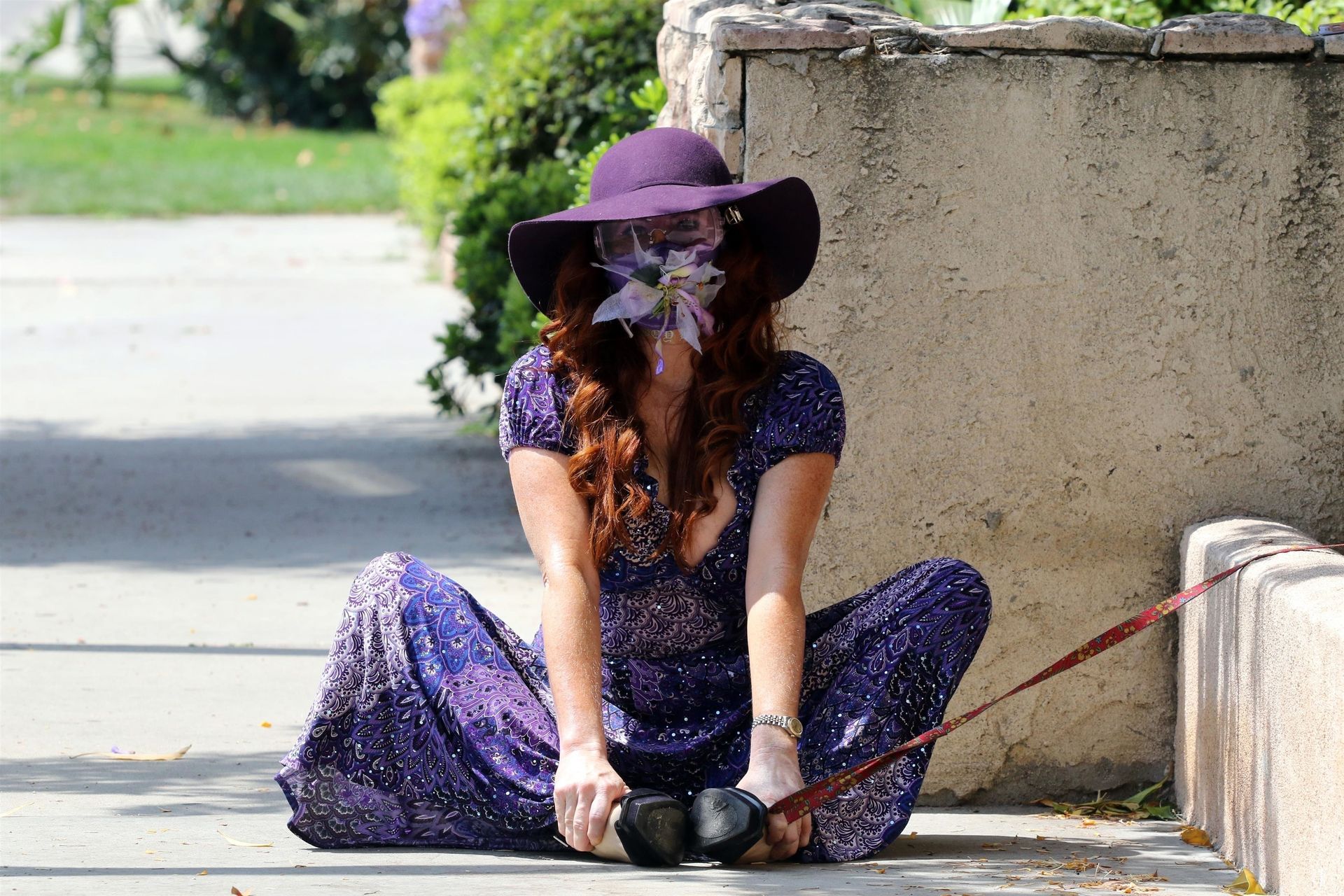 Busty Phoebe Price es vista paseando a su perro con un vestido completamente morado y hace algunos estiramientos antes de dirigirse en Los Ángeles, 22/06/2020.