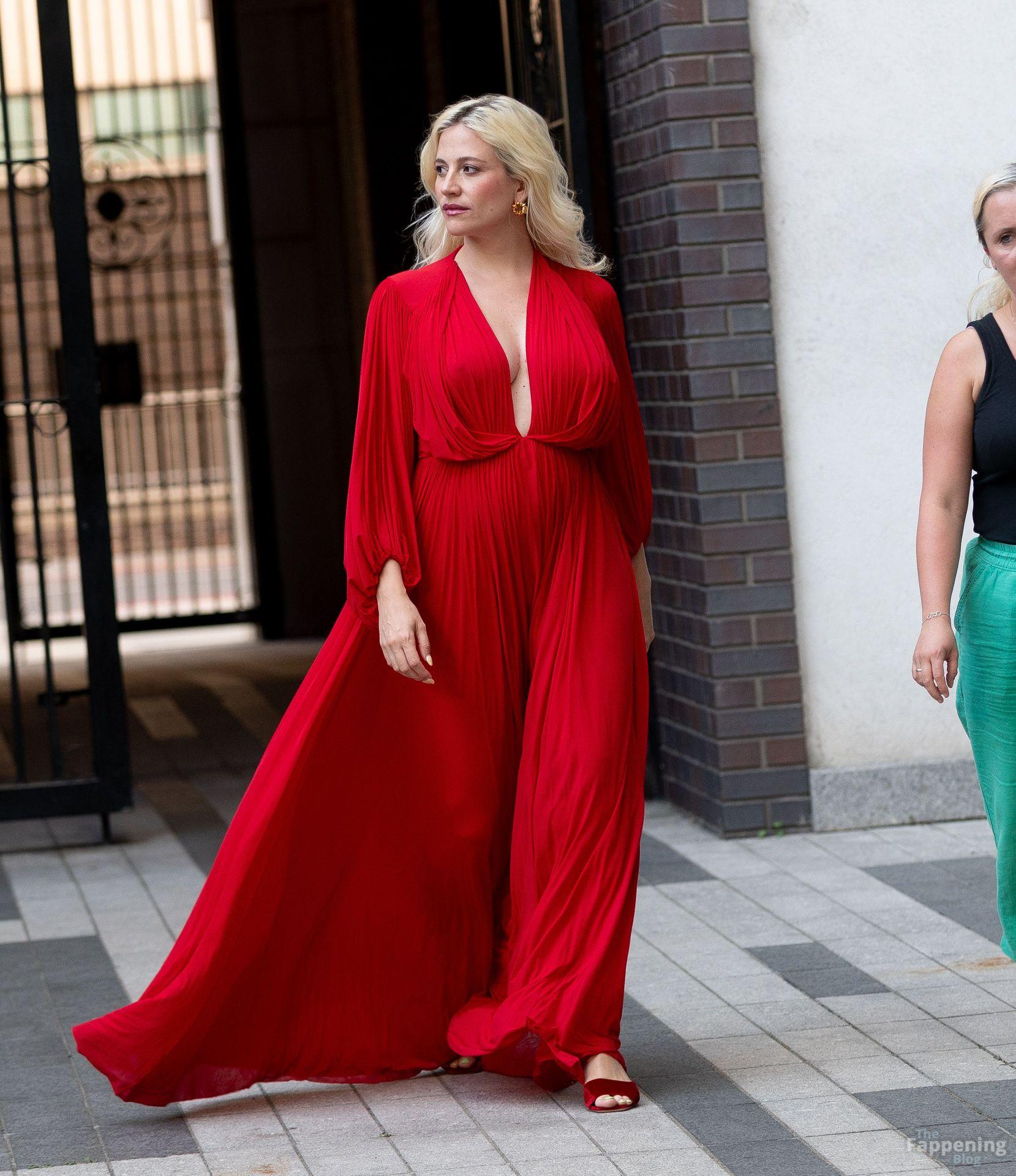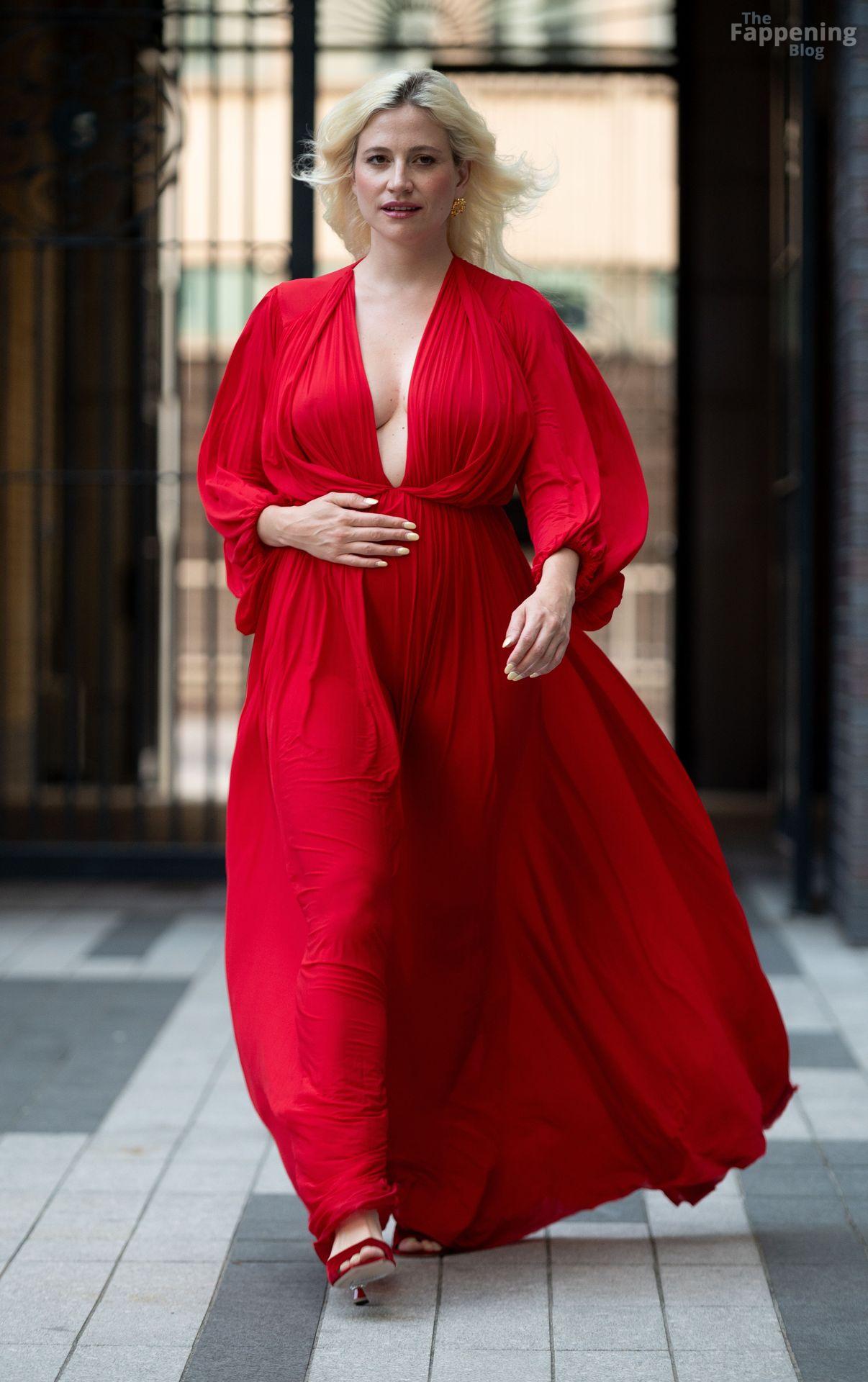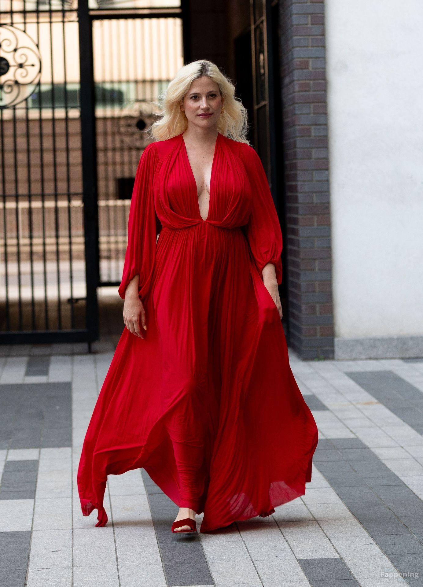 Pixie Lott está aquí, sin sujetador con un vestido rojo de escote profundo, mostrando su escote y sus pezones.
