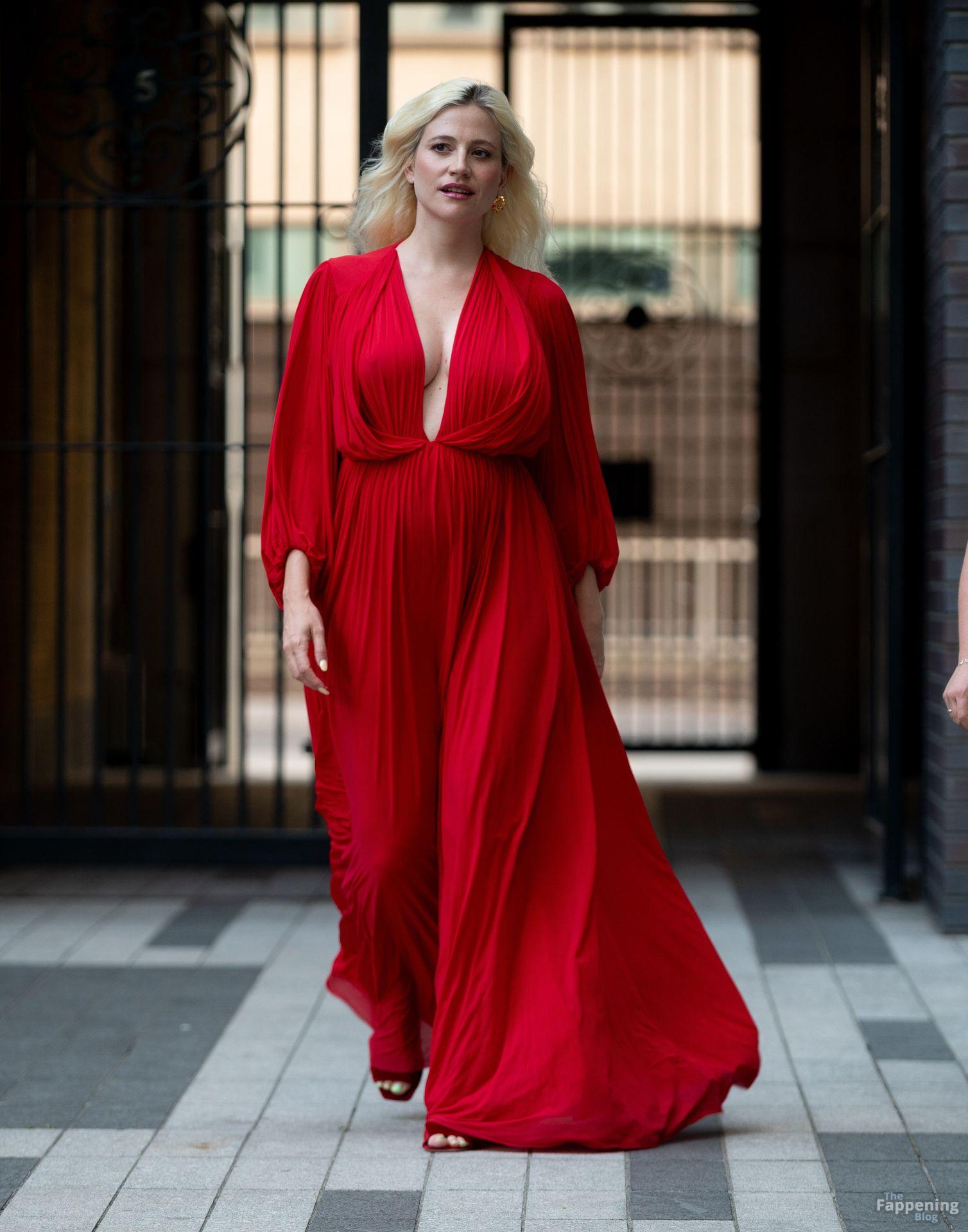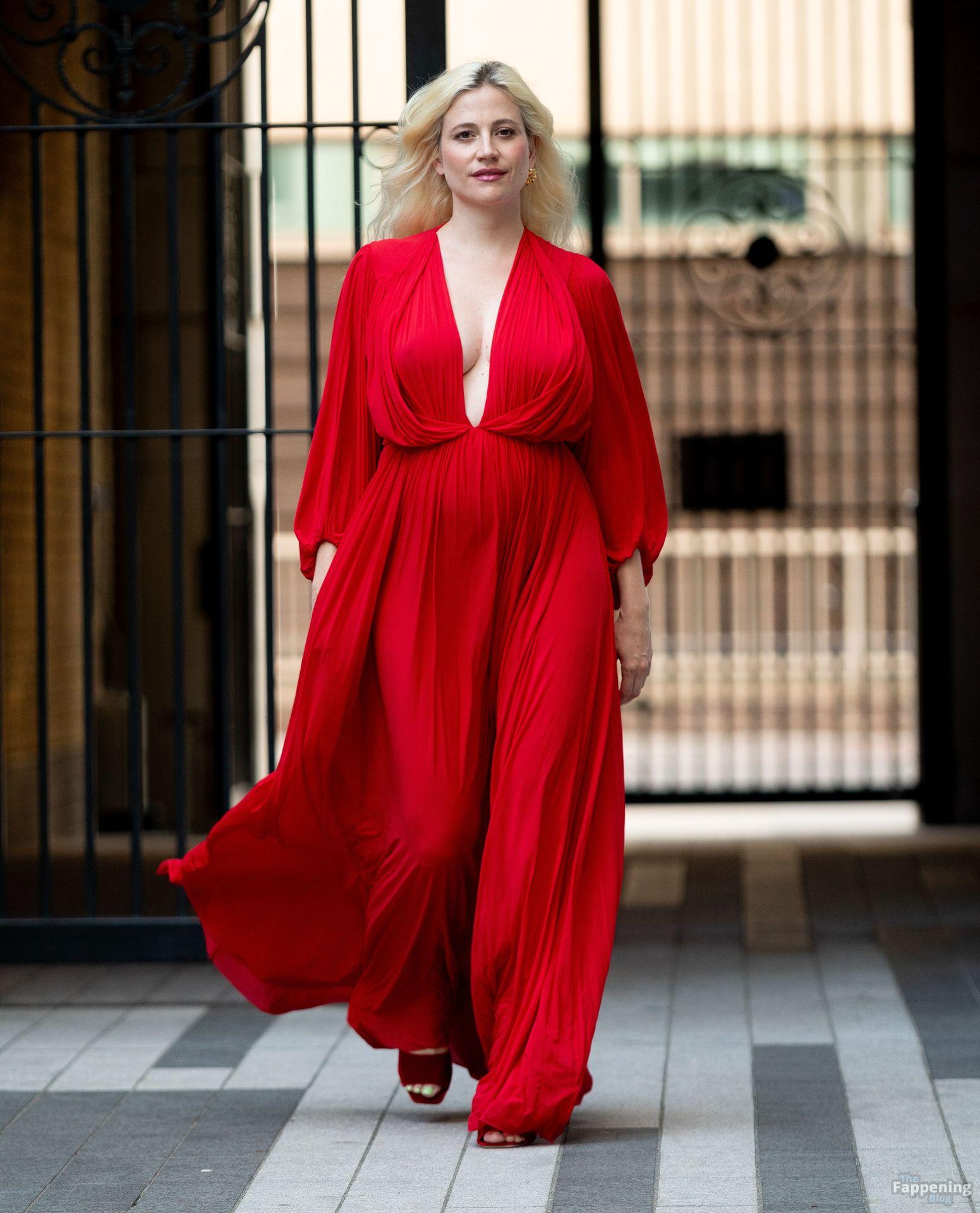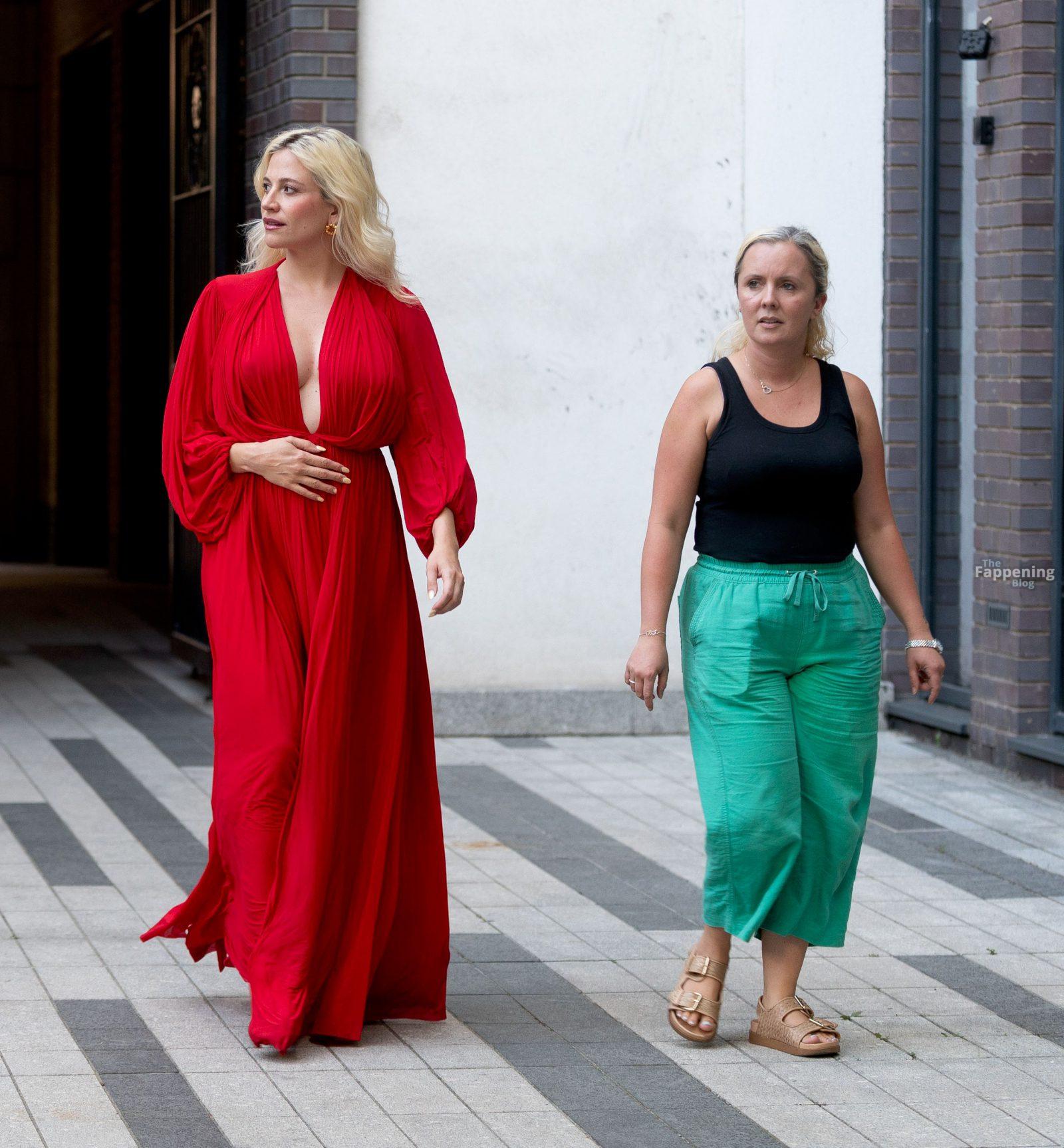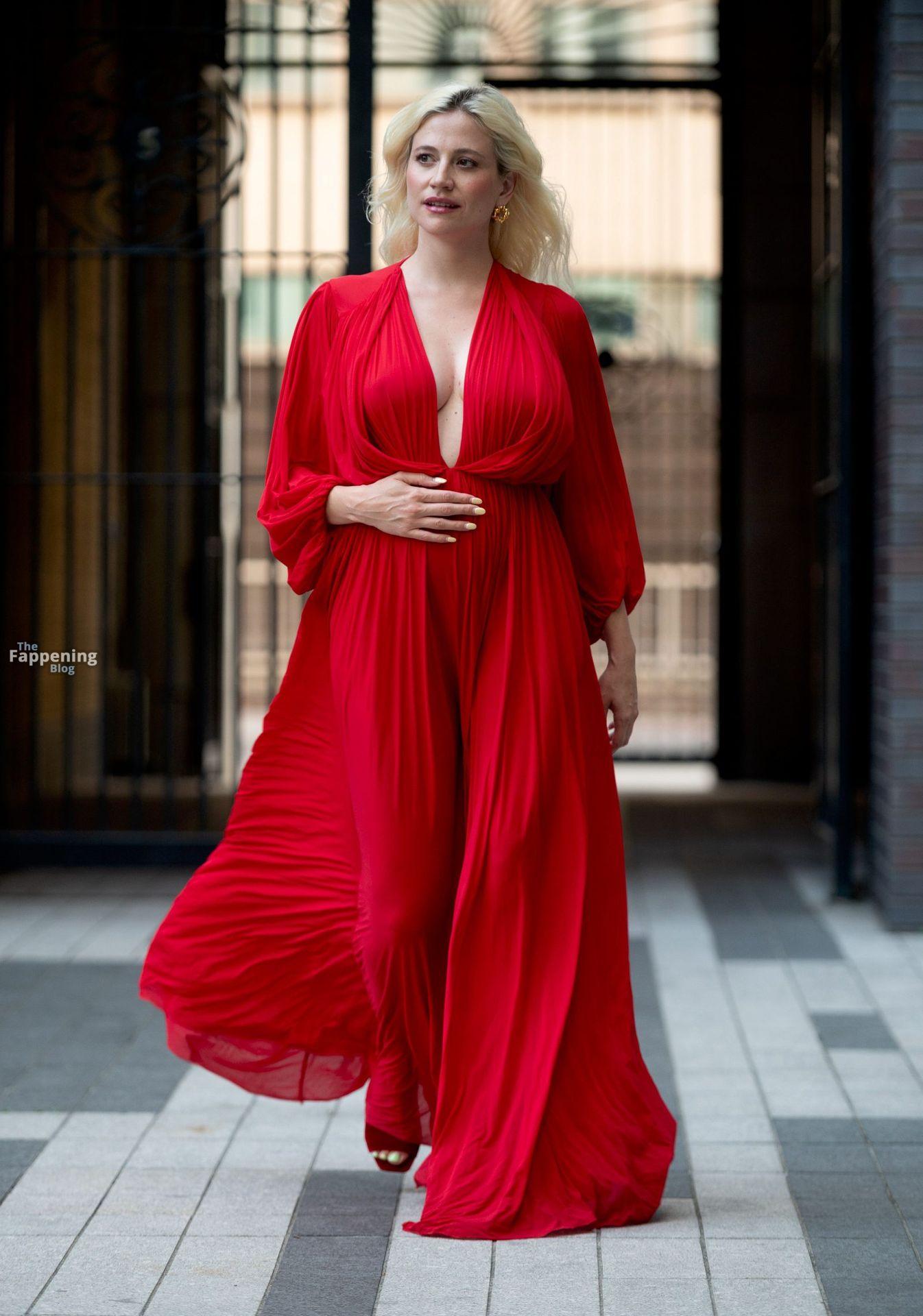 Pixie Lott está aquí, sin sujetador con un vestido rojo de escote profundo, mostrando su escote y sus pezones.