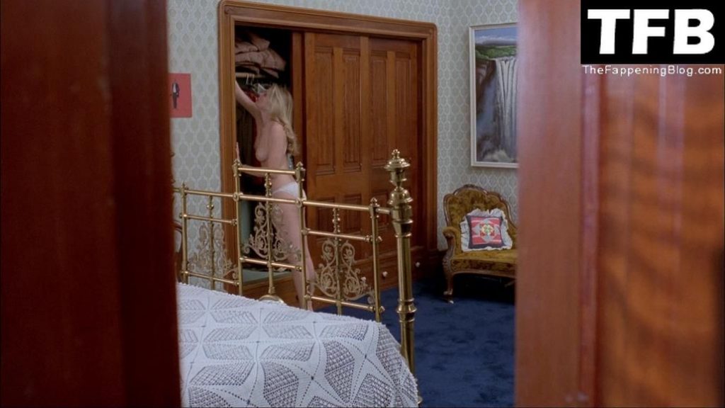 Priscilla Barnes está en un dormitorio cuando la vemos por primera vez con una camisa desabotonada y ropa interior visible debajo. Luego camina hacia un armario y se quita la camisa, quedando sin camiseta.