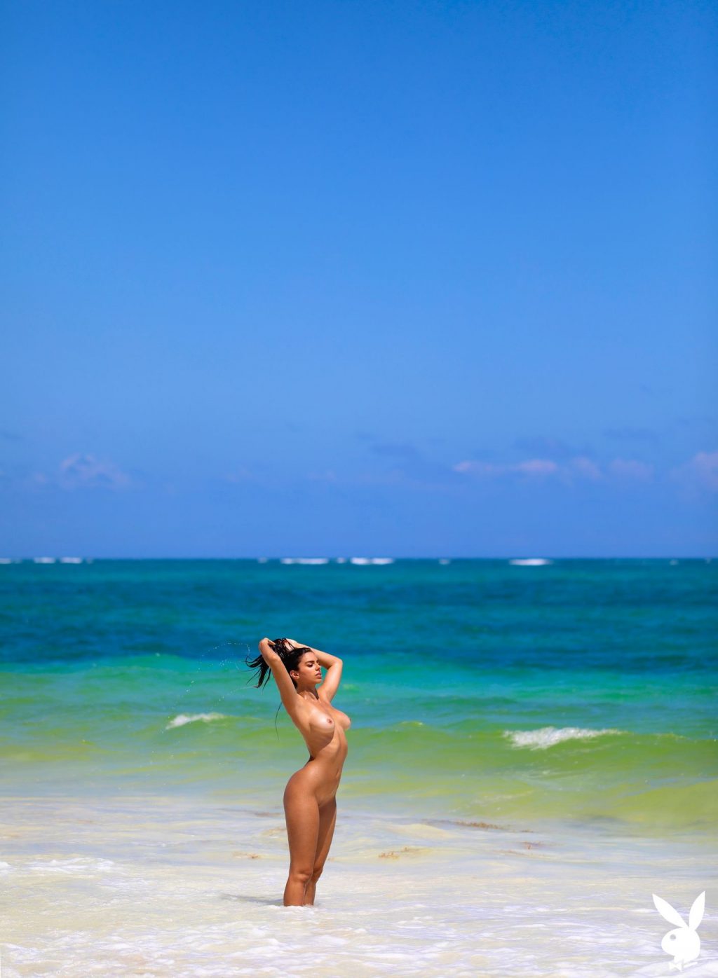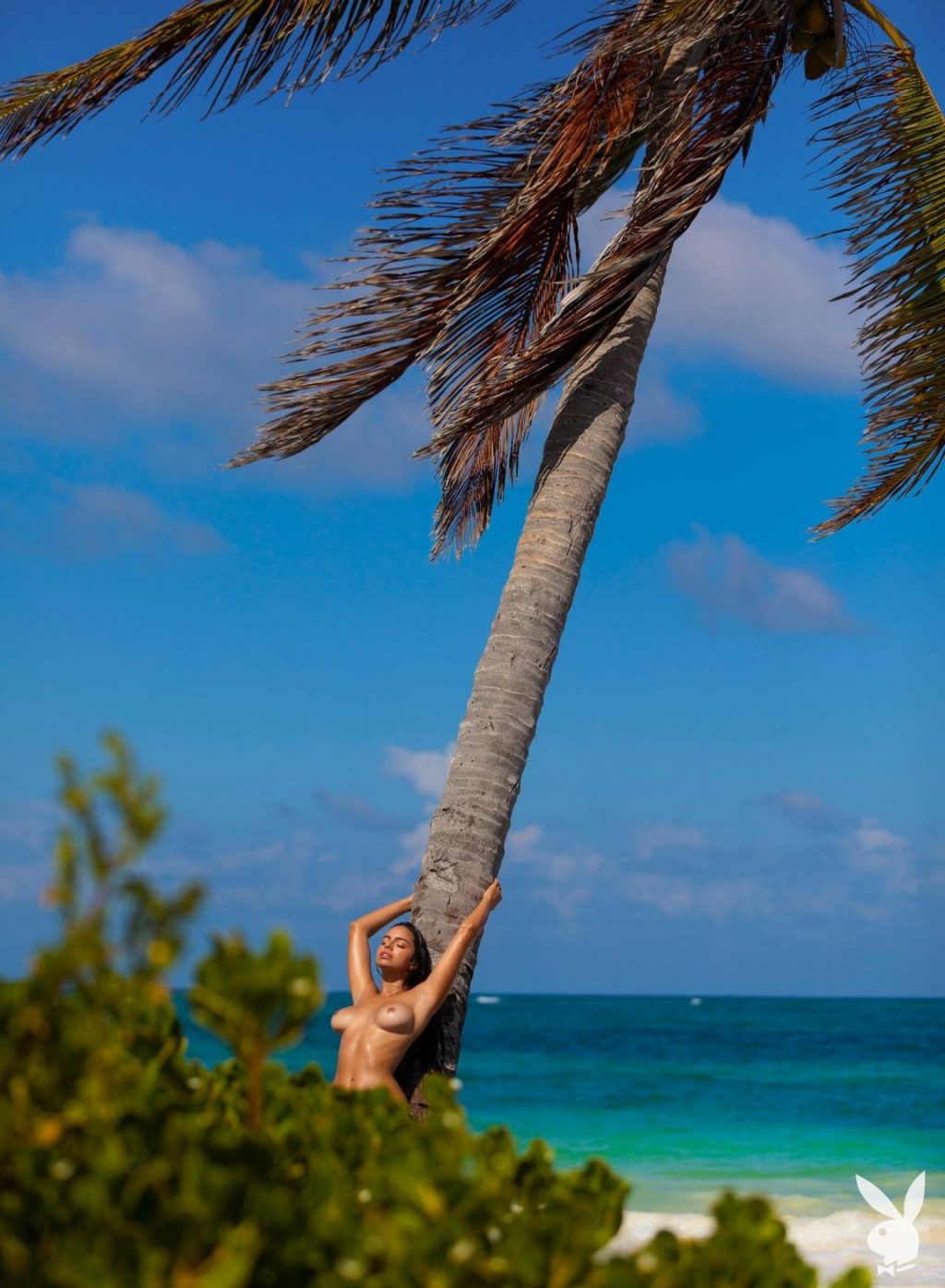 Priscilla Huggins Ortiz muestra su cuerpo desnudo y ardiente en la playa de Tulum, México en una sesión de fotos realizada por Ana Dias para Playboy (2020).