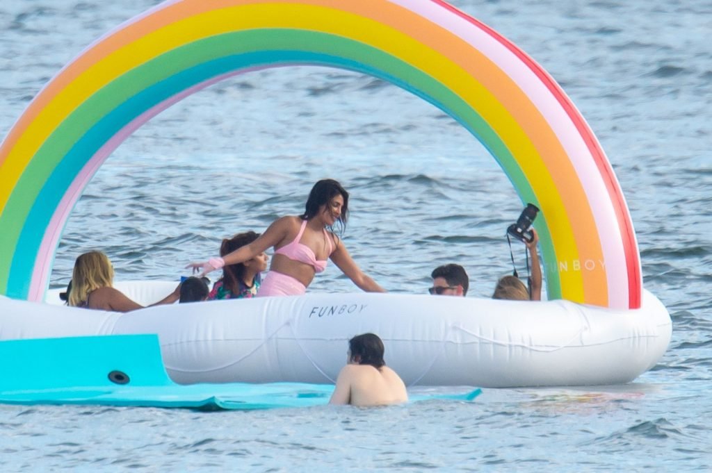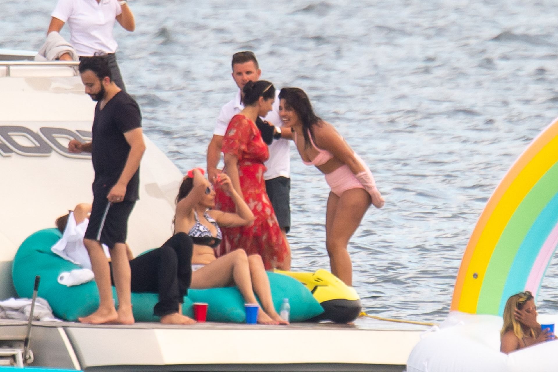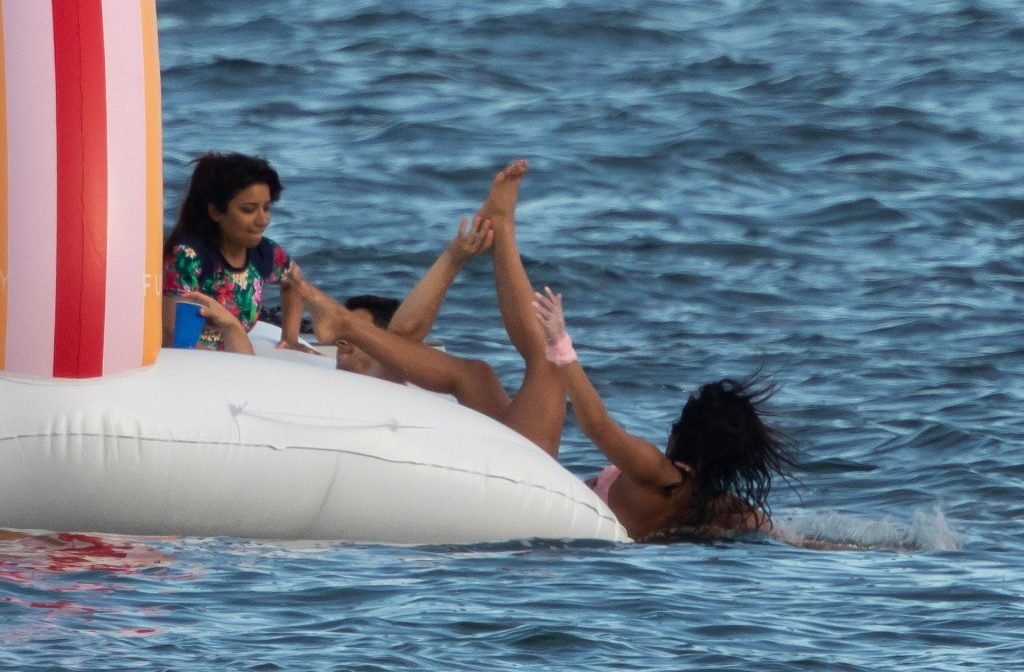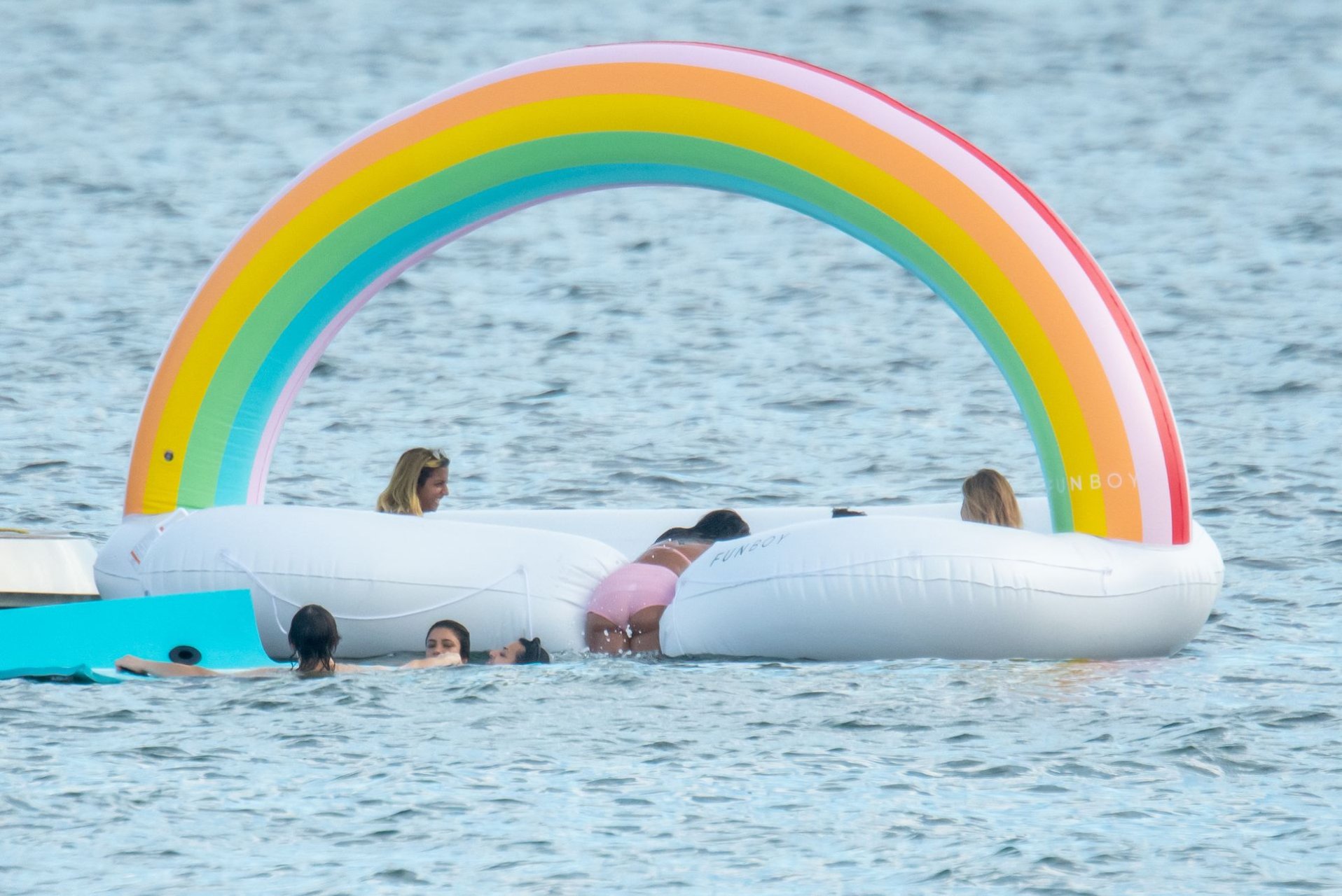 Luego se unieron a un barco aún más grande, el Groot, propiedad del rey de la vida nocturna de Miami David Grutman, y juntos se dirigieron a las aguas frente a Key Biscayne donde echaron el ancla y sacaron algunos juguetes acuáticos, incluyendo un gran flotador inflable con un arcoíris y una moto acuática.