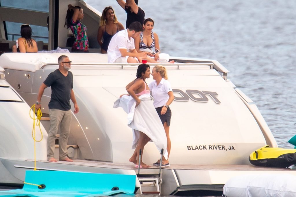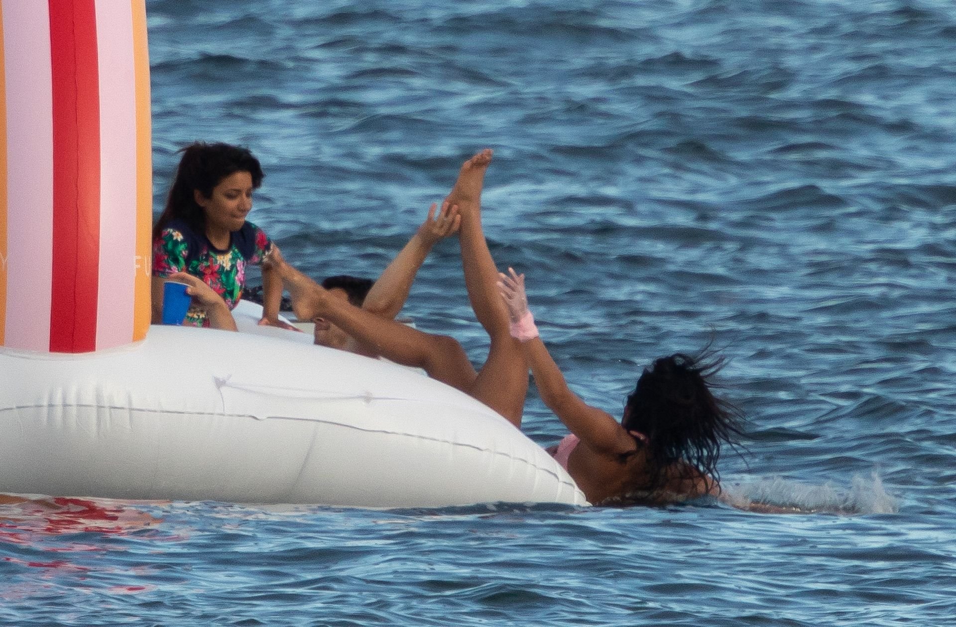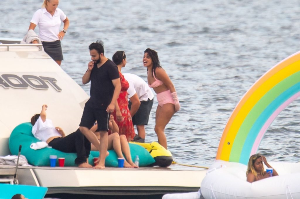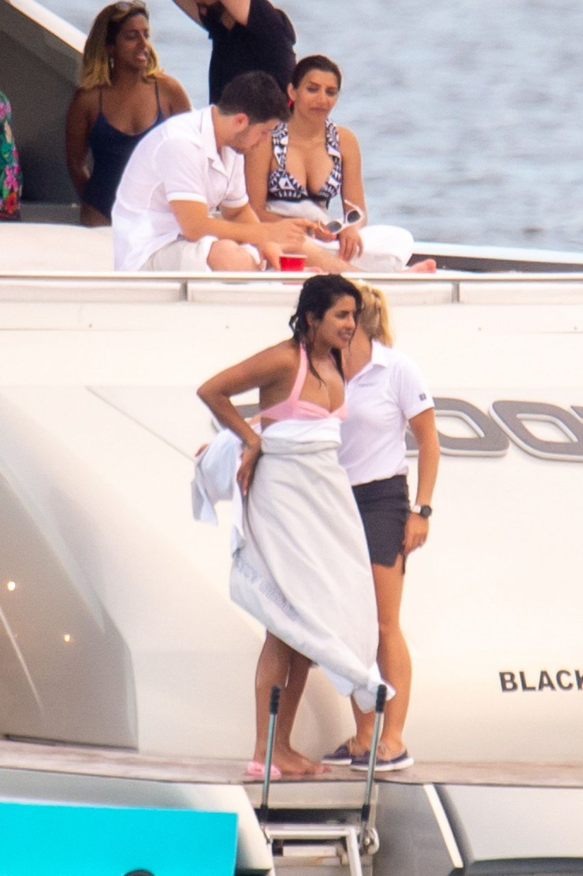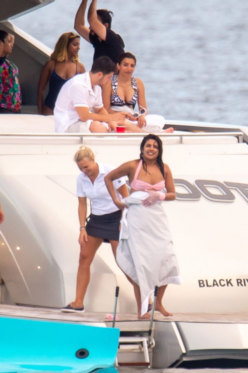Priyanka se cambió a una combinación inusual de traje de baño de dos piezas rosa de cintura alta con guantes a juego antes de recorrer la bahía en la moto acuática. Hubo muchas risas cuando cayó al agua, luchó por subirse al flotador y en un momento pareció ajustarse el bikini. La pareja se veía tan enamorada como siempre, charlando, abrazándose, besándose y turnándose para sentarse en el regazo del otro. Más tarde, al irse por el día, se les vio a ambos fumando y charlando con sus amigos en la cubierta.