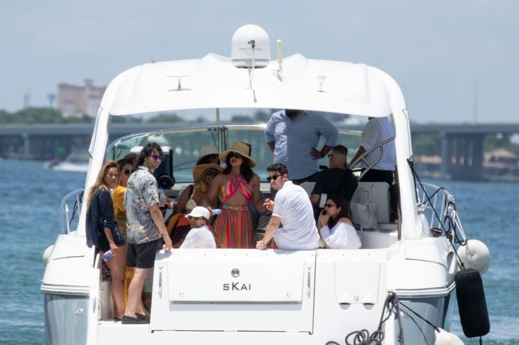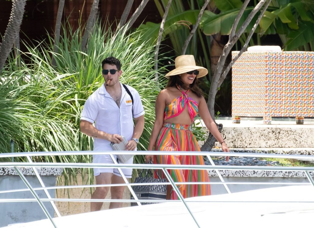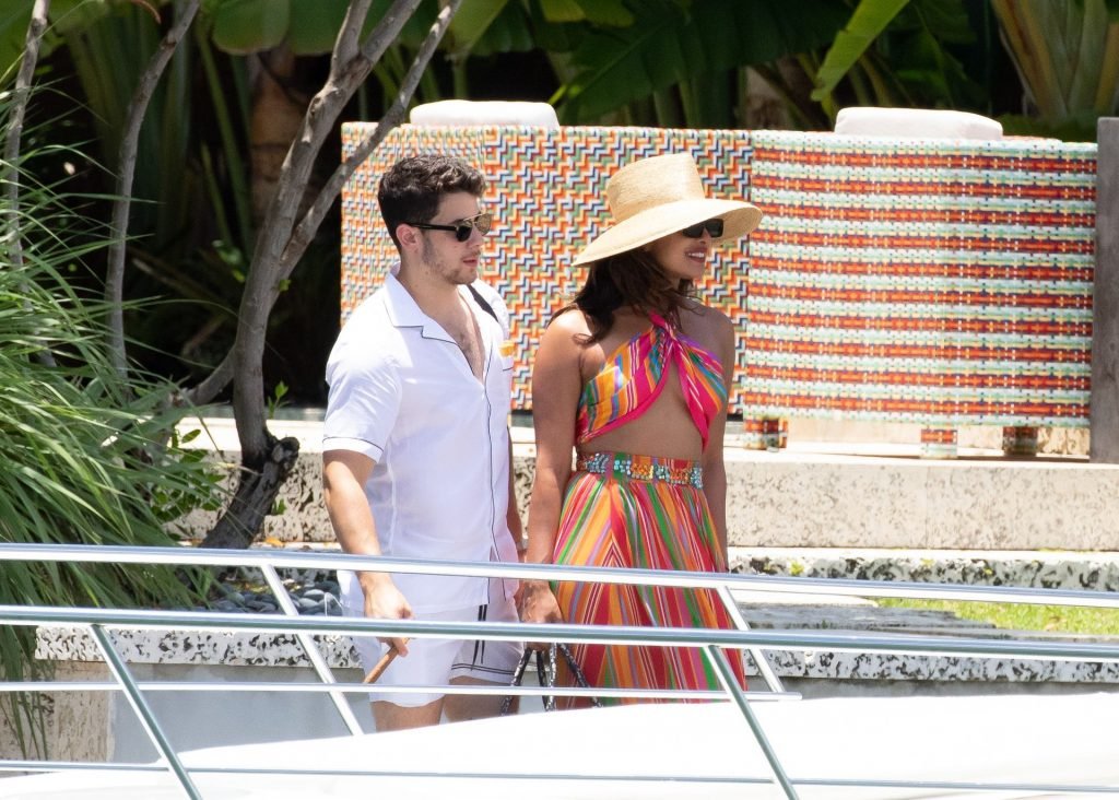 Después de una fiesta nocturna en el club Liv, Nick y Priyanka subieron a un impresionante yate en la tarde del viernes. La actriz fue fotografiada con un conjunto de dos piezas a rayas coloridas compuesto por una falda larga y un top revelador tipo bikini combinado con un gran sombrero.