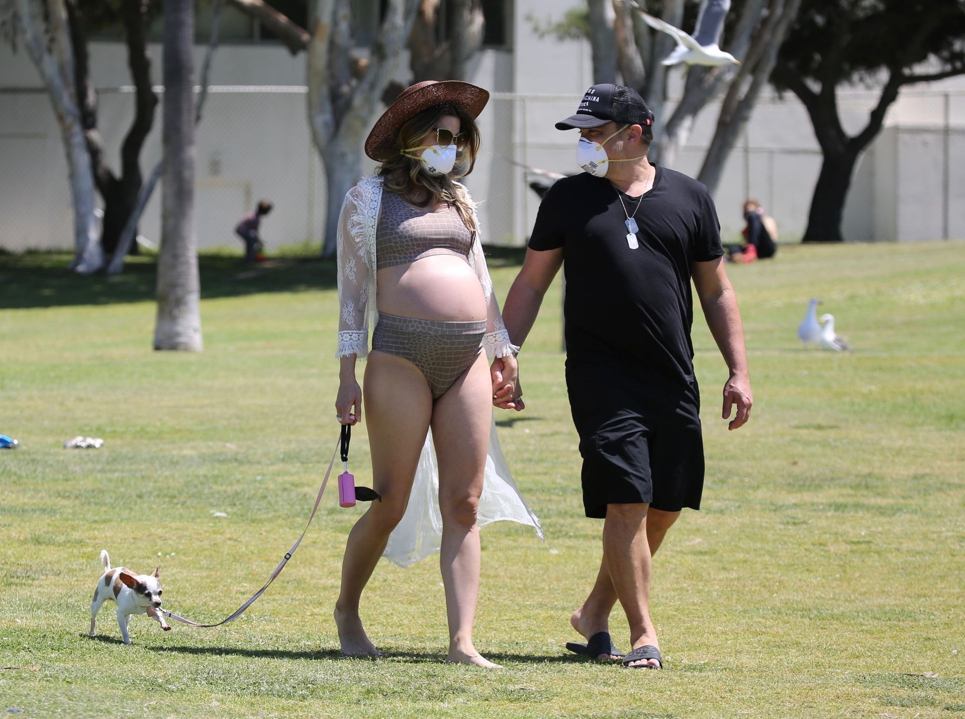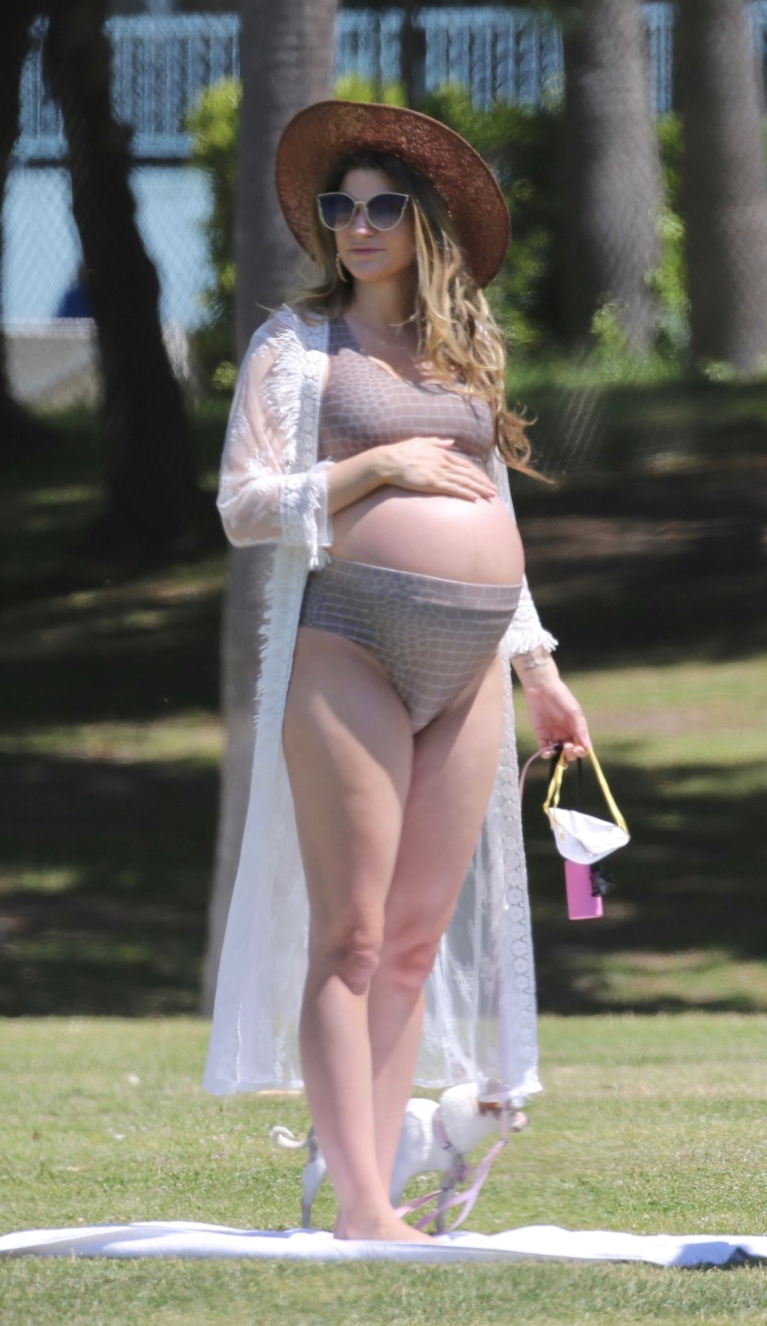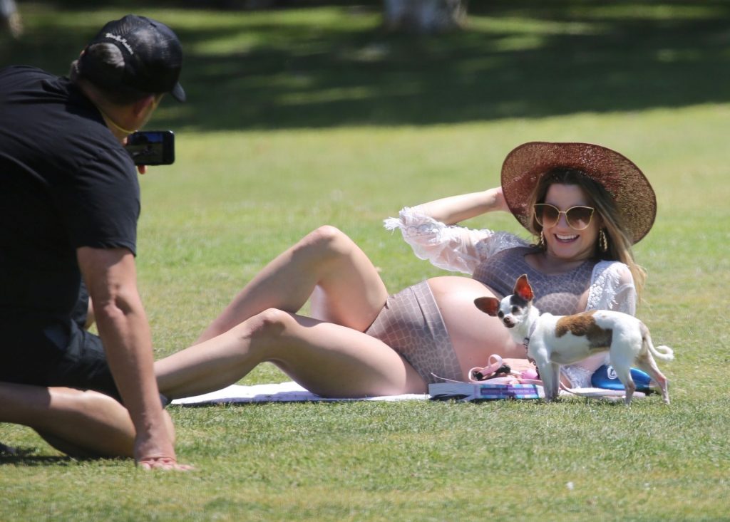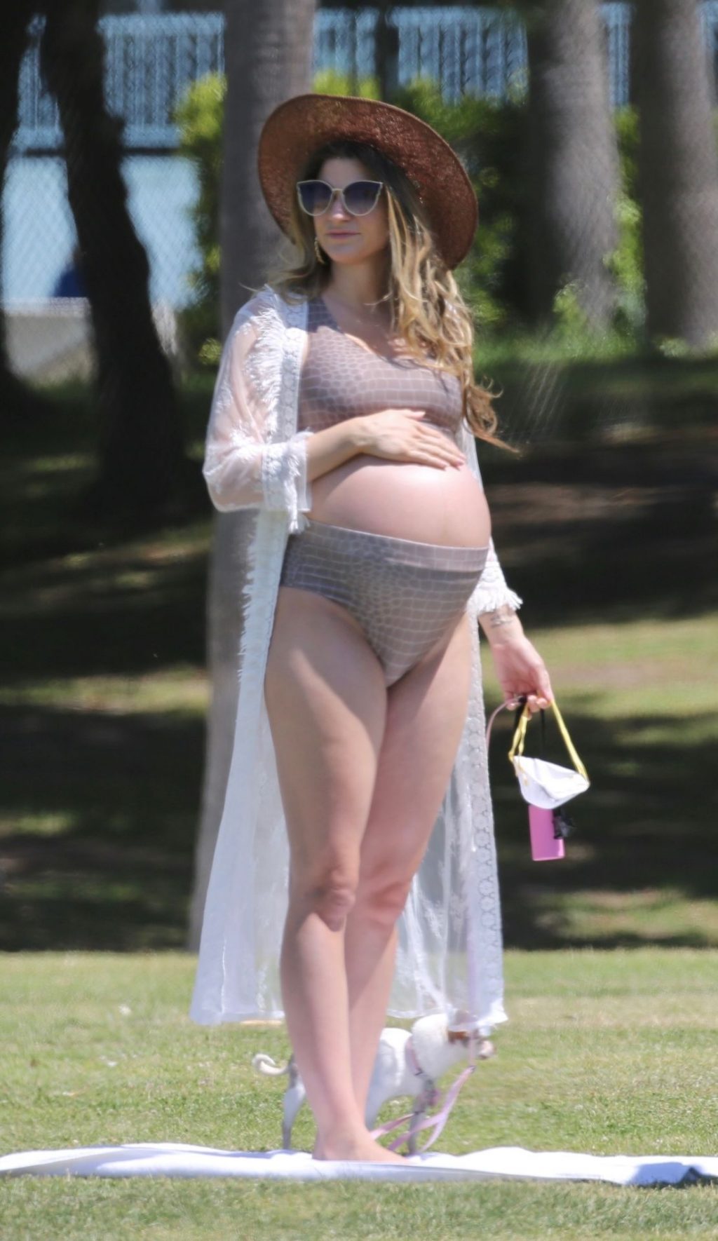 La futura madre fue vista en un parque abierto cerca de la playa con un bikini. El bikini con estampado de serpiente se combinó con una bata blanca para el sol, un sombrero marrón y la infame mascarilla N95. Se la vio con su esposo Rick Shirmer tomando el sol, jugando con su cachorro y leyendo un libro sobre el embarazo.