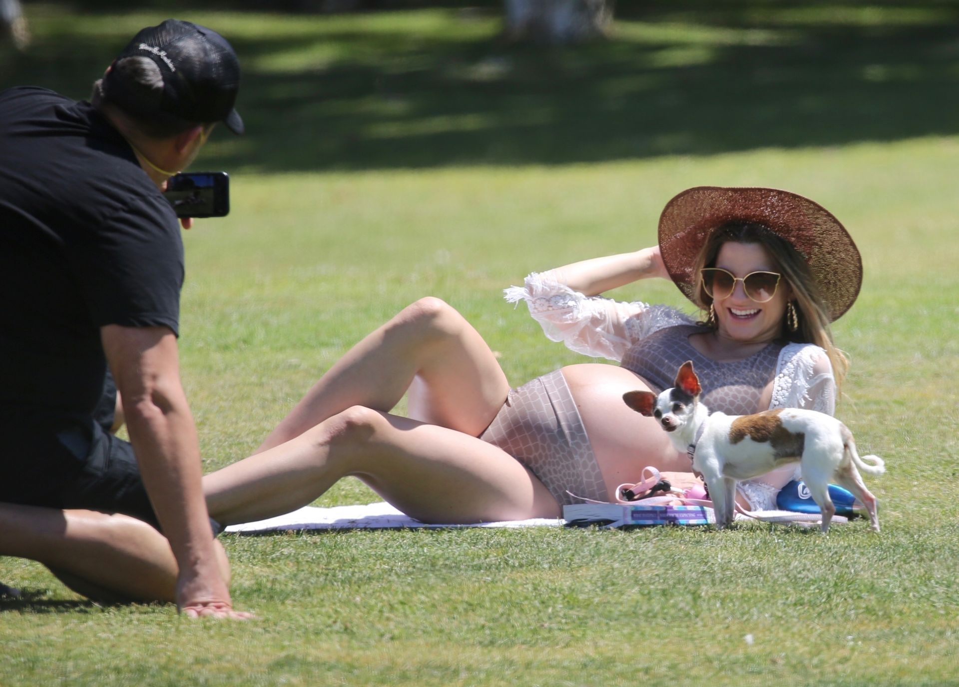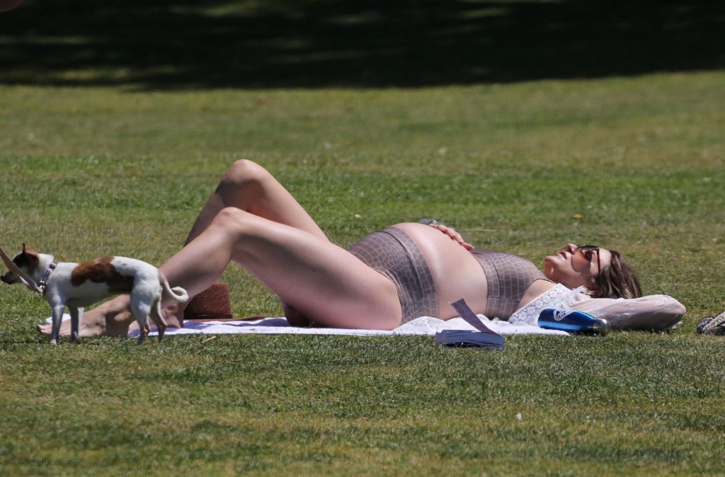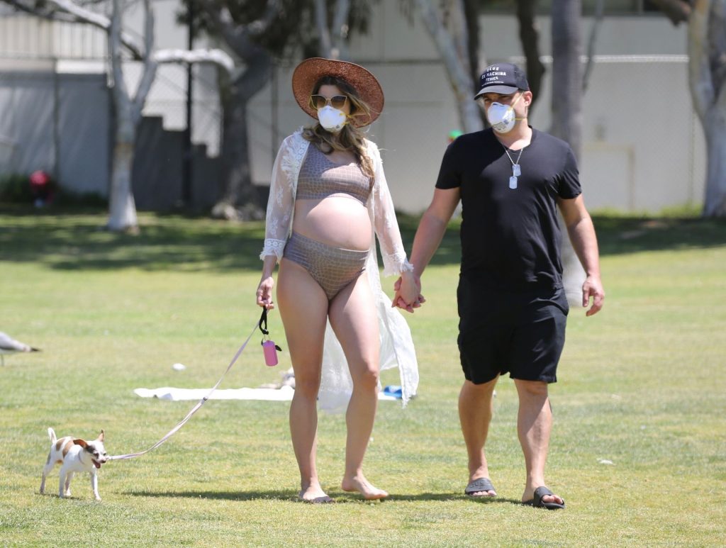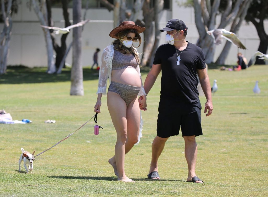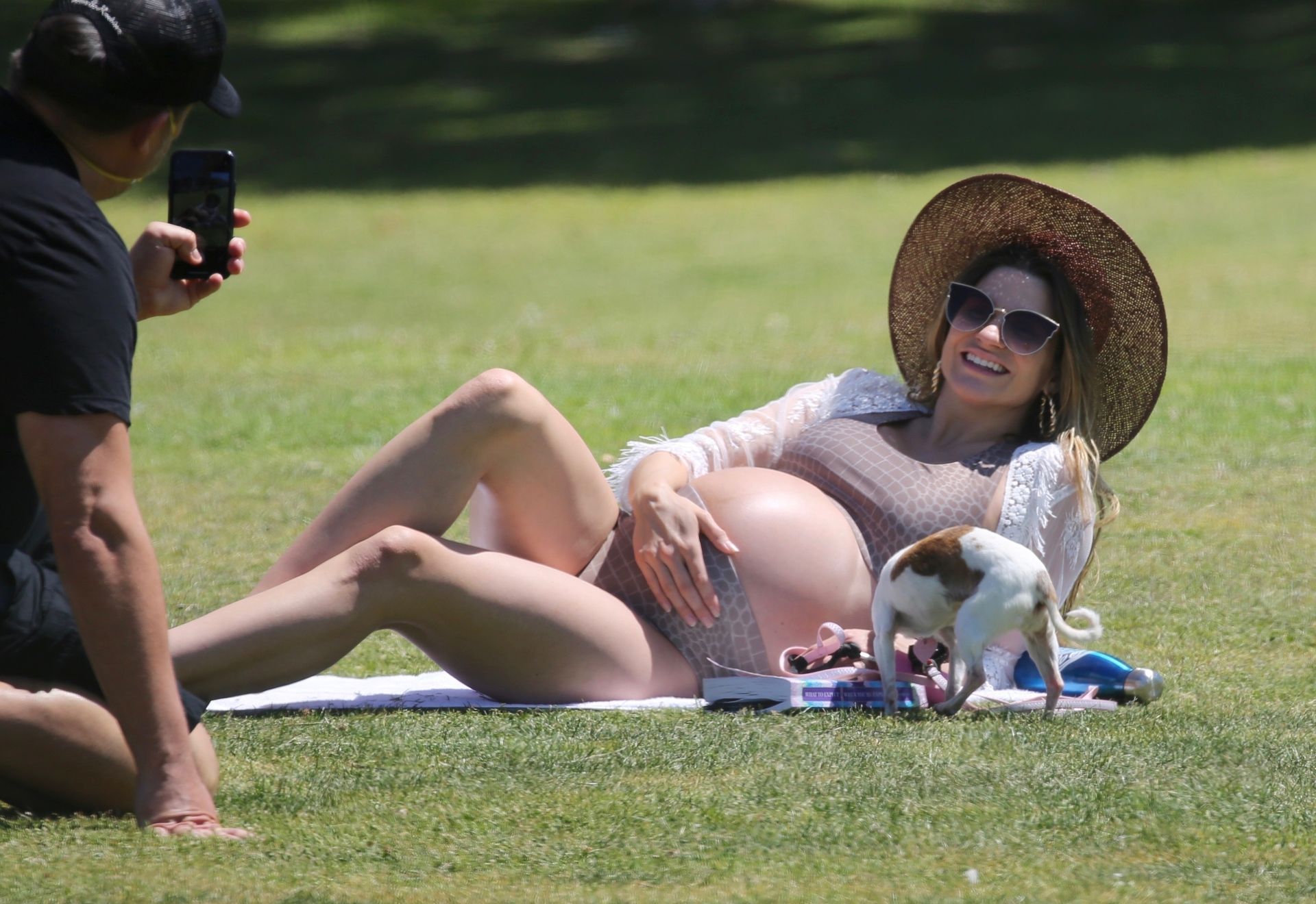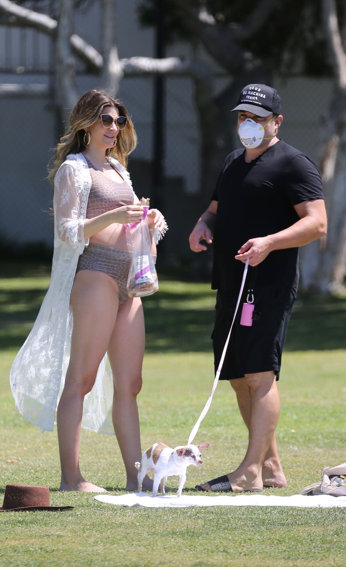 La futura madre fue vista en un parque abierto cerca de la playa con un bikini. El bikini con estampado de serpiente se combinó con una bata blanca para el sol, un sombrero marrón y la infame mascarilla N95. Se la vio con su esposo Rick Shirmer tomando el sol, jugando con su cachorro y leyendo un libro sobre el embarazo.