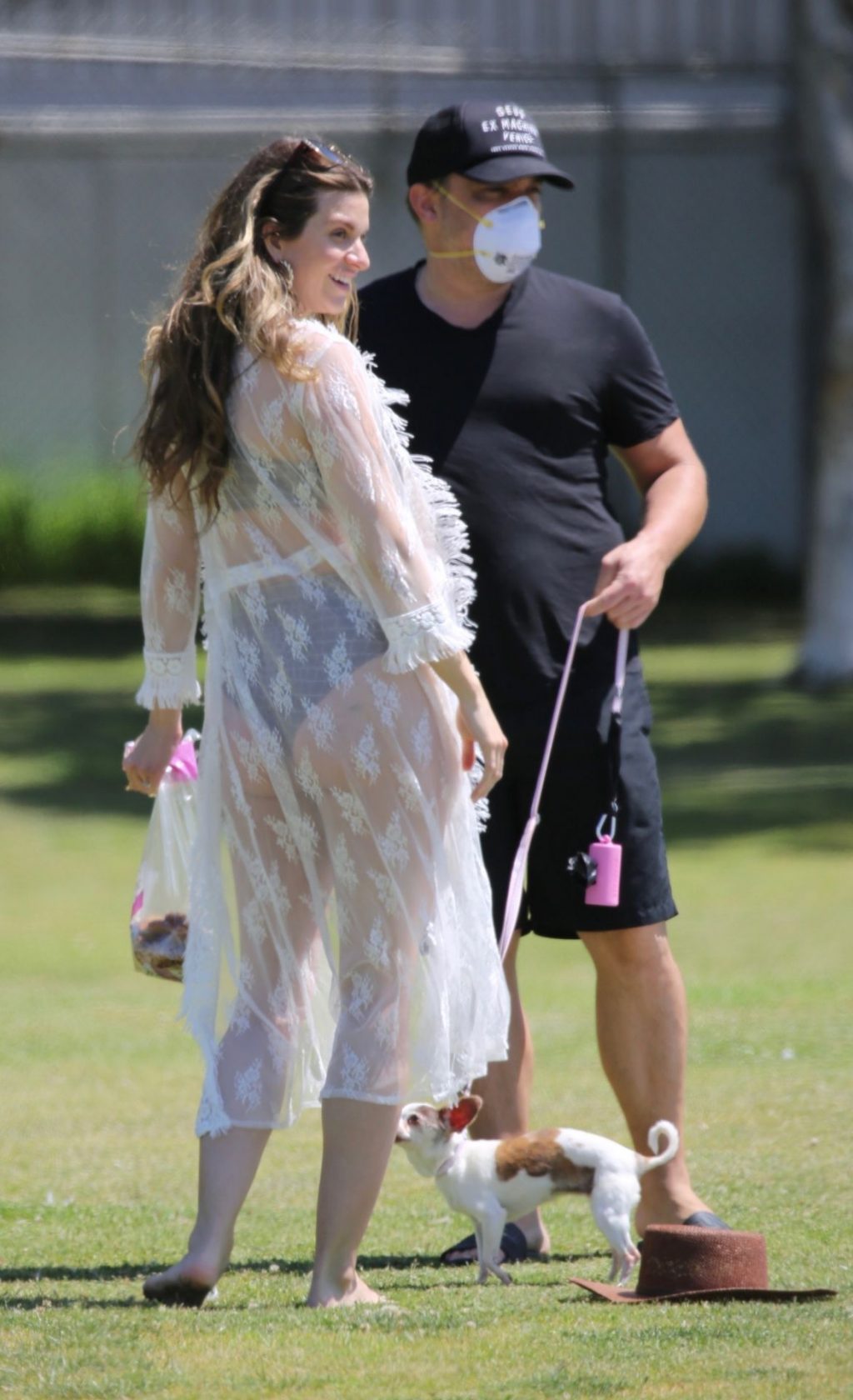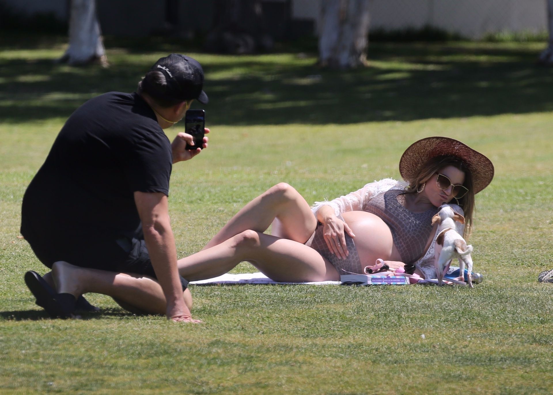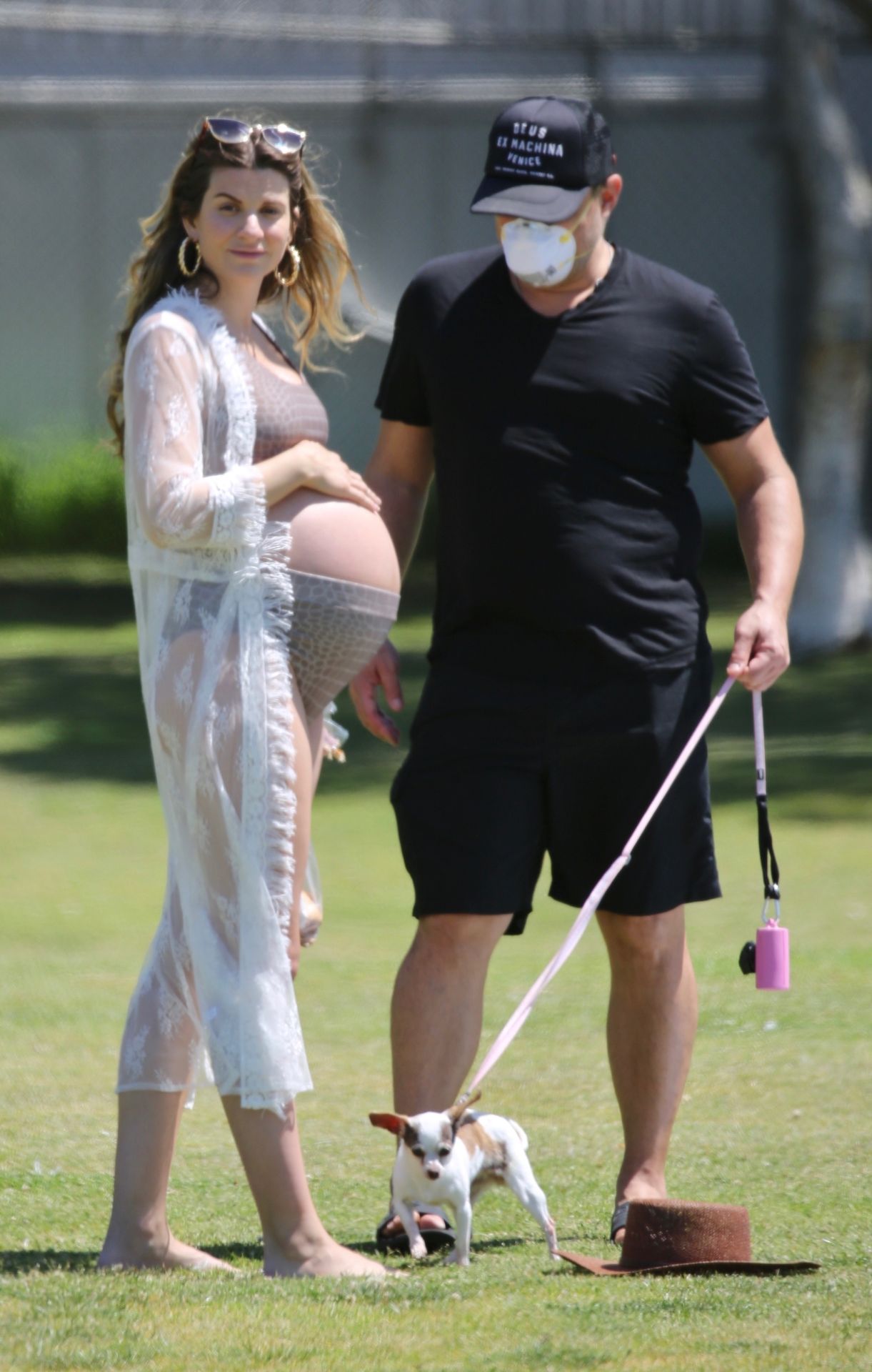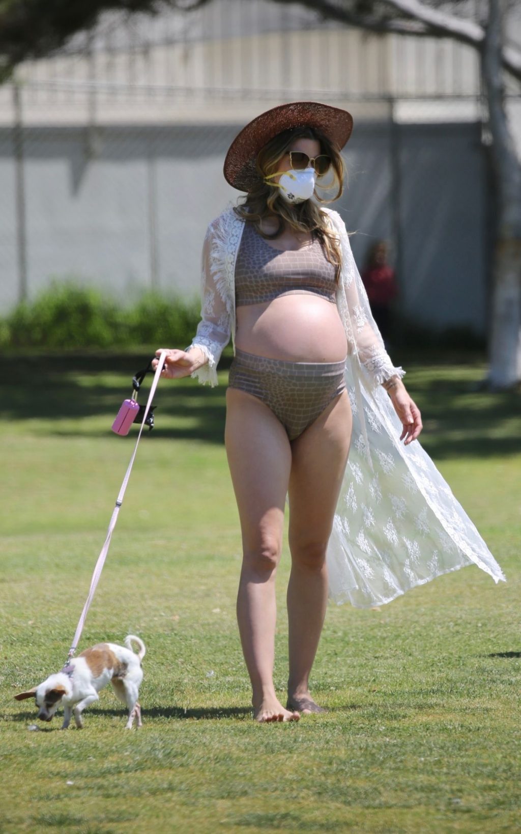 La futura madre fue vista en un parque abierto cerca de la playa con un bikini. El bikini con estampado de serpiente se combinó con una bata blanca para el sol, un sombrero marrón y la infame mascarilla N95. Se la vio con su esposo Rick Shirmer tomando el sol, jugando con su cachorro y leyendo un libro sobre el embarazo.