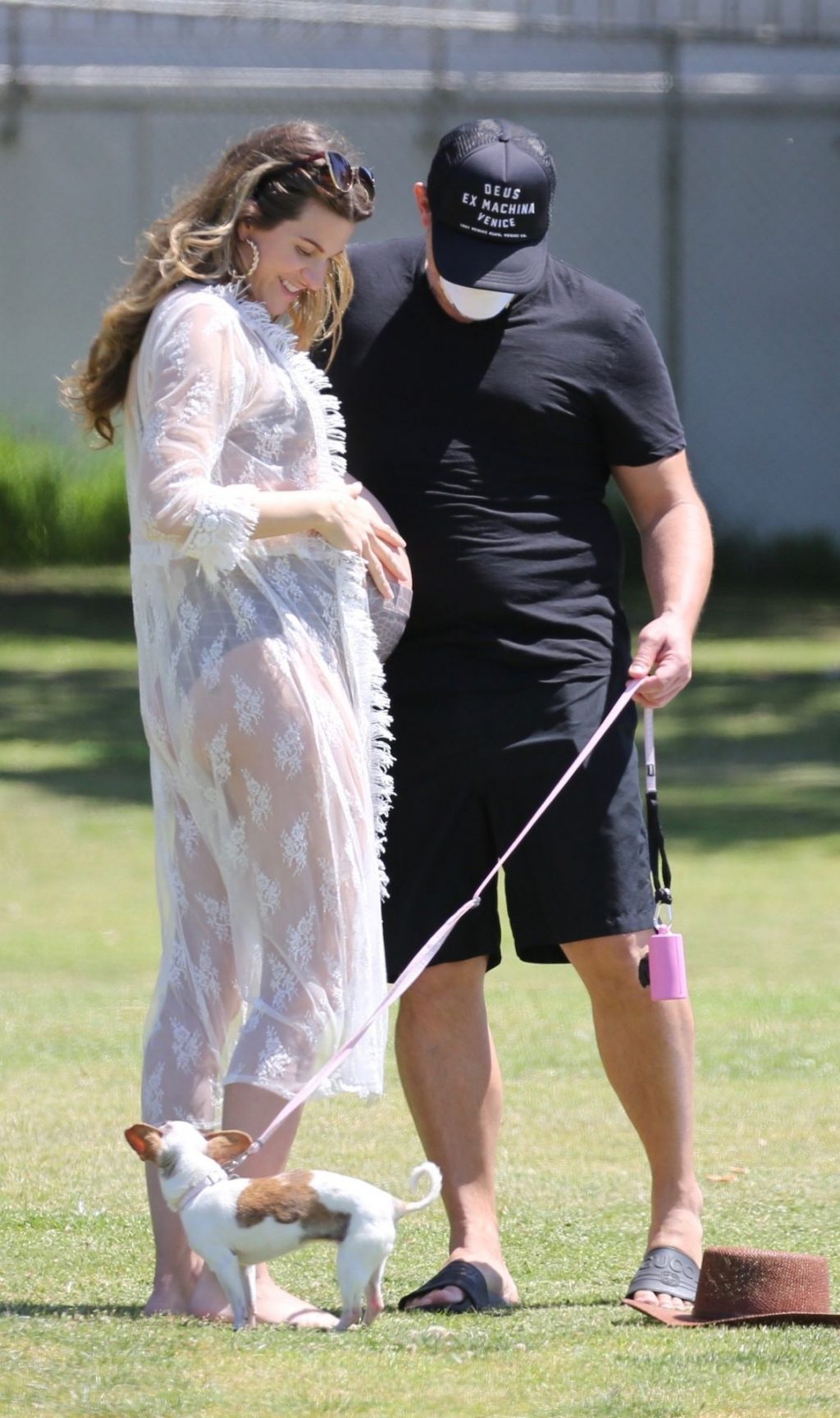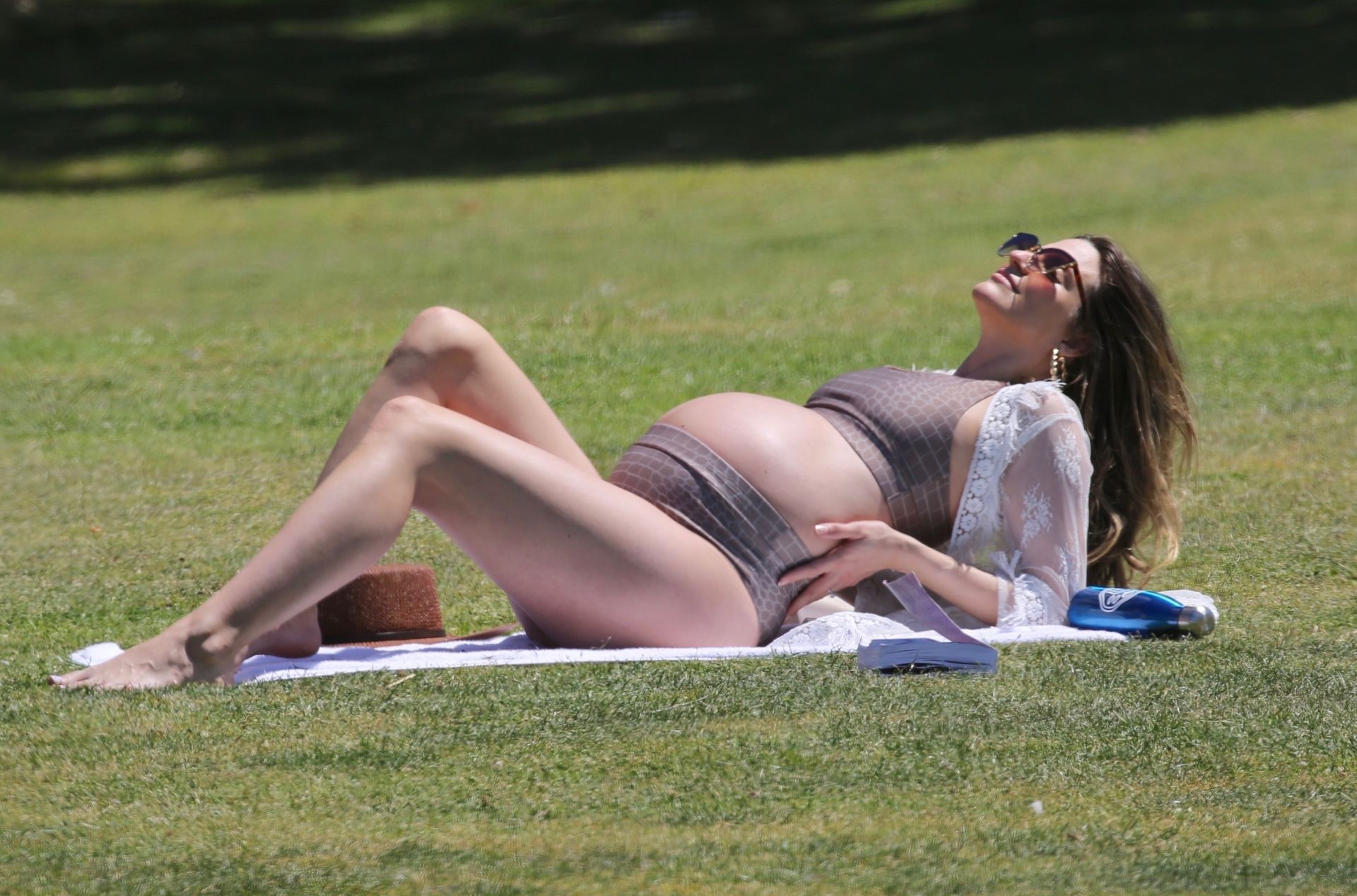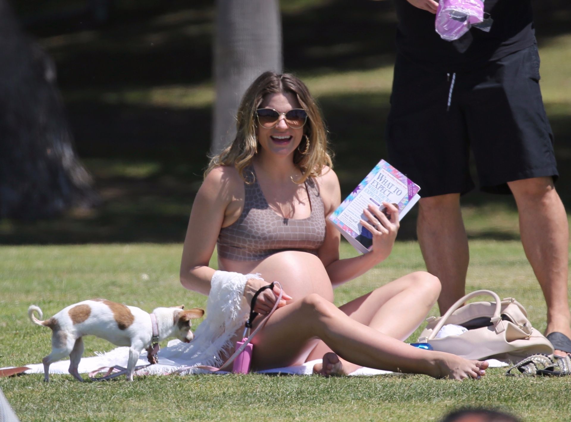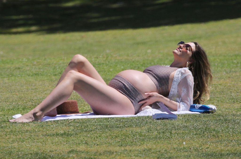 La futura madre fue vista en un parque abierto cerca de la playa con un bikini. El bikini con estampado de serpiente se combinó con una bata blanca para el sol, un sombrero marrón y la infame mascarilla N95. Se la vio con su esposo Rick Shirmer tomando el sol, jugando con su cachorro y leyendo un libro sobre el embarazo.