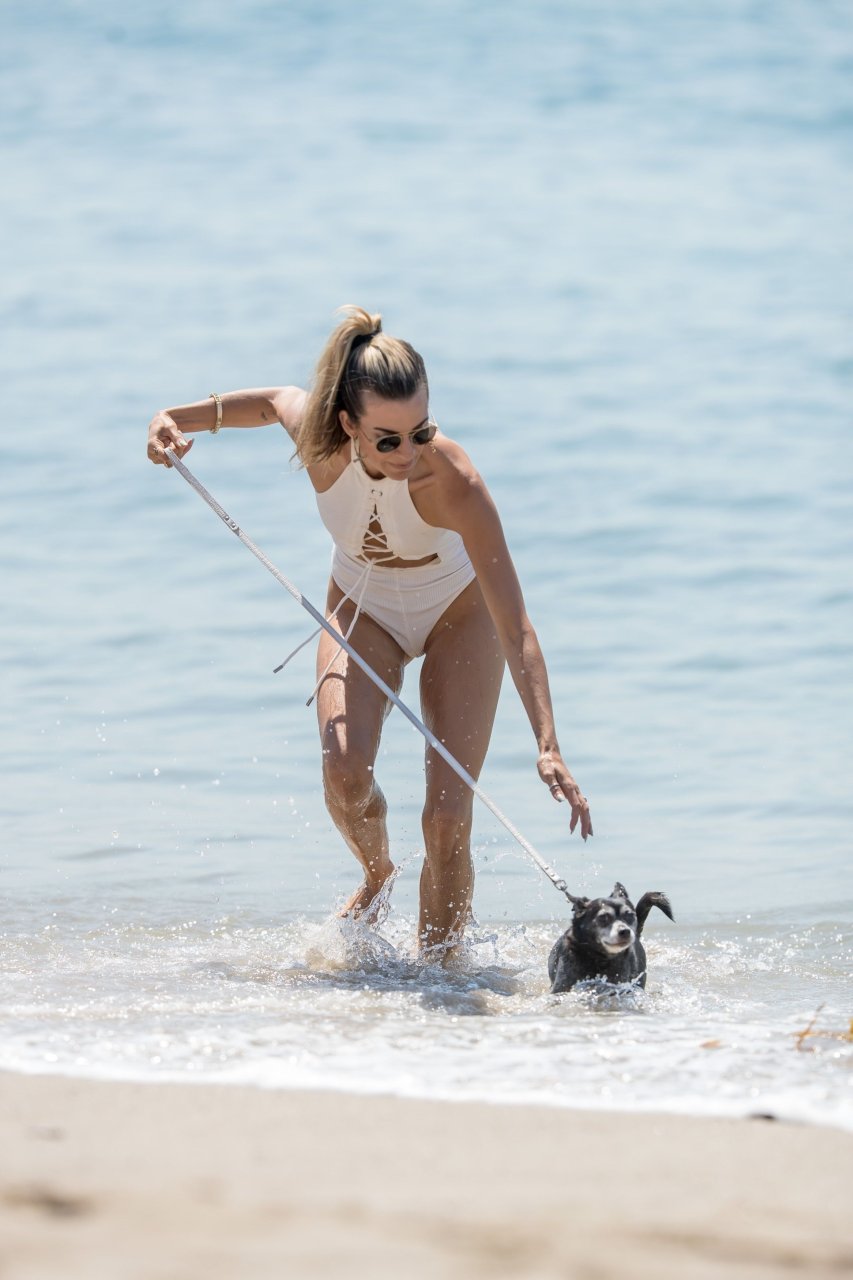 La rubia Rachel McCord se refrescó en el océano mientras estaba en Malibu con Rick Schirmer y su perro. Estaba feliz en el soleado Malibu después de una larga semana de trabajo, 03/08/2018.
