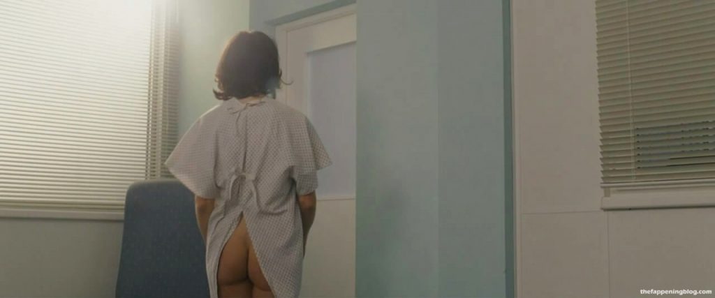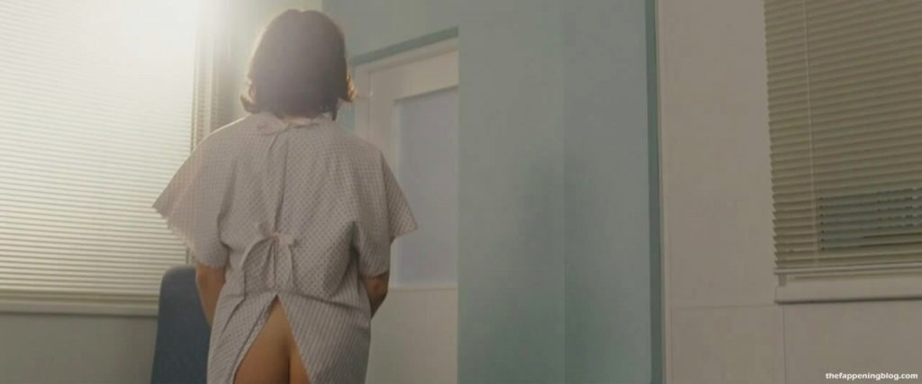 Rachel lleva una bata de hospital que no cubre su trasero, dándonos una vista de su parte trasera cuando se da la vuelta y sale de una habitación.