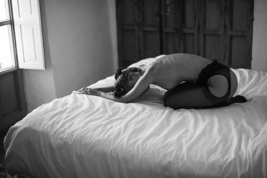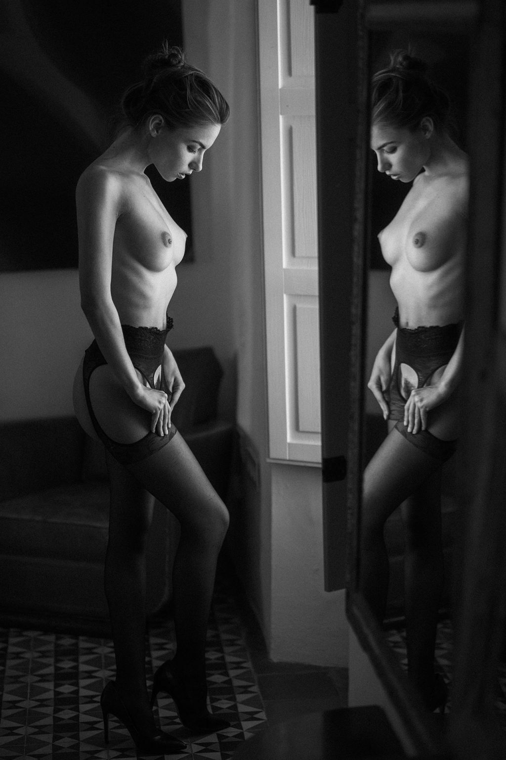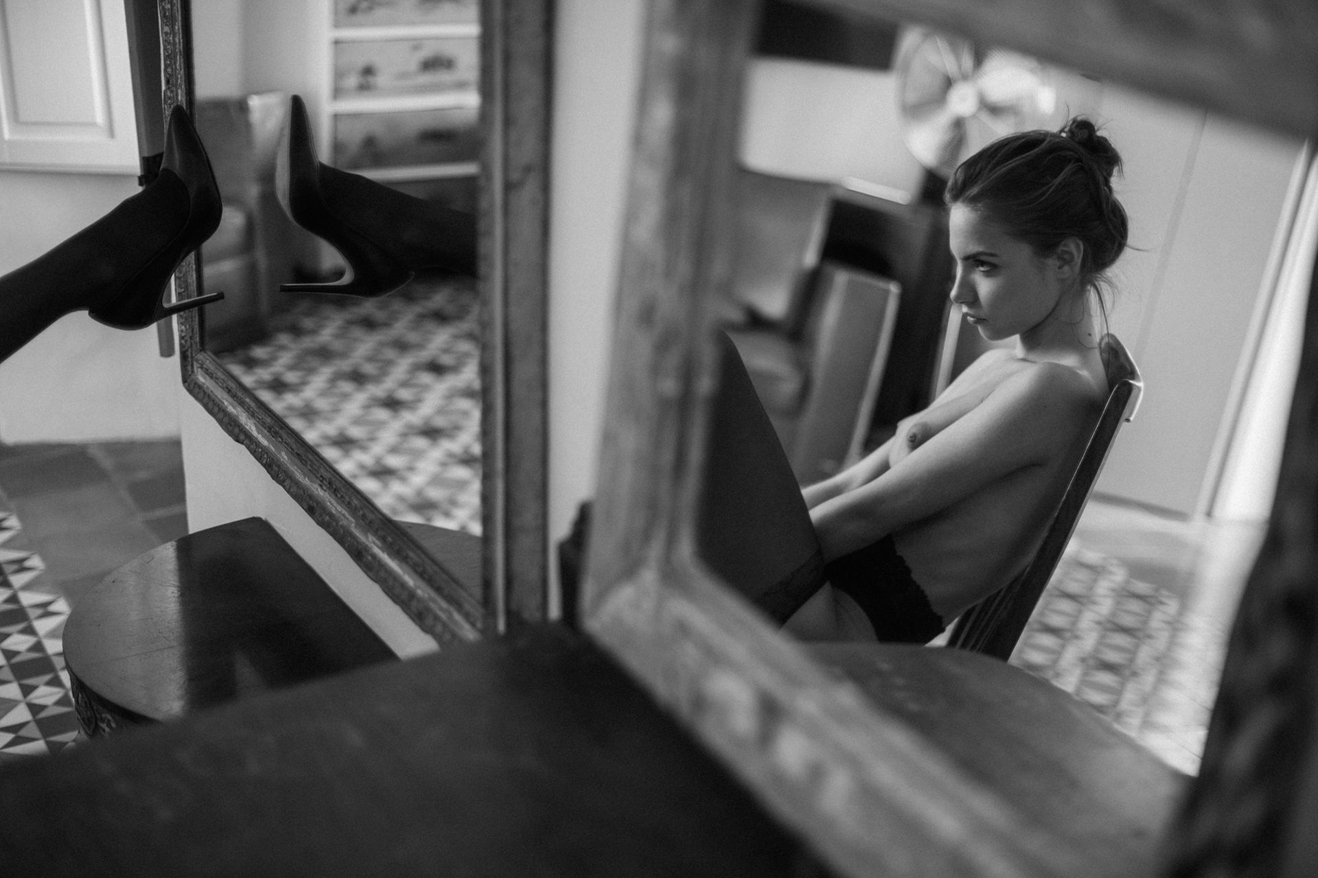 La modelo francesa Rebecca Bagnol muestra sus pechos perfectos y un vello púbico en una sesión de fotos en blanco y negro “Mirror” por Sacha Leyendecker (2019).