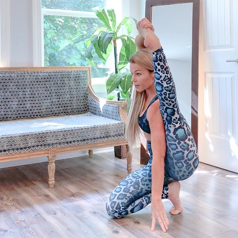 Rebecca Leigh está haciendo yoga antes de su derrame cerebral. Ver historia de SWNS SWNYstroke; Una joven que sufrió un derrame cerebral masivo causado por el YOGA valientemente volvió a su esterilla solo un mes después. Rebecca Leigh, de 40 años, estaba realizando una parada de cabeza yoguica cuando se rompió un vaso sanguíneo importante en el cuello.