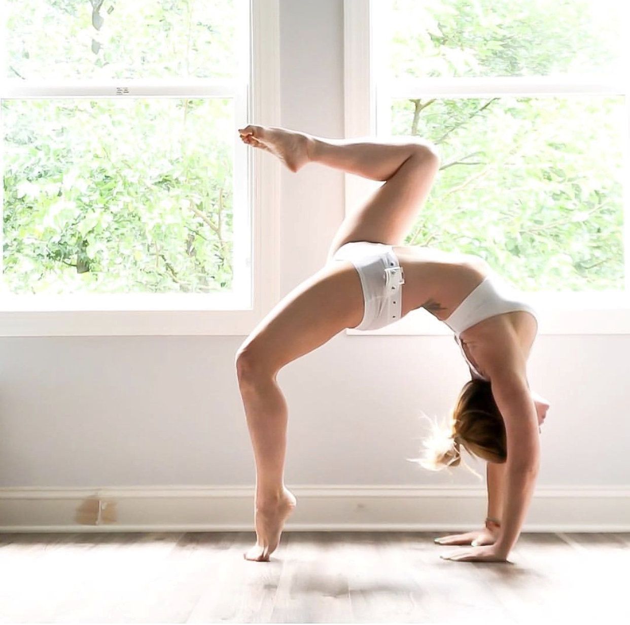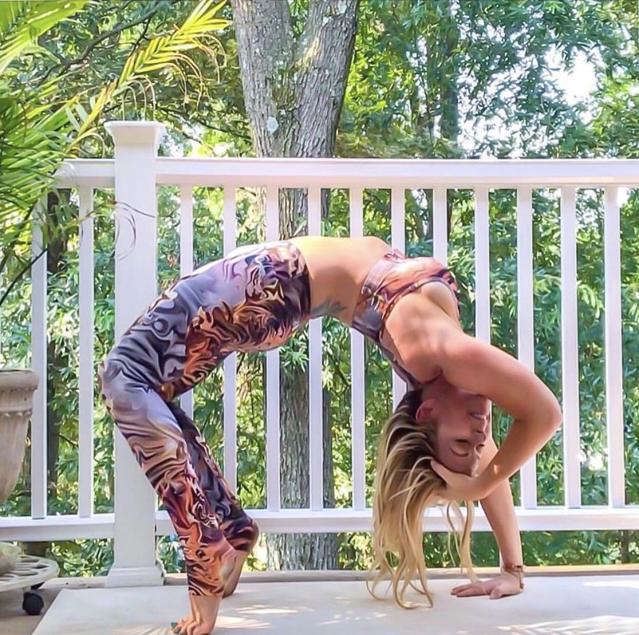 Rebecca Leigh está haciendo yoga antes de su derrame cerebral. Ver historia de SWNS SWNYstroke; Una joven que sufrió un derrame cerebral masivo causado por el YOGA valientemente volvió a su esterilla solo un mes después. Rebecca Leigh, de 40 años, estaba realizando una parada de cabeza yoguica cuando se rompió un vaso sanguíneo importante en el cuello.
