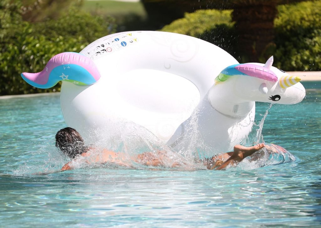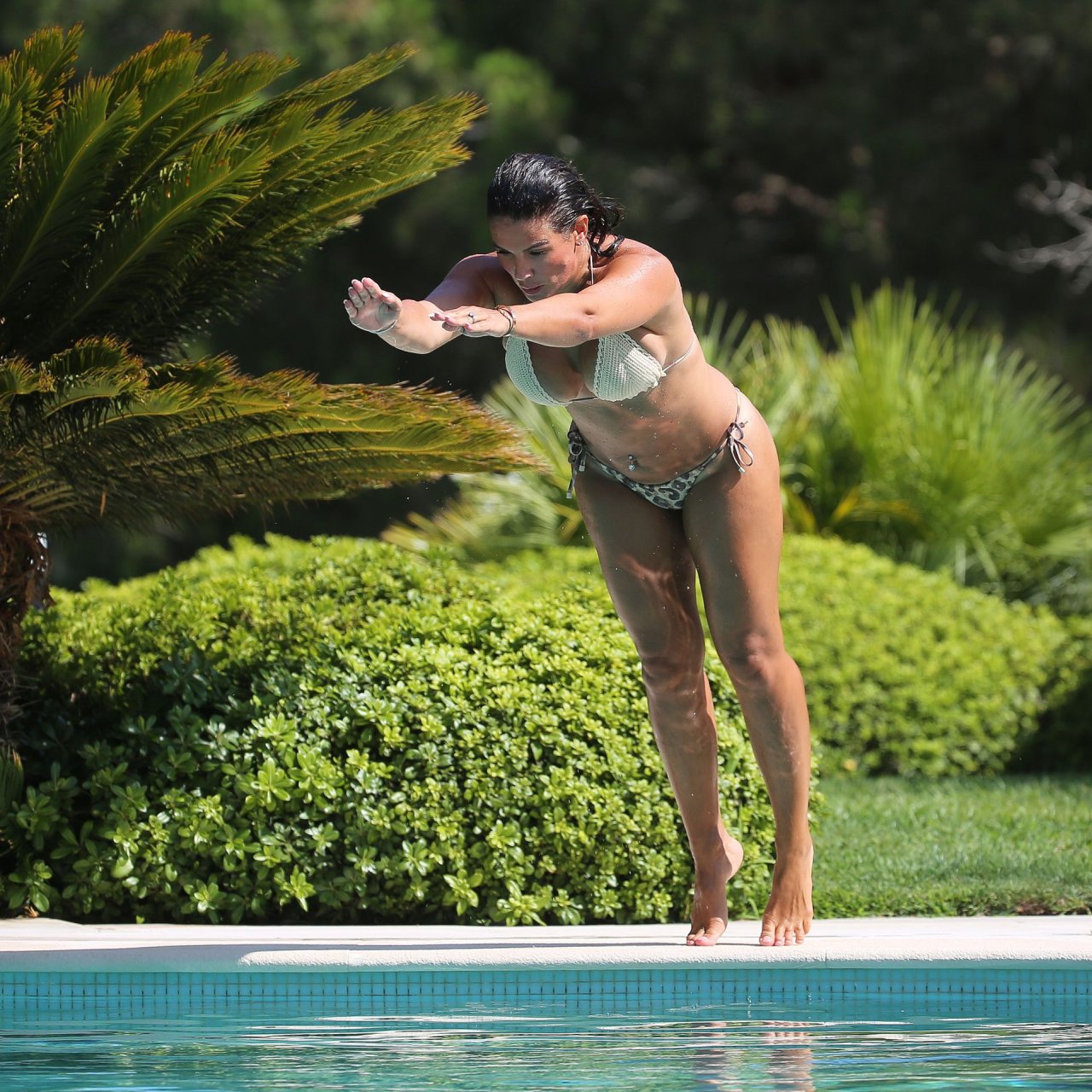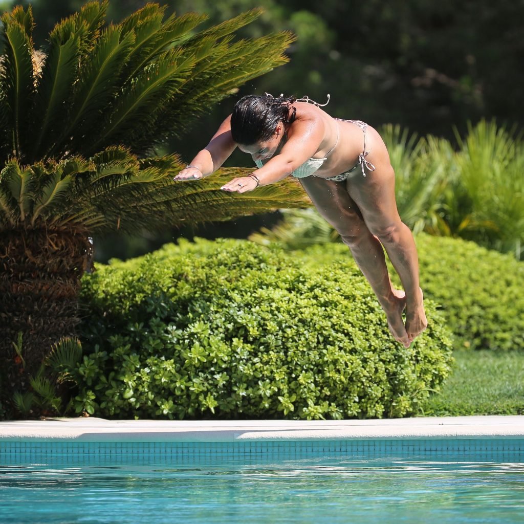 La esposa de Jamie Vardy, la voluptuosa estrella de la televisión reality Rebekah Vardy (Nicholson), se divierte en la piscina durante sus vacaciones en Portugal, 29/08/2018.