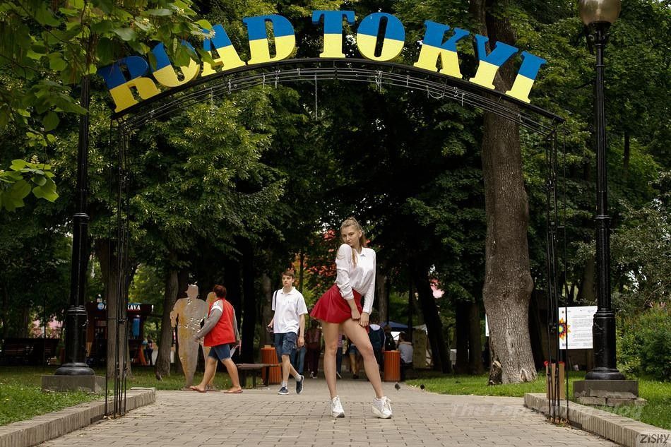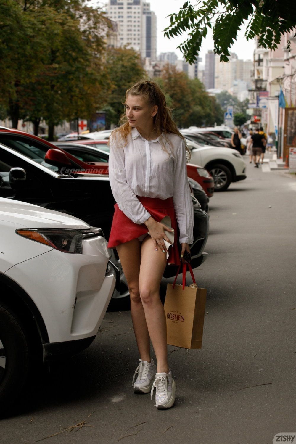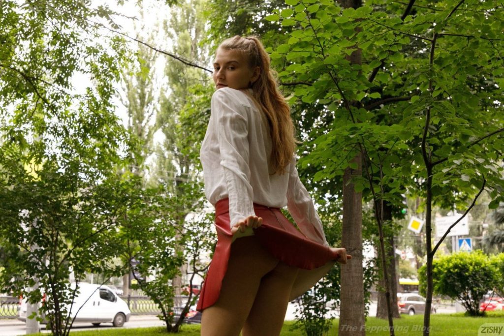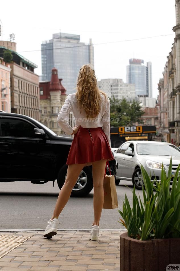 La modelo voluptuosa Regan Budimir lleva una blusa blanca y una falda roja mientras muestra escote y ropa interior para el fotógrafo de Zishy en un parque público de Kyiv, Ucrania (2021). Camina por la calle y se ducha en el hotel, ¡mostrándonos sus grandes pechos naturales!