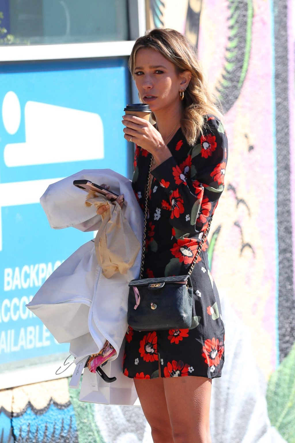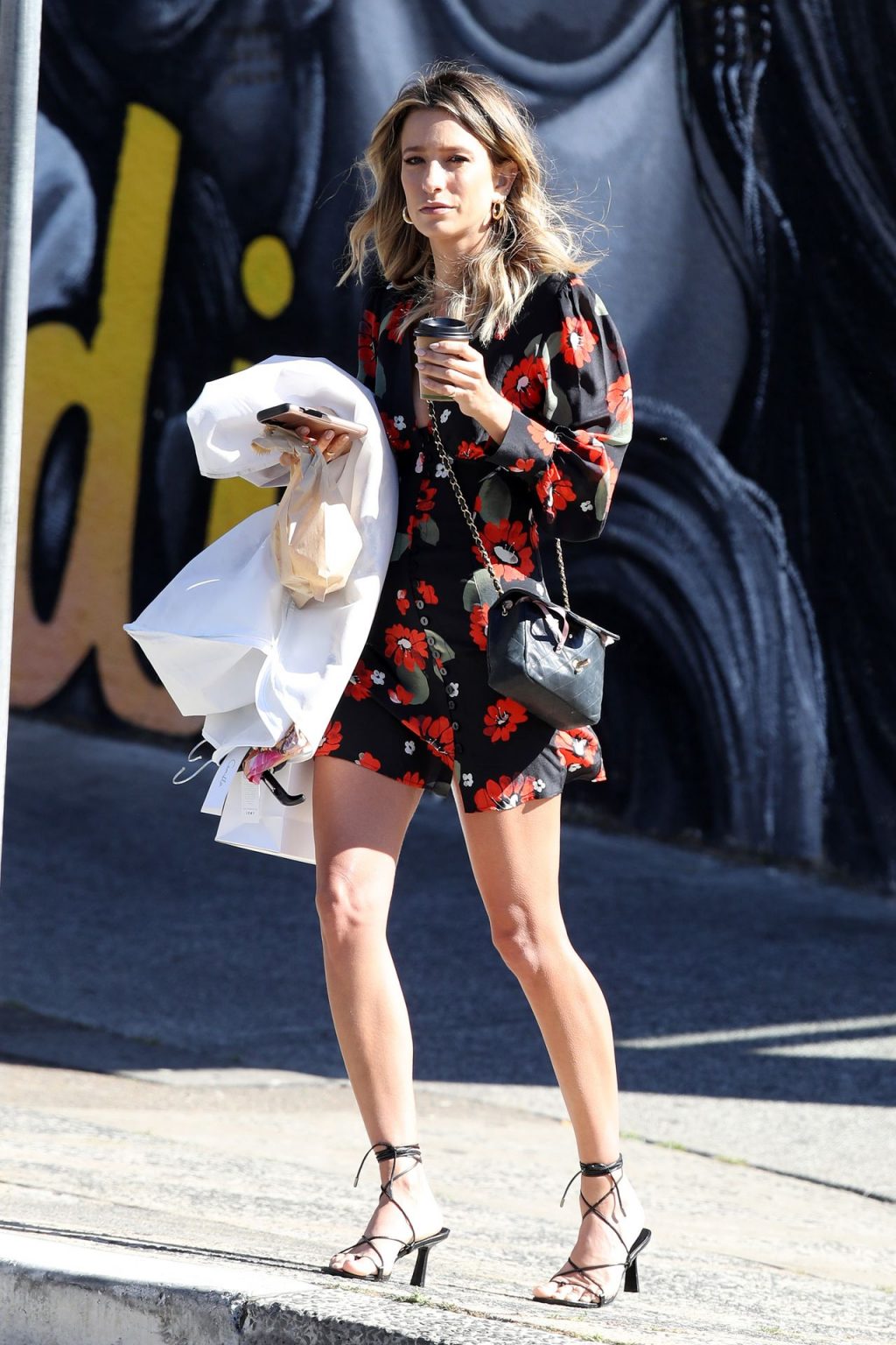 Leggy reportera de entretenimiento de Extra TV australiana Renée Bargh fue fotografiada atrayendo la atención de algunos hombres mientras tomaba café en Bondi, 11/10/2019.
