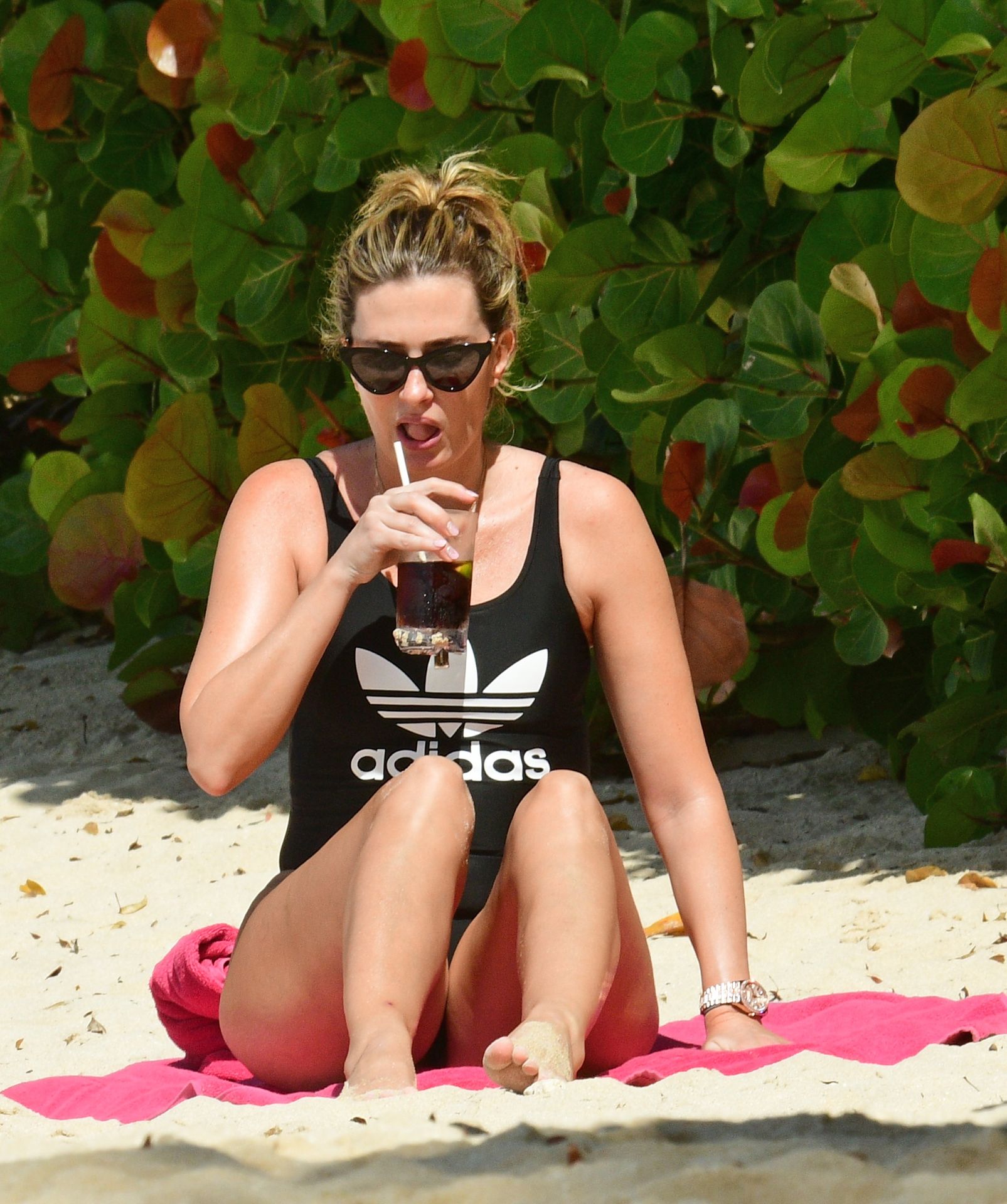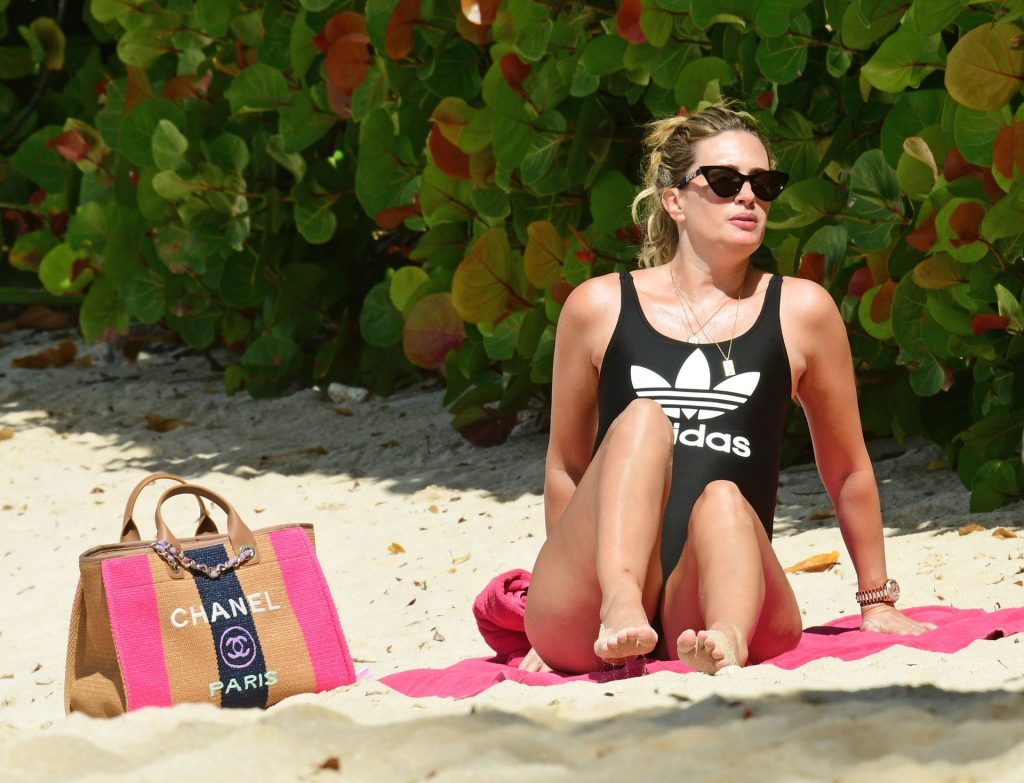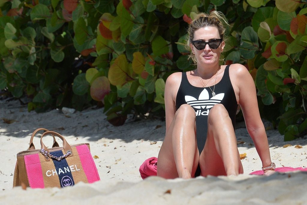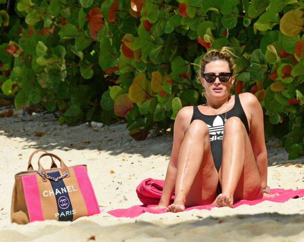Esposa del actor estadounidense Mark Wahlberg, la modelo de 41 años Rhea Durham luce increíble mostrando sus curvas sensacionales con su traje de baño negro, fotografiada disfrutando de las vacaciones de invierno en la playa de Barbados, 30/12/2019.