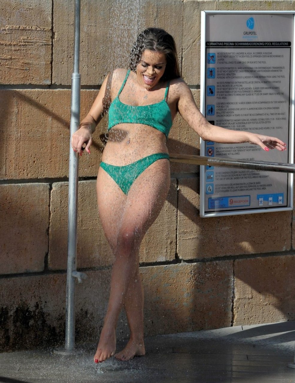 “Ex On The Beach” S9 Rhianne Saxby ofrece una exhibición impresionante mientras lucha por contener sus pechos y trasero en un bikini verde durante una escapada a España – Palma, 01/11/2019.